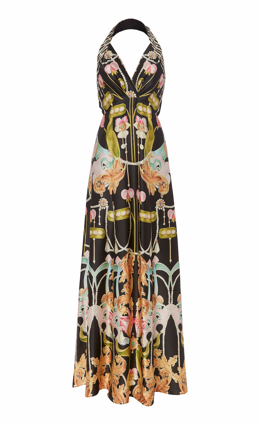 Exuding a majestic air, the Akira eveningwear story is made from a luxurious hammered silk satin, with a patina texture, sumptuous drape and burnished fluidity of movement. Painstakingly hand-painted, composed into a surreal fresco-style artwork, featuring block colour segments and bold borders that bring a modernity to the regal smattering of jewels and pearls, filigree motifs and heraldic scrolls.