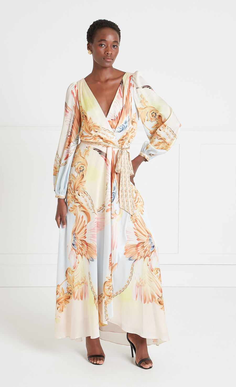 Exuding a majestic air, the Akira eveningwear story is made from a luxurious hammered silk satin, with a patina texture, sumptuous drape and burnished fluidity of movement. Painstakingly hand-painted, composed into a surreal fresco-style artwork, featuring block colour segments and bold borders that bring a modernity to the regal smattering of jewels and pearls, filigree motifs and heraldic scrolls.