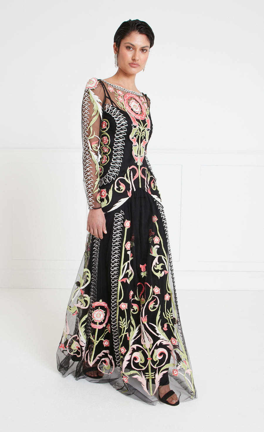 Offbeat yet regal, the Alessia story offers a stunning range of eveningwear pieces. Strong, timeless silhouettes provide a base for hand-guided sequin and stitchwork: Tudor rosebuds interweave harmoniously with calligraphic flourishes and Italian fresco-inspired filigree motifs, with elements reminiscent of Jacobean blackwork, reimagined in bold contrasting shades.