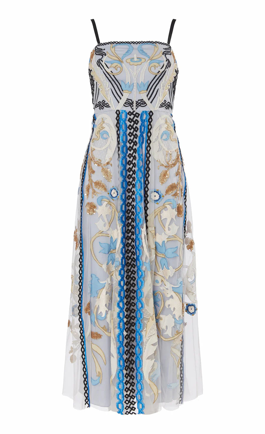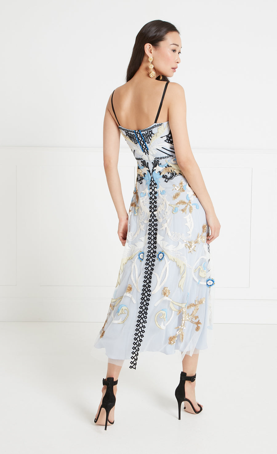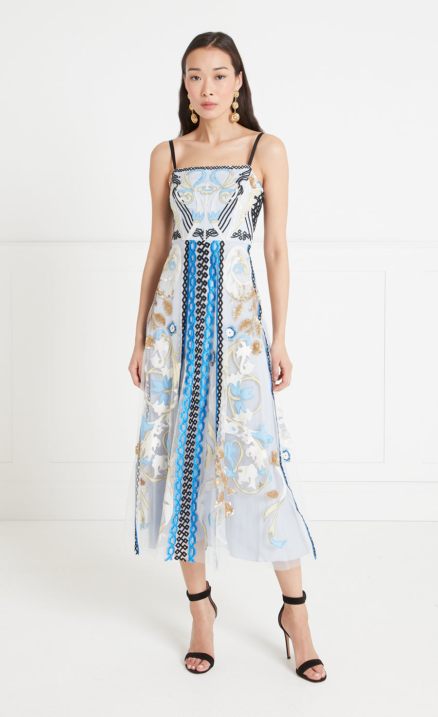 With a sharp, classical shape, the Alessia strappy dress cuts a strikingly elegant figure, with a neat square neckline, minimalist shoulder straps, cinched waist and layered mid-length skirt. Made from soft Italian tulle with fine hand-embroidered detailing, designed meticulously for the perfect fit, it feels playful and modern. Layer with the Alessia kimono for a truly stand-out look.