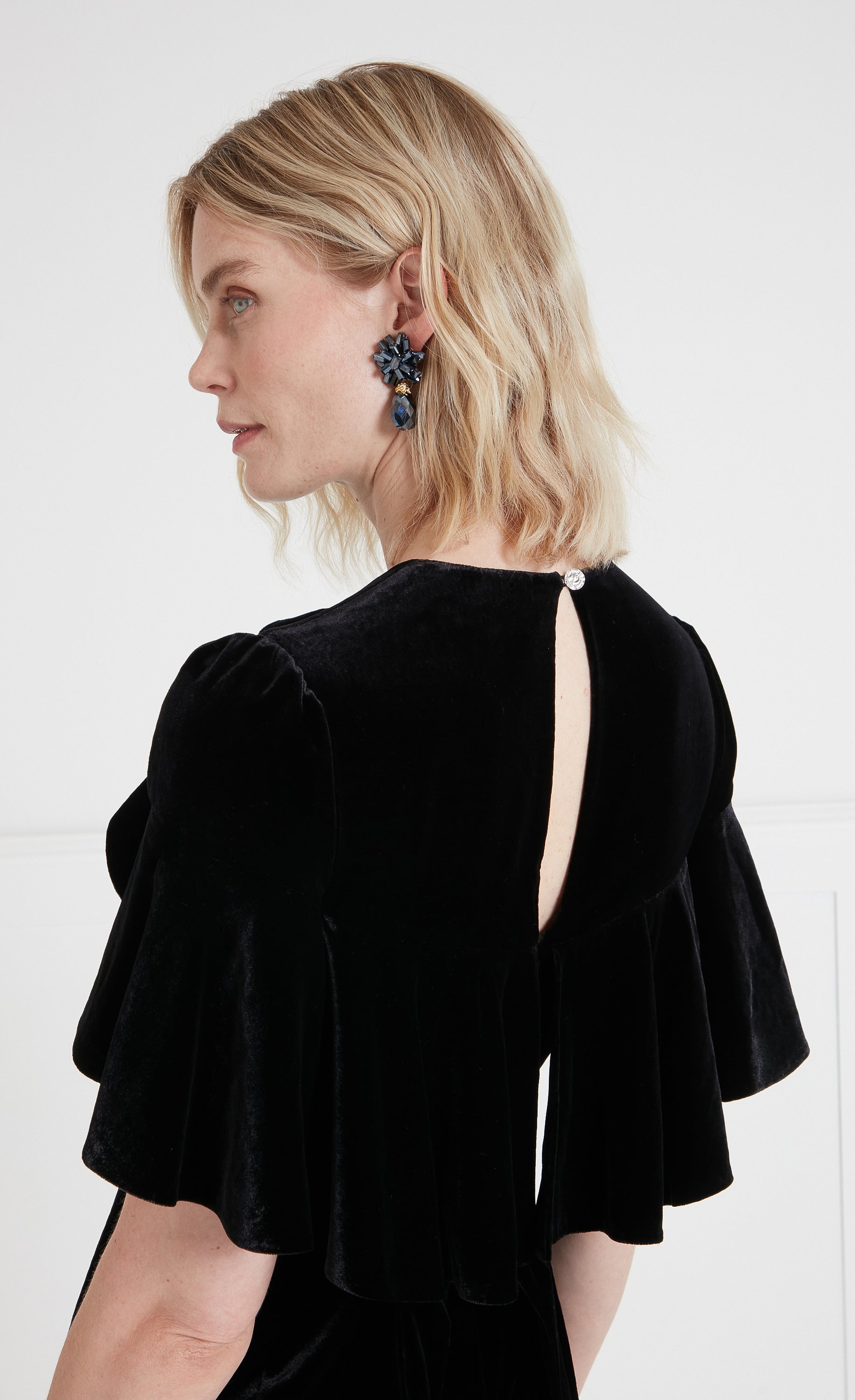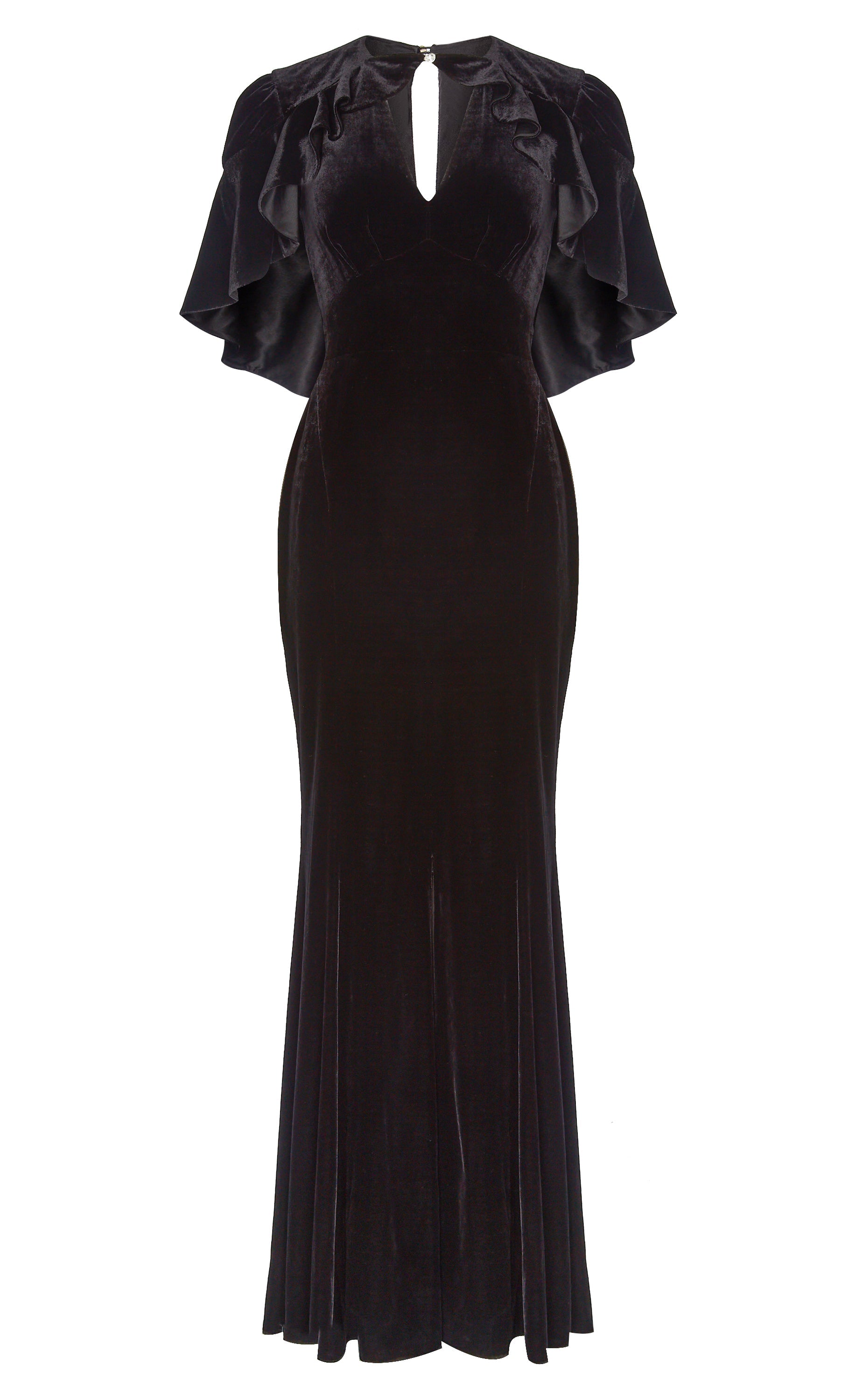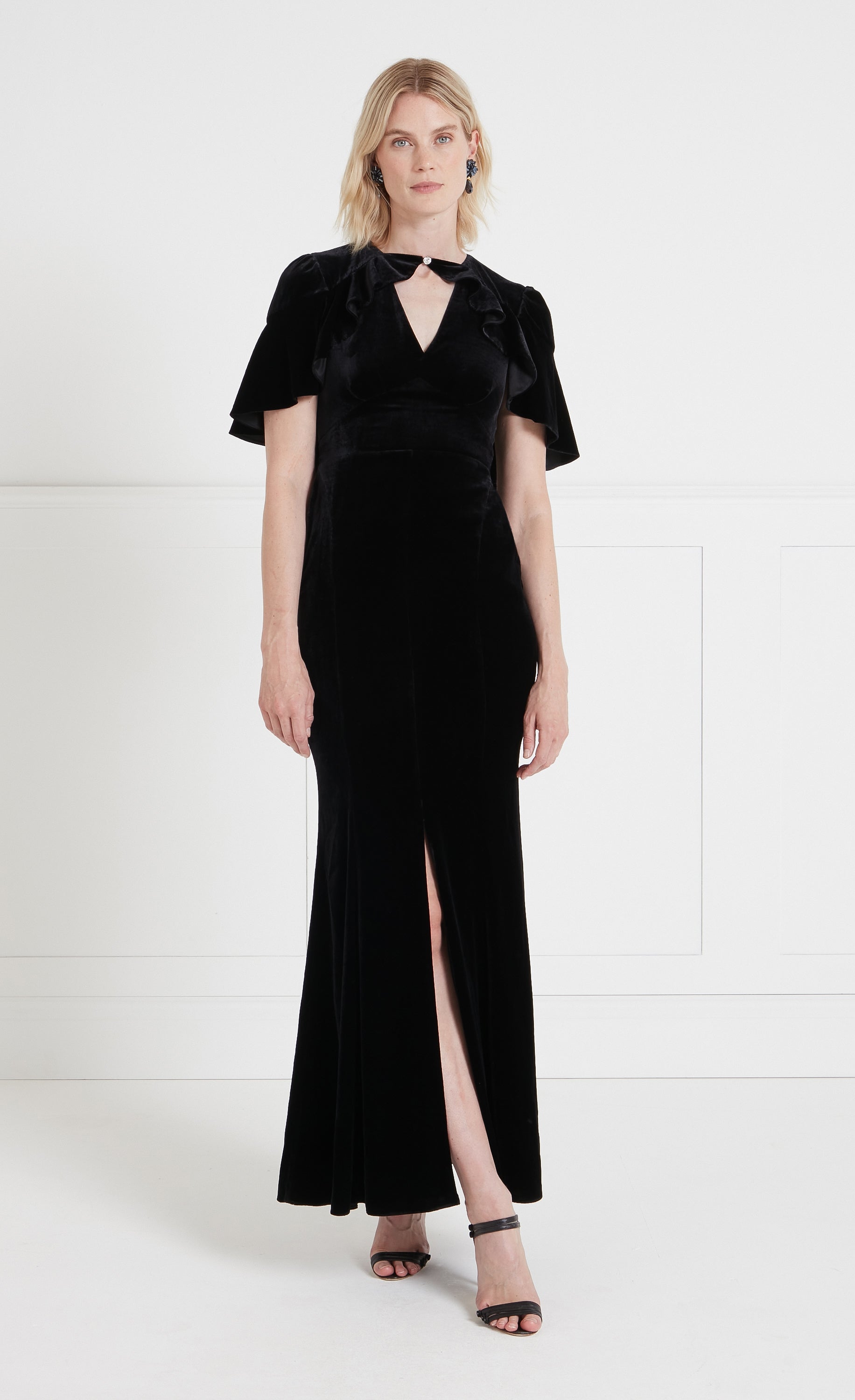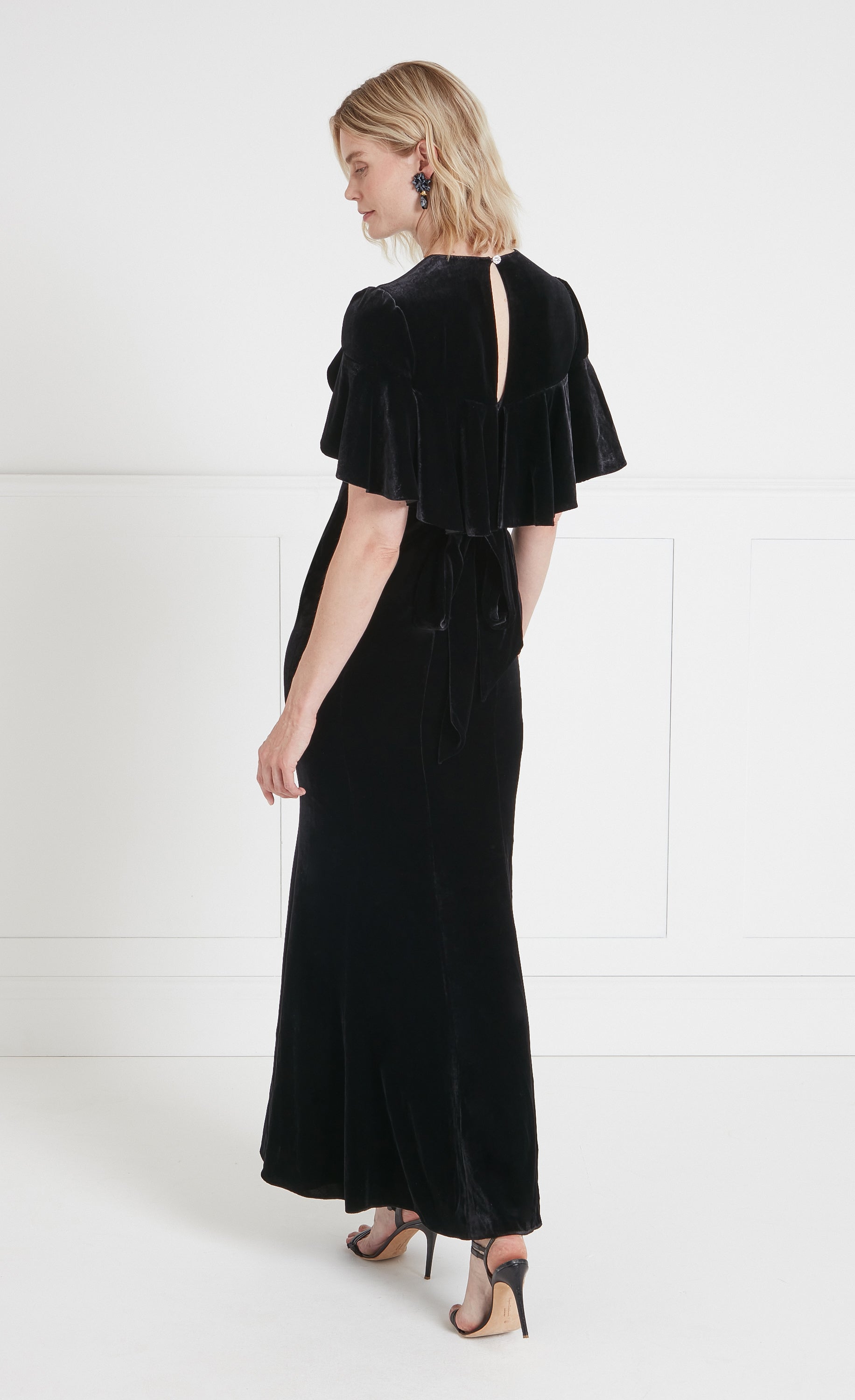 Polished yet playful, the Ashcombe dress brings a fluid dynamism to your party wardrobe, with ruffle sleeve detailing, flowing cape-like from the collarbones, creating a neat V-neck, the sculpted silhouette finishing at an ankle-length hem. A picture of convivial elegance, inspired by the escapist era.