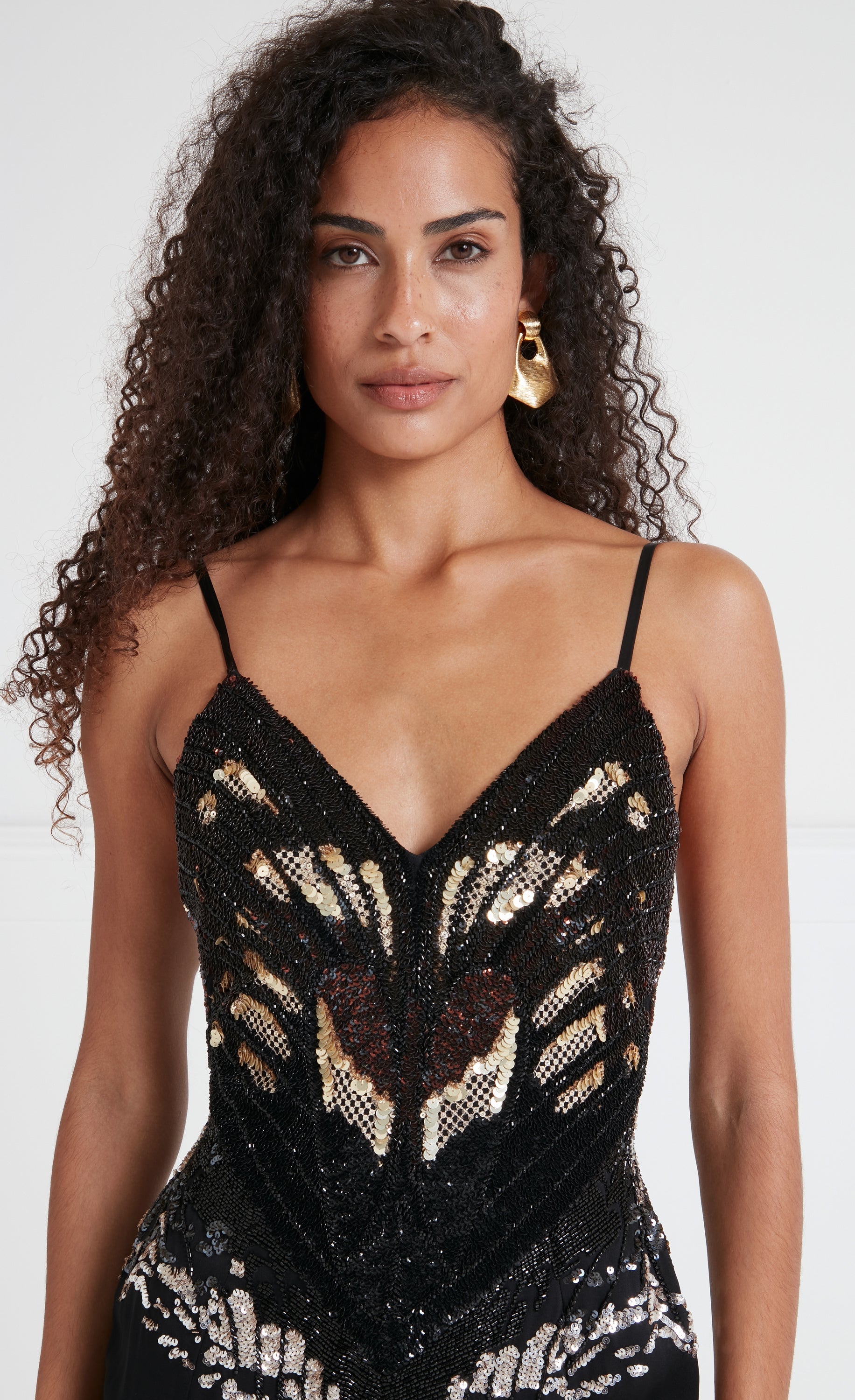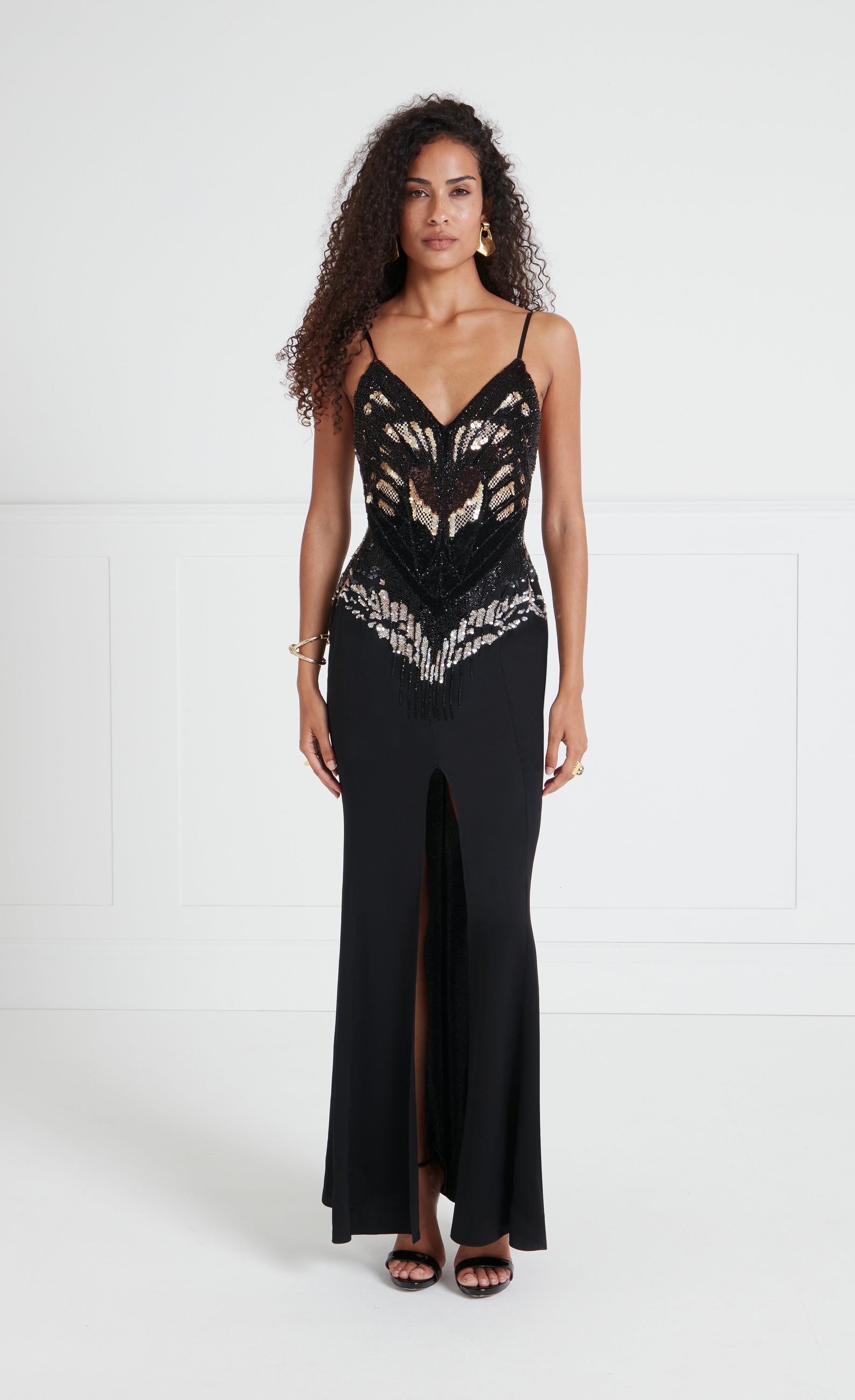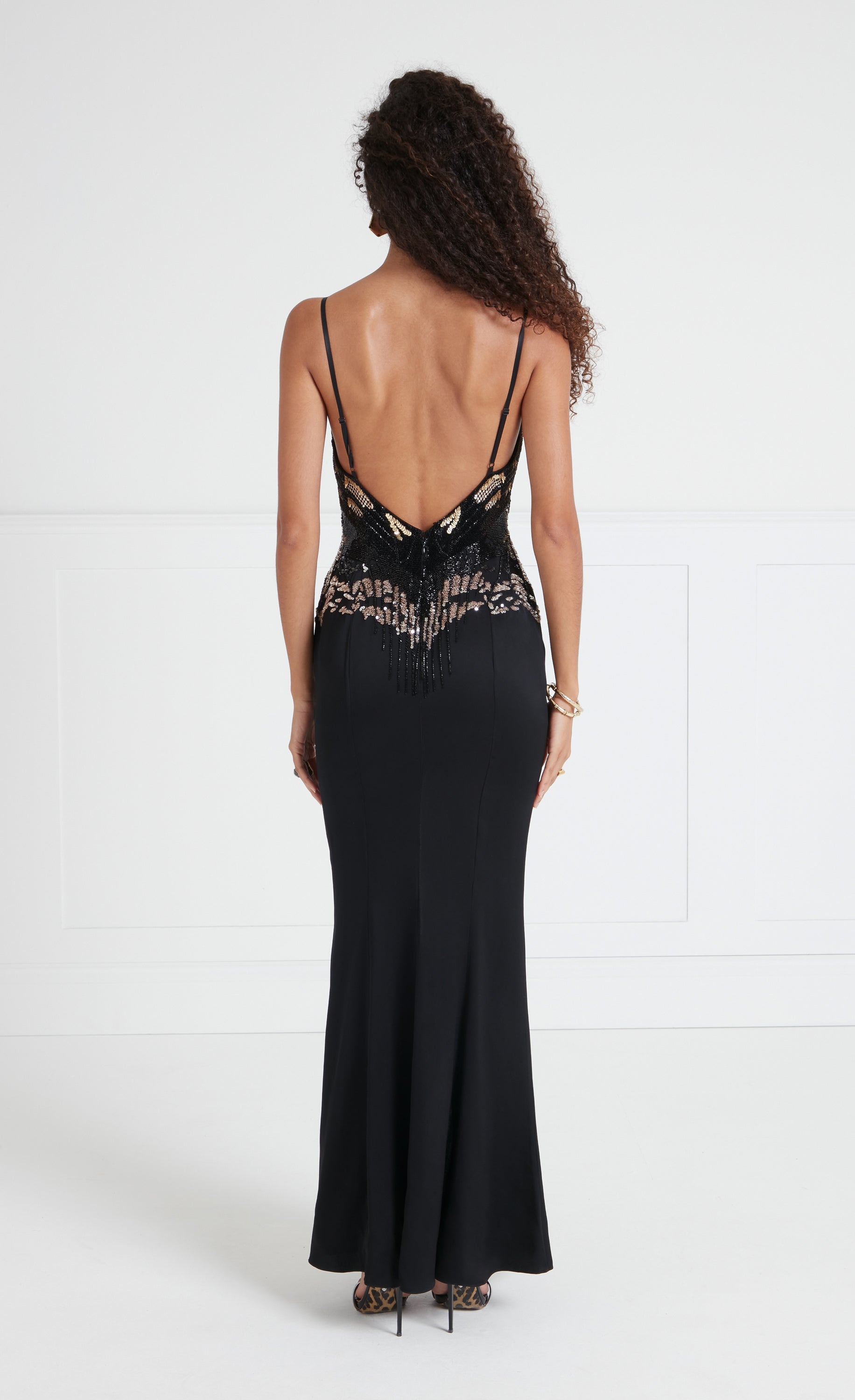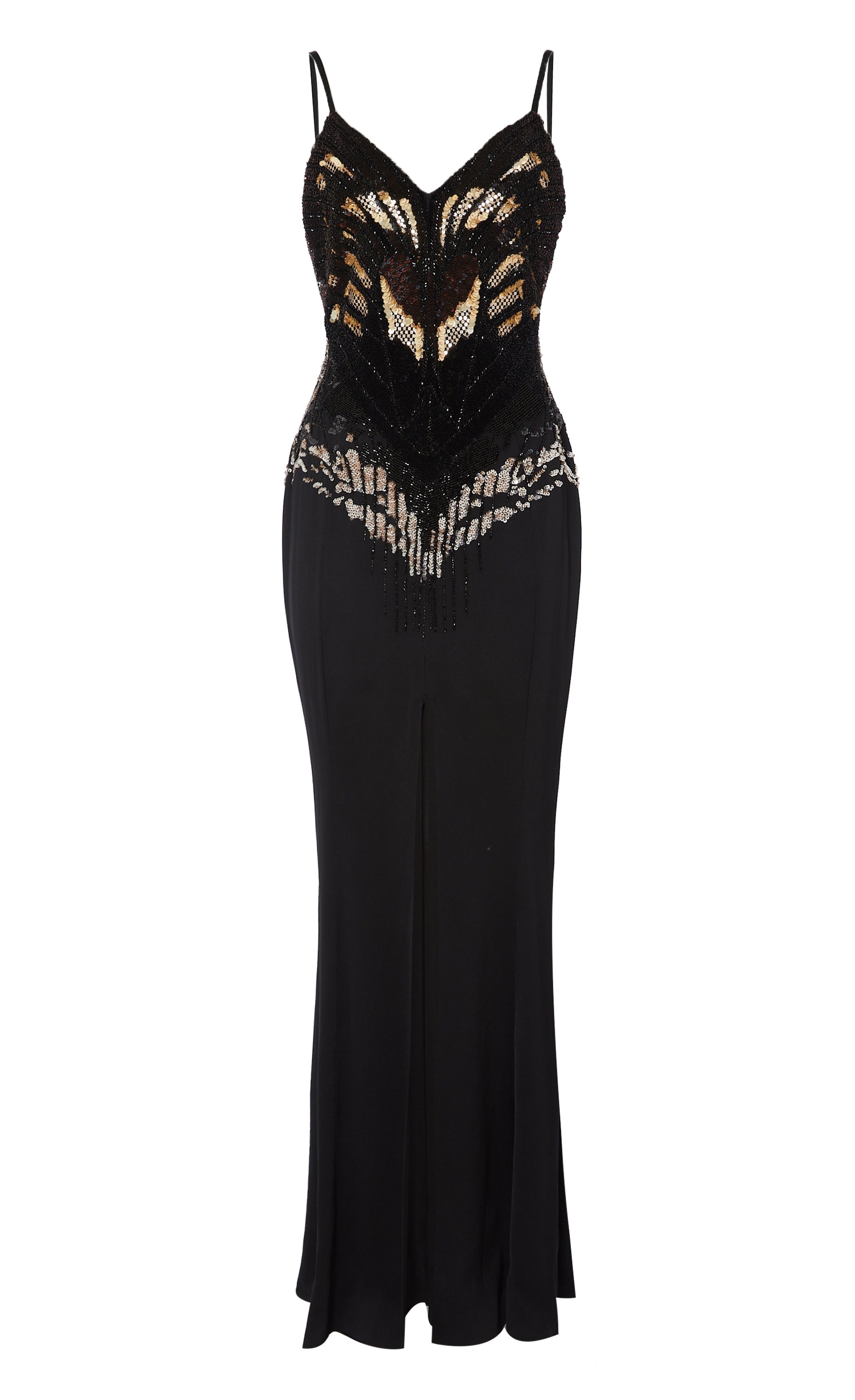 Strikingly naturalistic as realised through magnificent embellishment, the Atlas strappy dress brings a sense of drama. Designed to captivate, the dazzling degrade sequinned bodice accentuated by the clean lines of the slinky slip style, fitted at the waist and flowing to the open floor-length hem, with a leg slit for fluid movement.