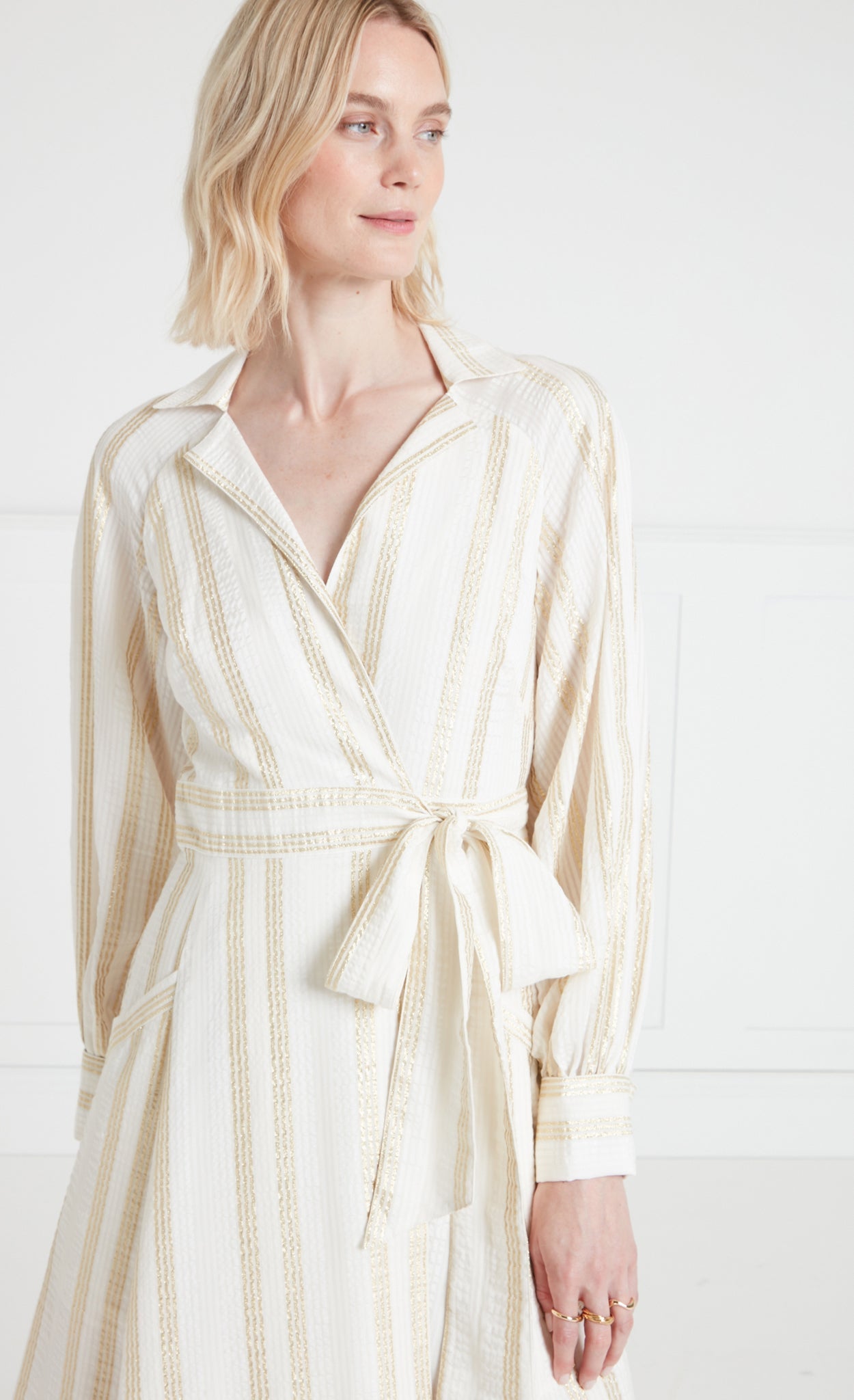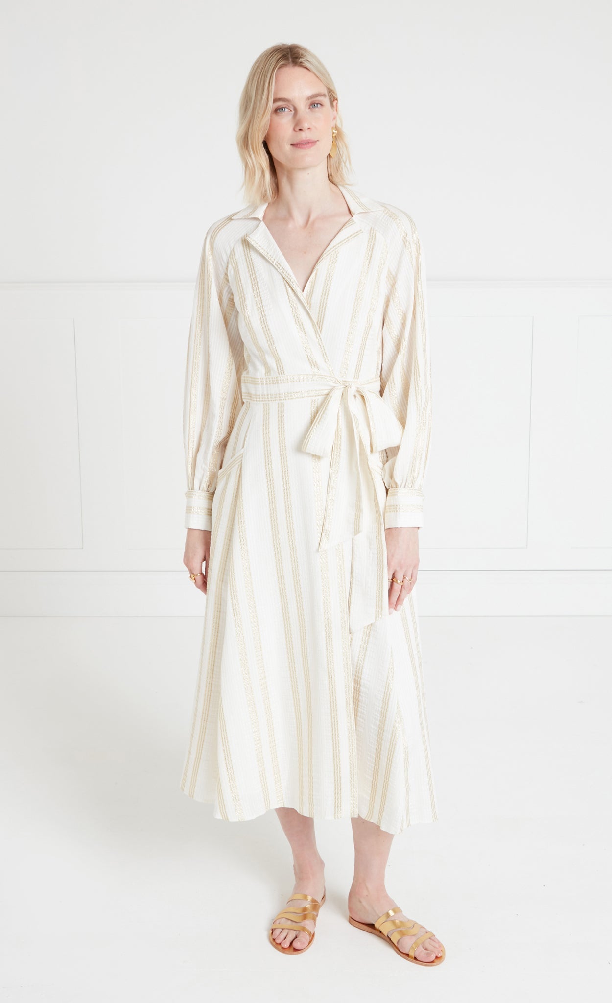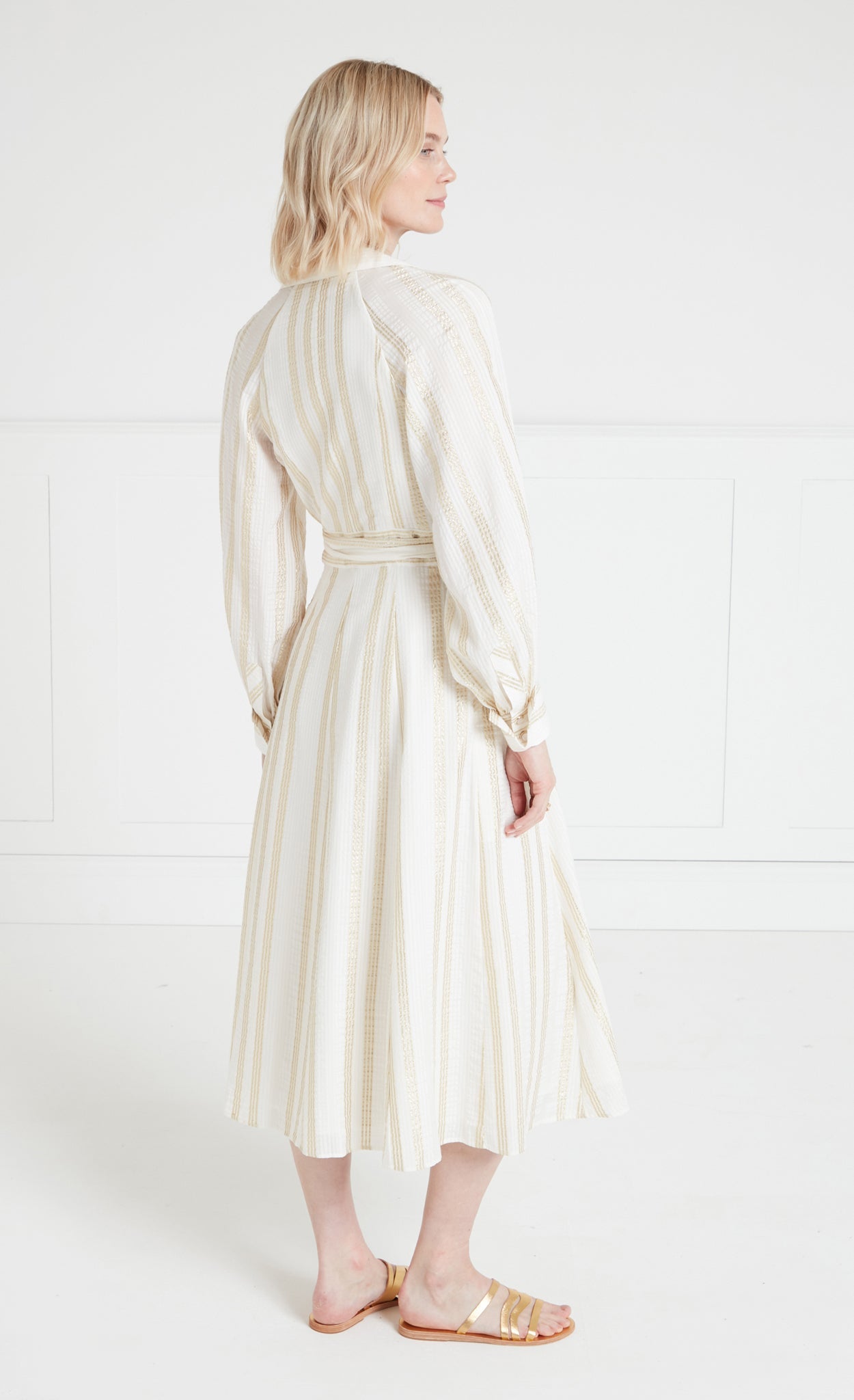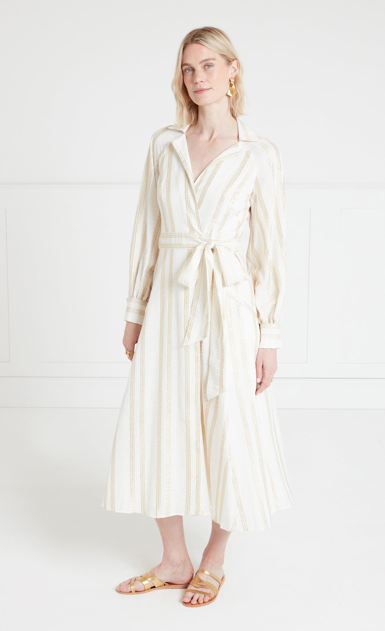 The material is a lightweight Italian cotton, weaved in a process known as fil coup¨¦, and enhanced with gold metallic stripes to compliment the silhouette.