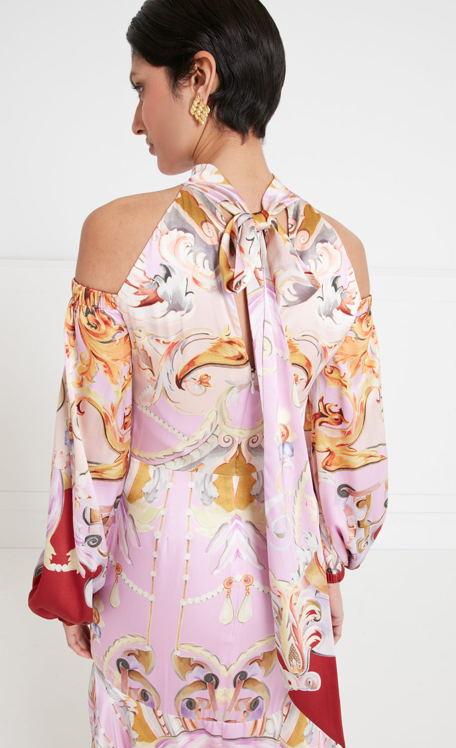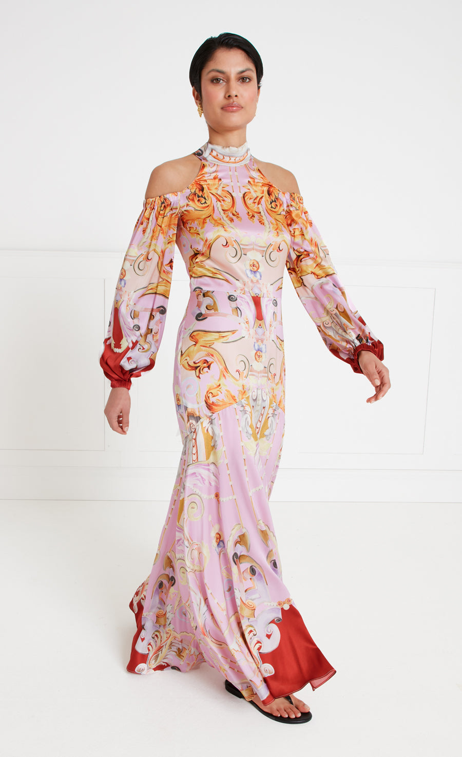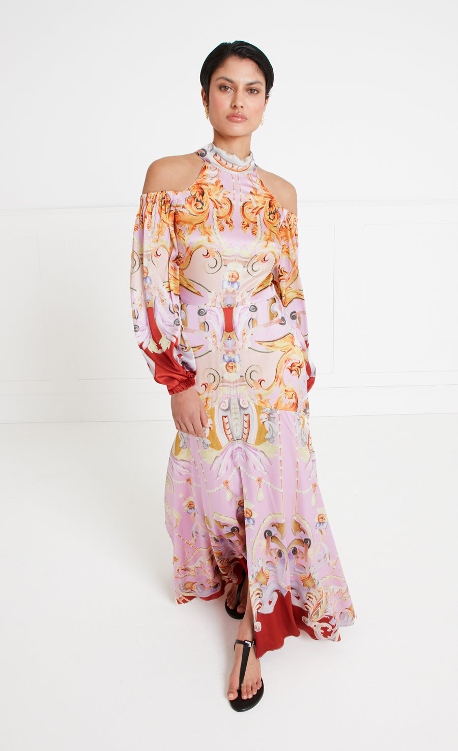 A fresh take on the eveningwear aesthetic, the Carline print cold shoulder dress elevates the classic maxi silhouette with a high-neck, cut-out and bow detailing, balanced with puff sleeves, finished with ruched hems.