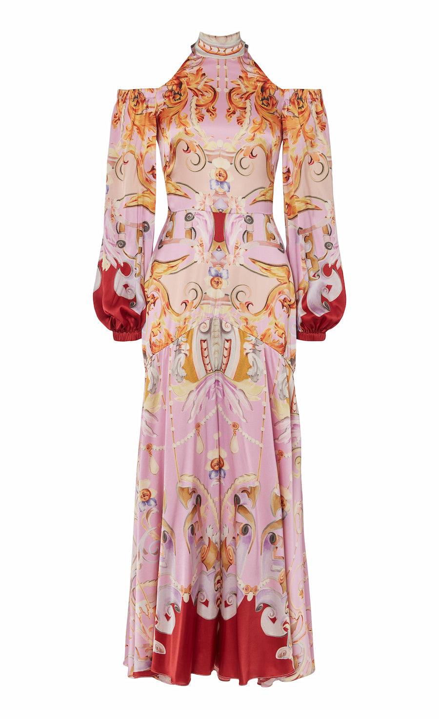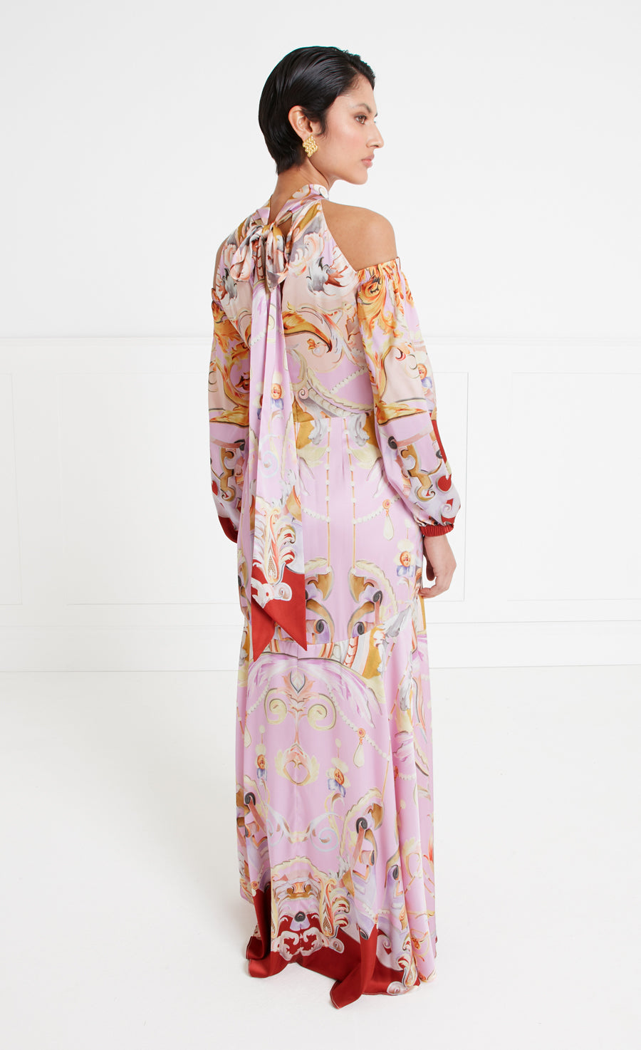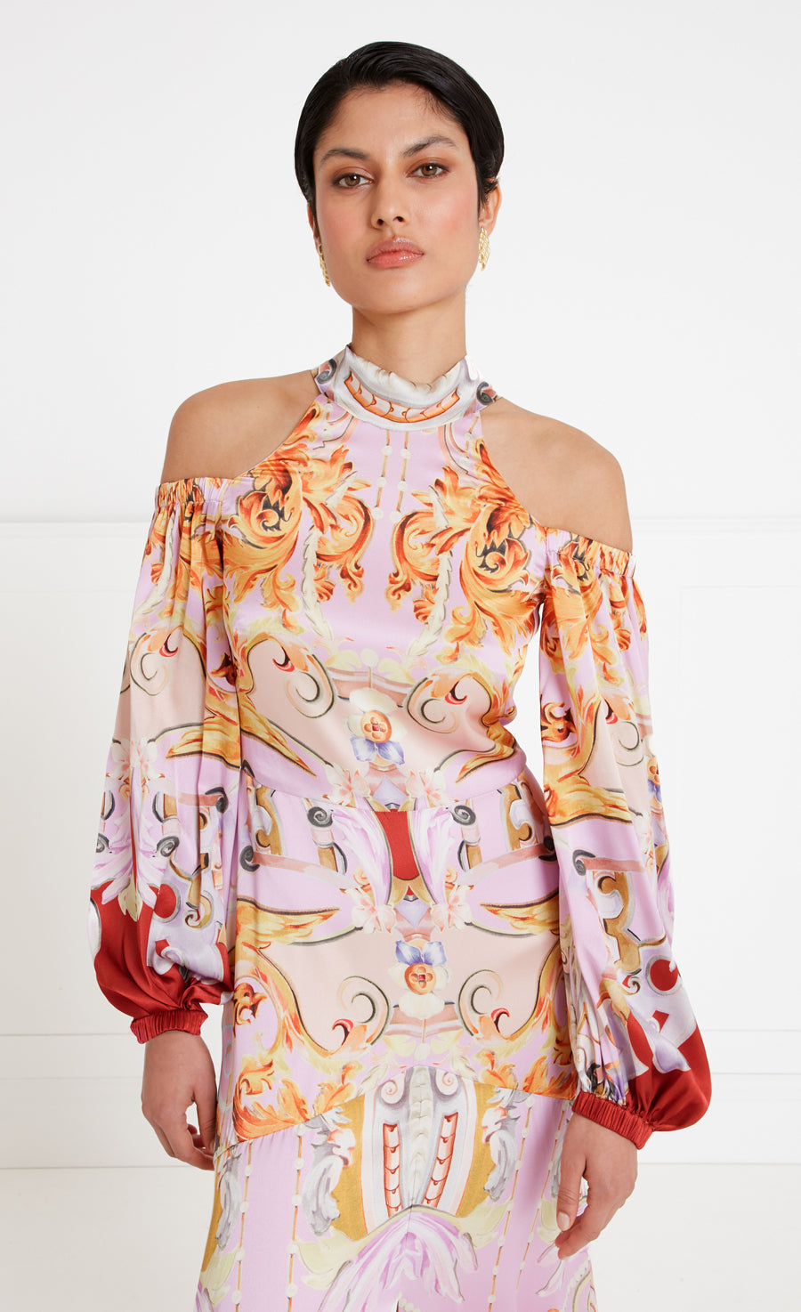 A fresh take on the eveningwear aesthetic, the Carline print cold shoulder dress elevates the classic maxi silhouette with a high-neck, cut-out and bow detailing, balanced with puff sleeves, finished with ruched hems.