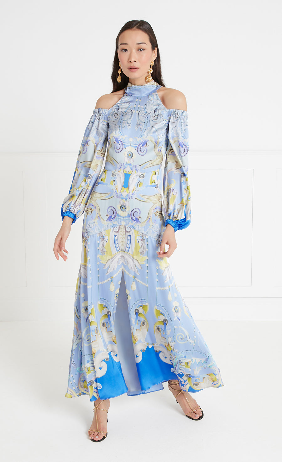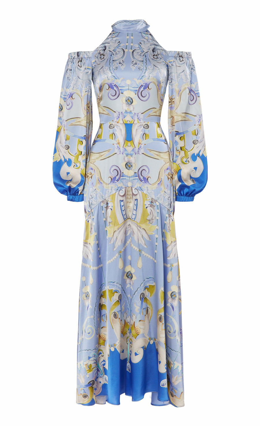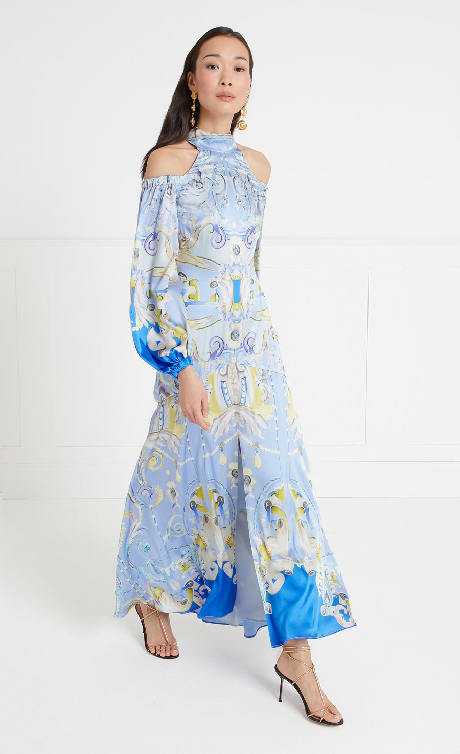 A fresh take on the eveningwear aesthetic, the Carline print cold shoulder dress elevates the classic maxi silhouette with a high-neck, cut-out and bow detailing, balanced with puff sleeves, finished with ruched hems.