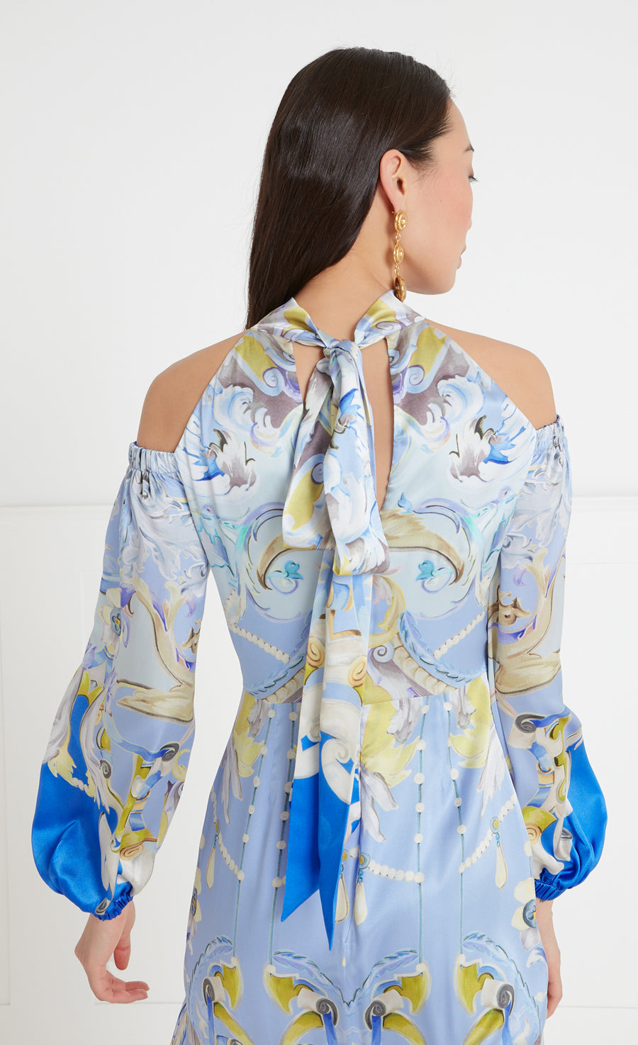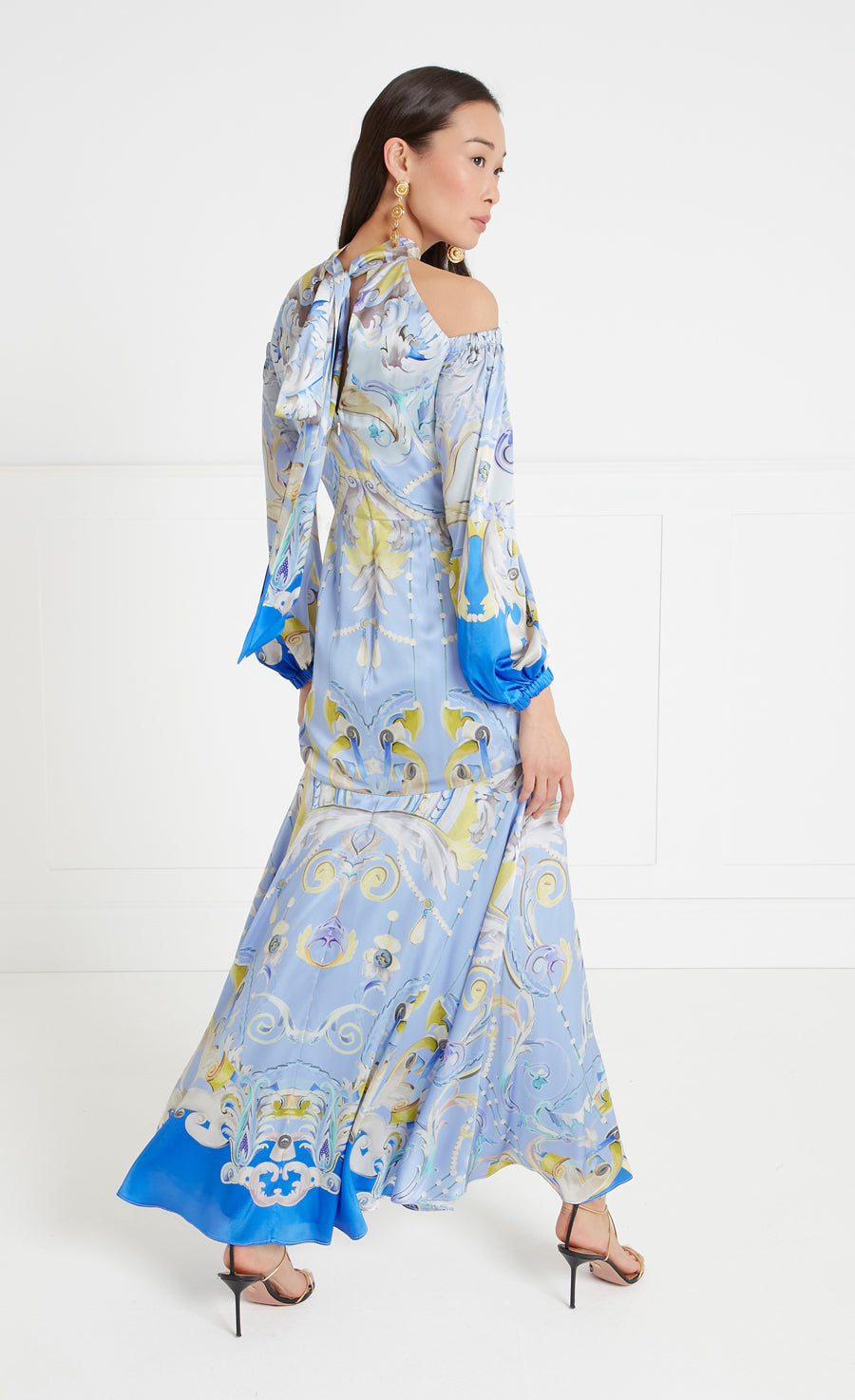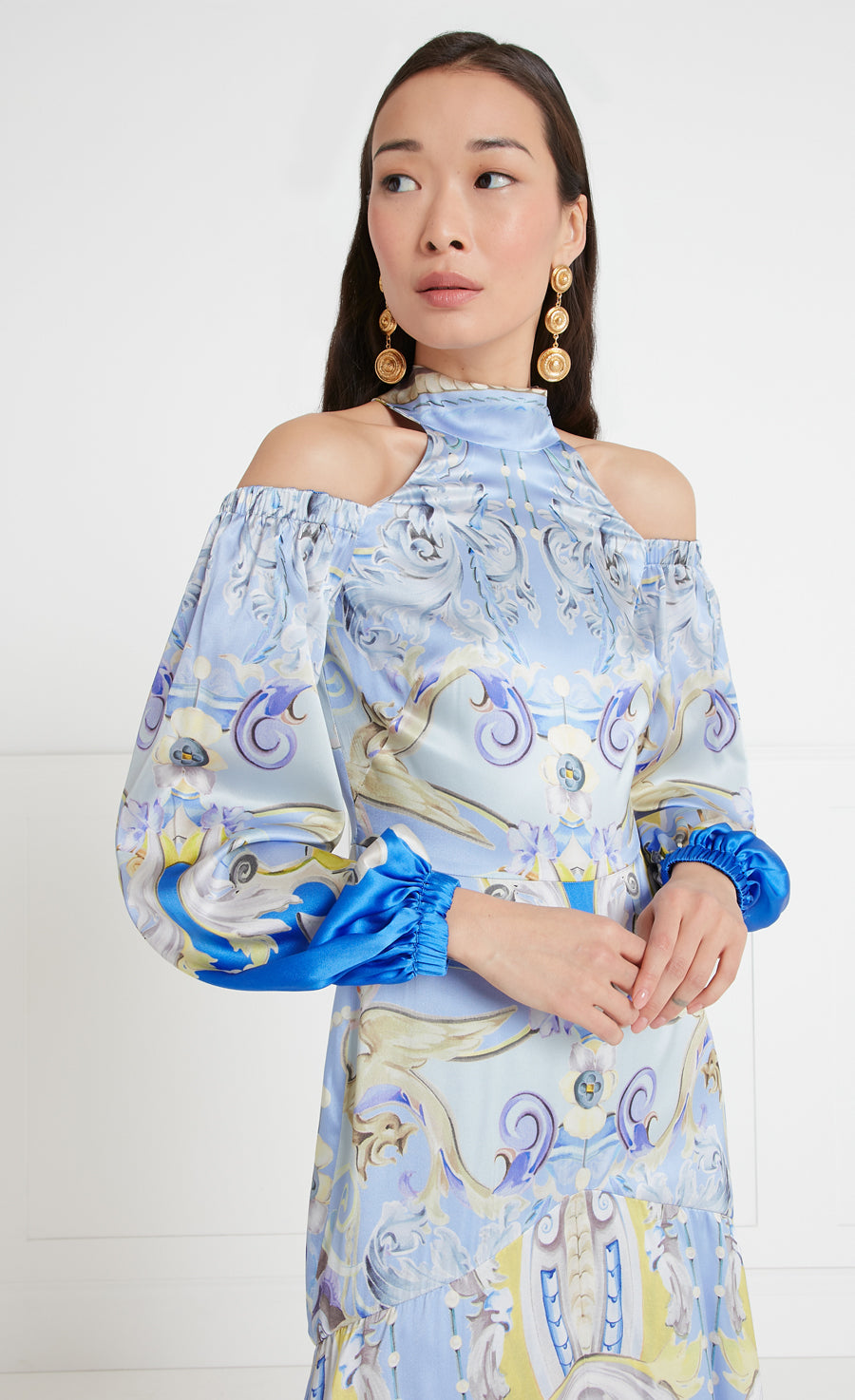 A fresh take on the eveningwear aesthetic, the Carline print cold shoulder dress elevates the classic maxi silhouette with a high-neck, cut-out and bow detailing, balanced with puff sleeves, finished with ruched hems.