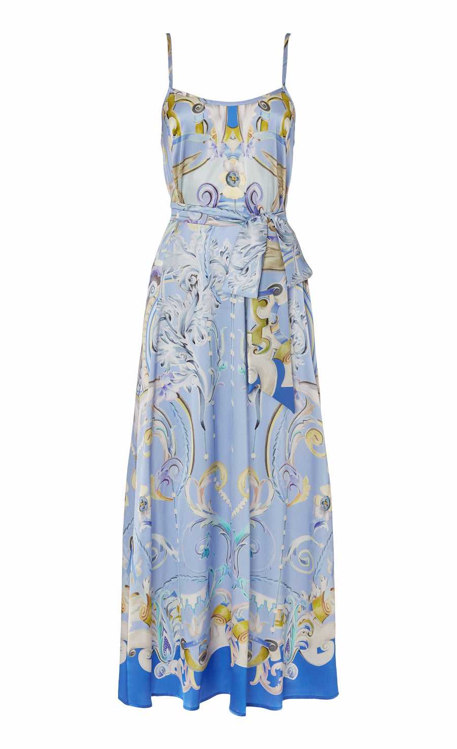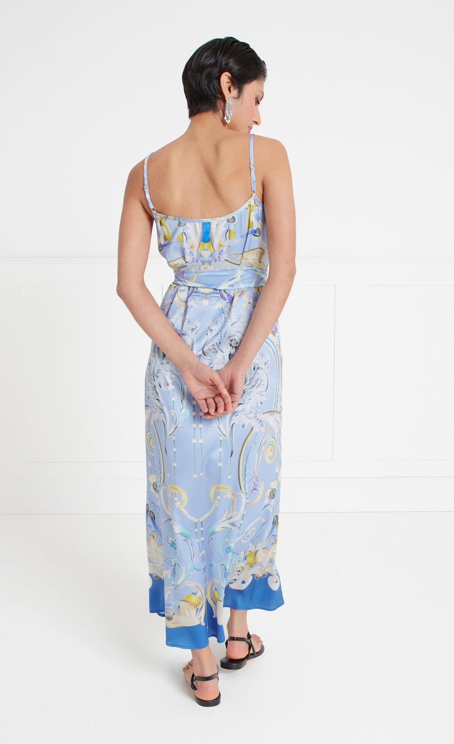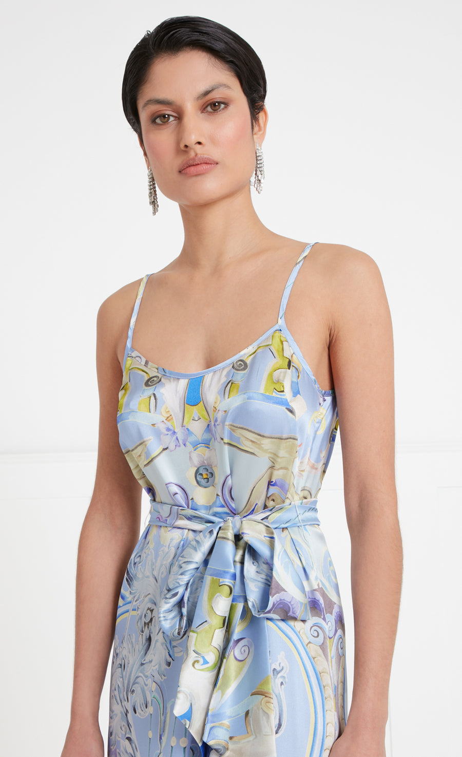A picture of wearable opulence, our Carline story offers a lighter and looser evening print option. Made from fluid stretch satin silk, the hand-painted artwork depicts muted fresco-style motifs, composed in-house then printed in Italy, combining hazy pastels with a stronger hue at the hem. Featuring three dresses, a coat and two headscarves, united by contemporary silhouettes that can be co-ordinated or worn alone.