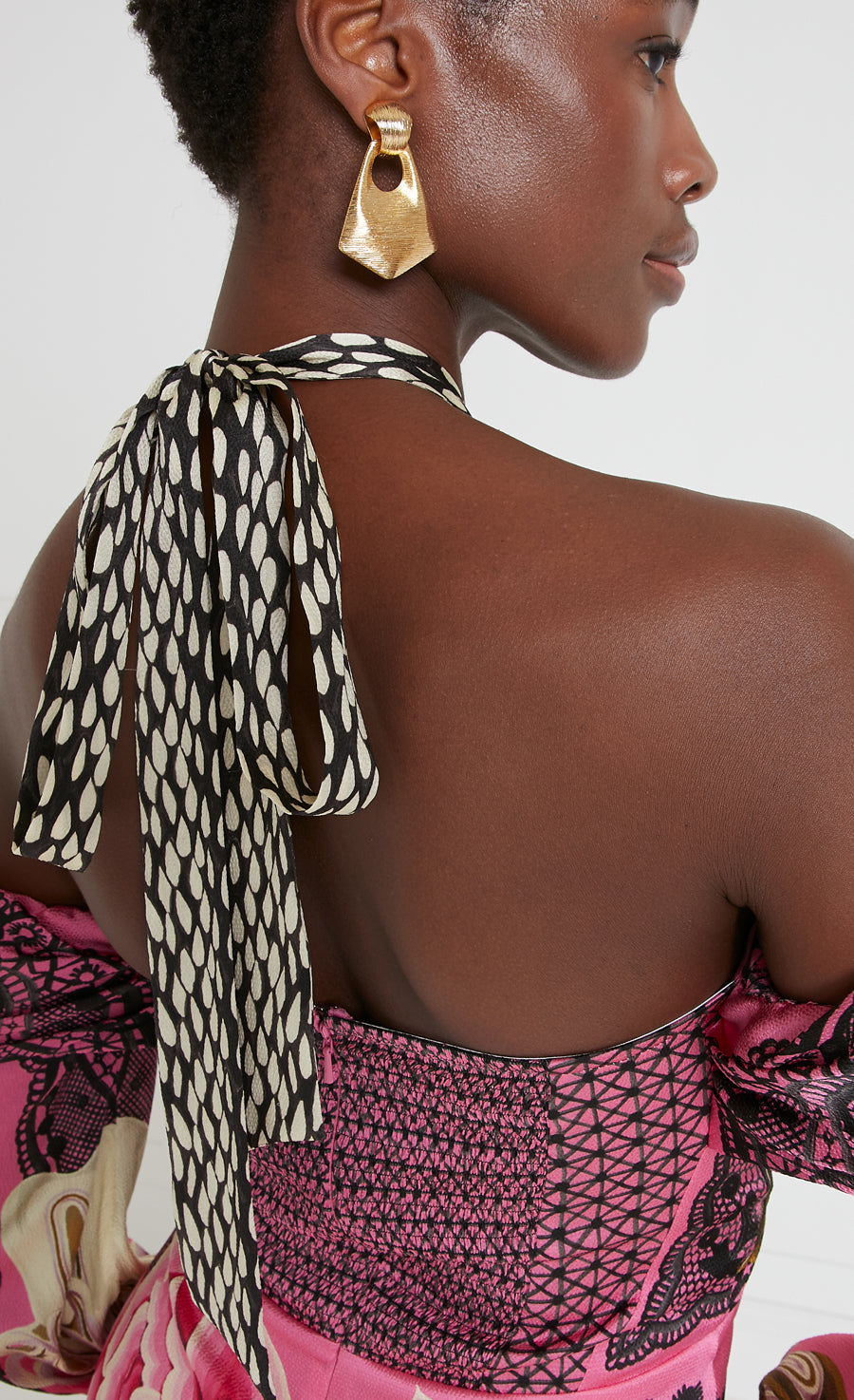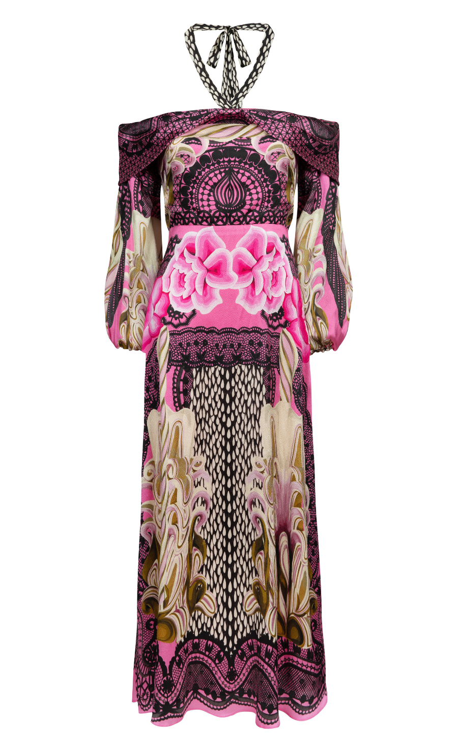 A joyous riot of colour and pattern, with oversized Pueblo florals, heliconias and Calla lilies in trippy acid hues alongside a smattering of trompe l¡¯oeil ribbon and lace, the Cici Print Story is ready-made for revelry. A surreal fusion of inspirations: vigil prayer card iconography with Mexican textiles ¡ª a curious exploration of the traditional and the esoteric, a playful take on the ethos of the Dyn Circle muses. In black and azalea pink.
