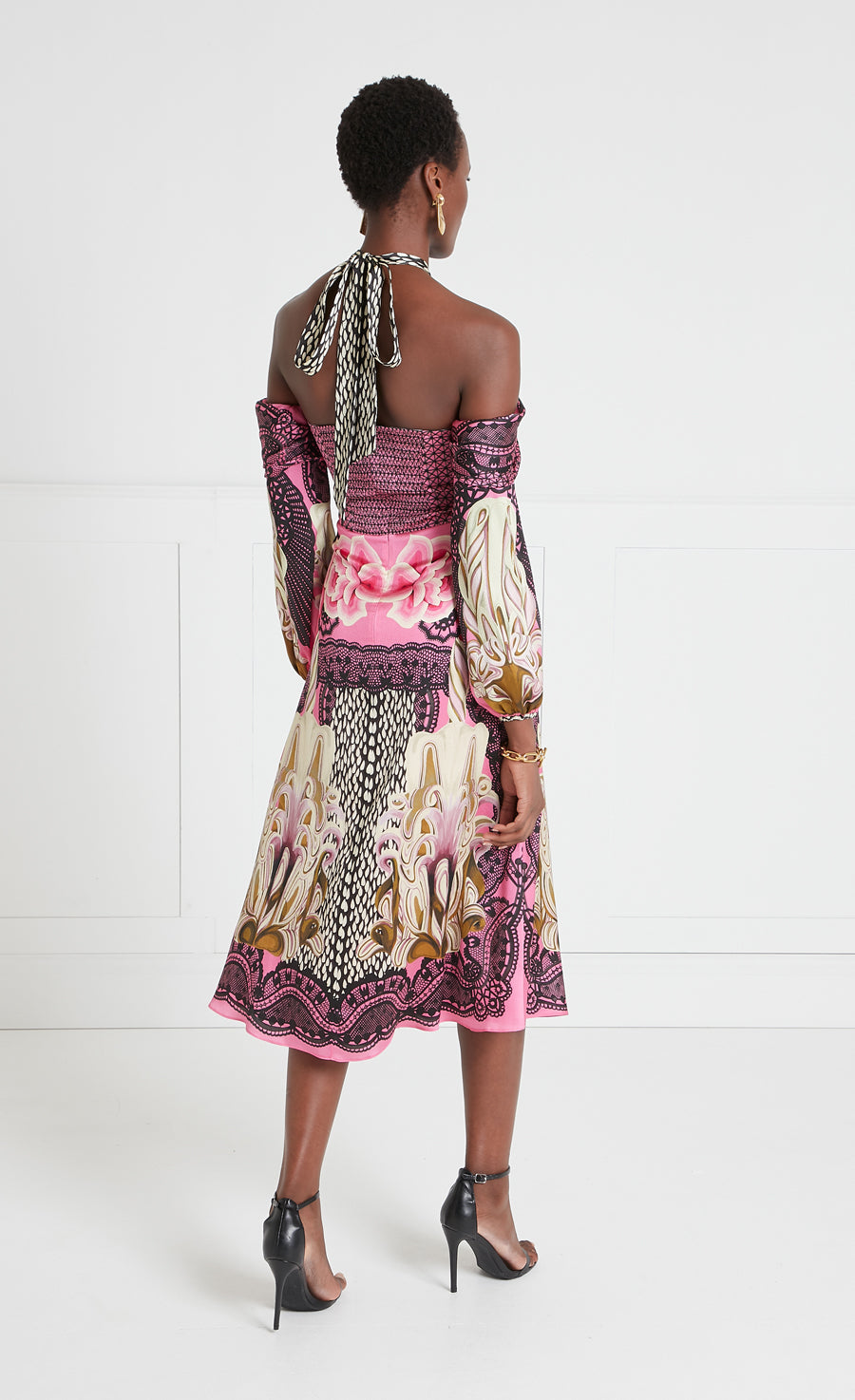 A new silhouette for AW23, the Cici Print Halter Dress is a soft yet statement-making style, with a draped off-the-shoulder neckline, fluid bell sleeves and lustrous bow fastening that cascades down the back, fitted with a waist-cinching bodice for added polish.