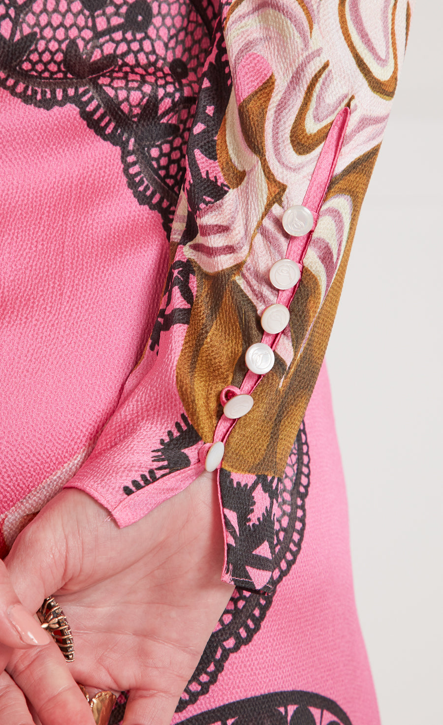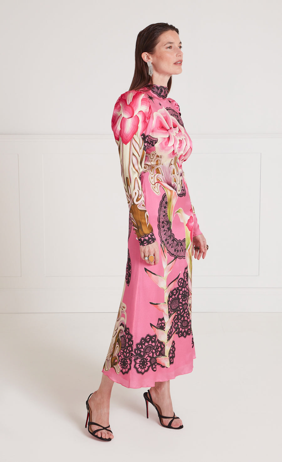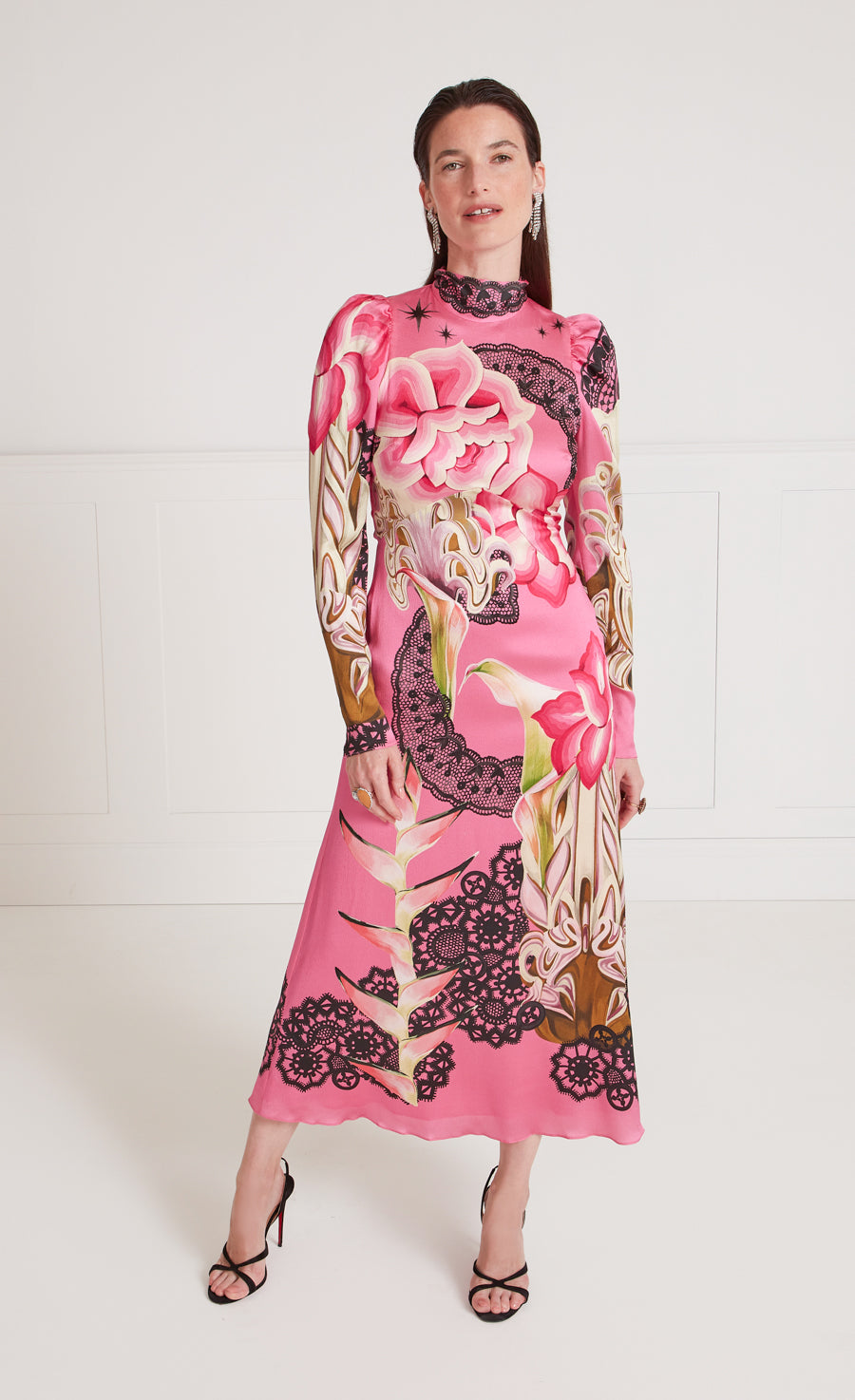 Crafted from hammered stretch silk satin, with a fluid drape and lustrous finish, every element painstakingly hand-painted in-house and placed in specially engineered compositions for perfect print alignment, to fit and flatter the dress silhouette. Printed in Italy and made in Europe.
