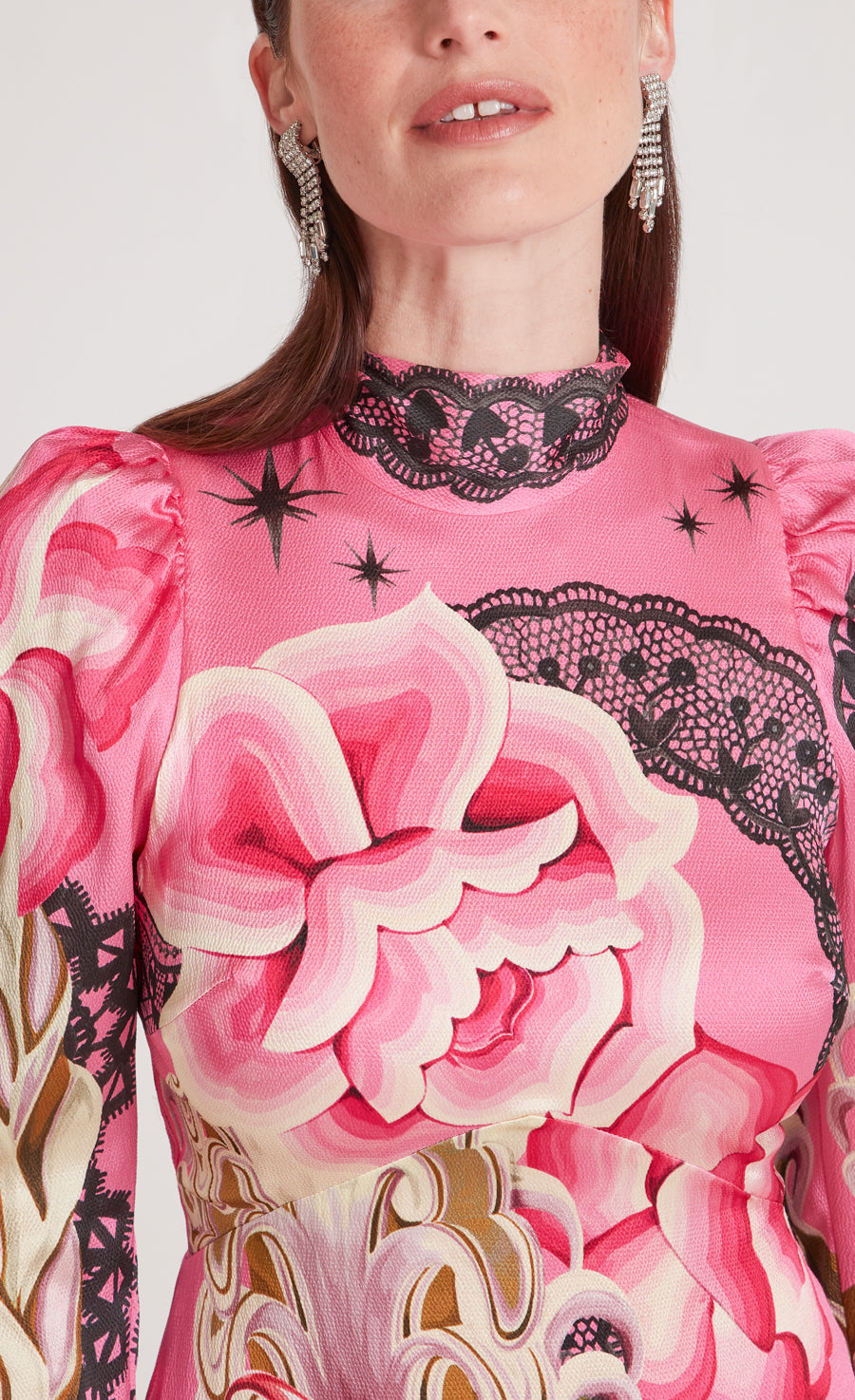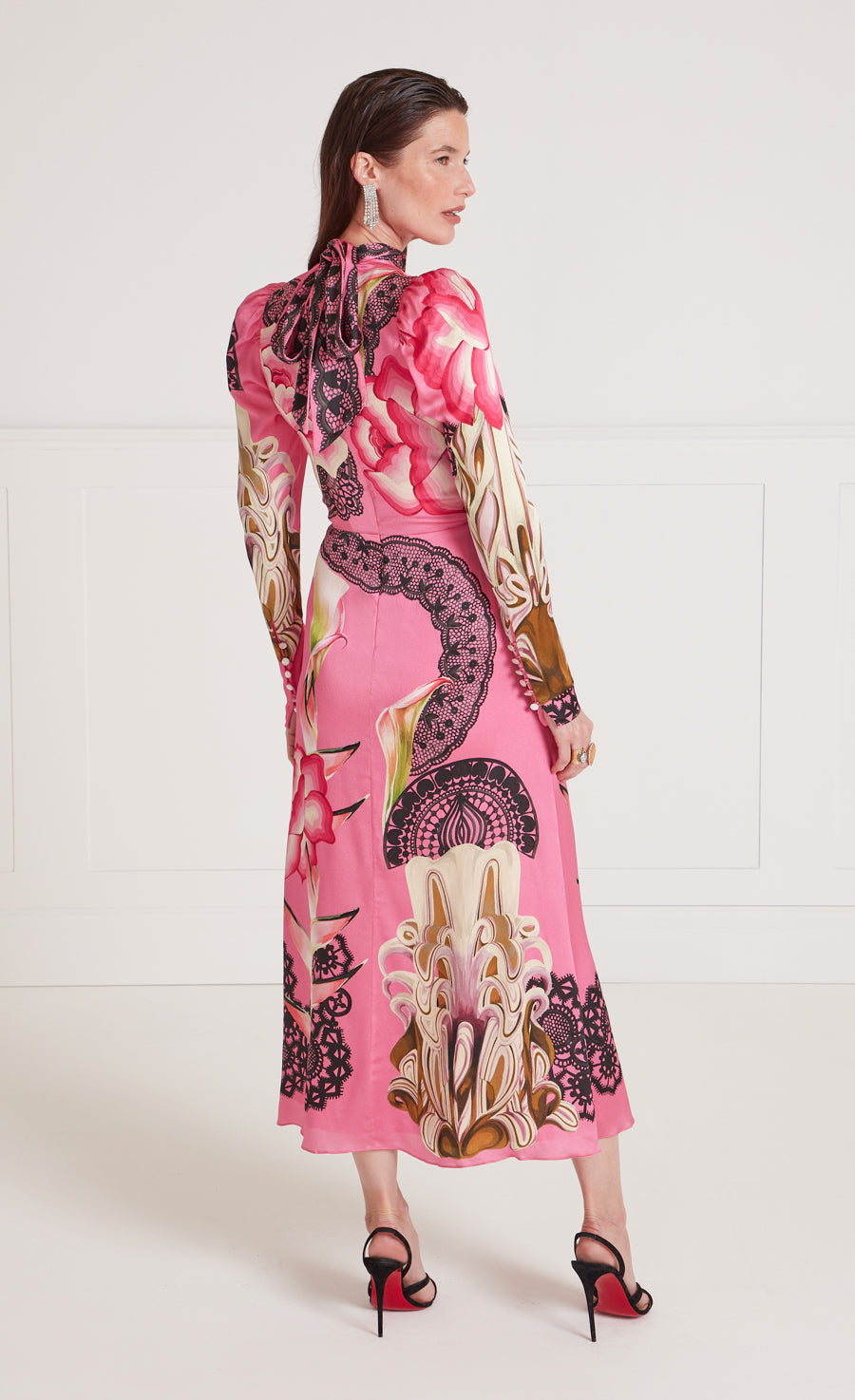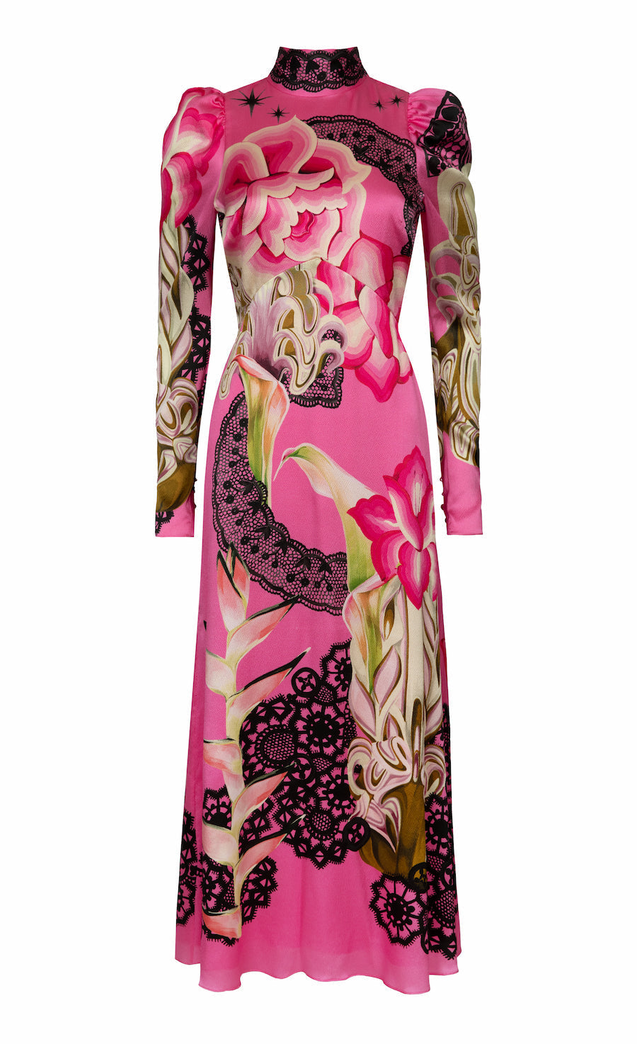 A joyous riot of colour and pattern, with oversized Pueblo florals, heliconias and Calla lilies in trippy acid hues alongside a smattering of trompe l¡¯oeil ribbon and lace, the Cici Print Story is ready-made for revelry. A surreal fusion of inspirations: vigil prayer card iconography with Mexican textiles ¡ª a curious exploration of the traditional and the esoteric, a playful take on the ethos of the Dyn Circle muses. In black and azalea pink.