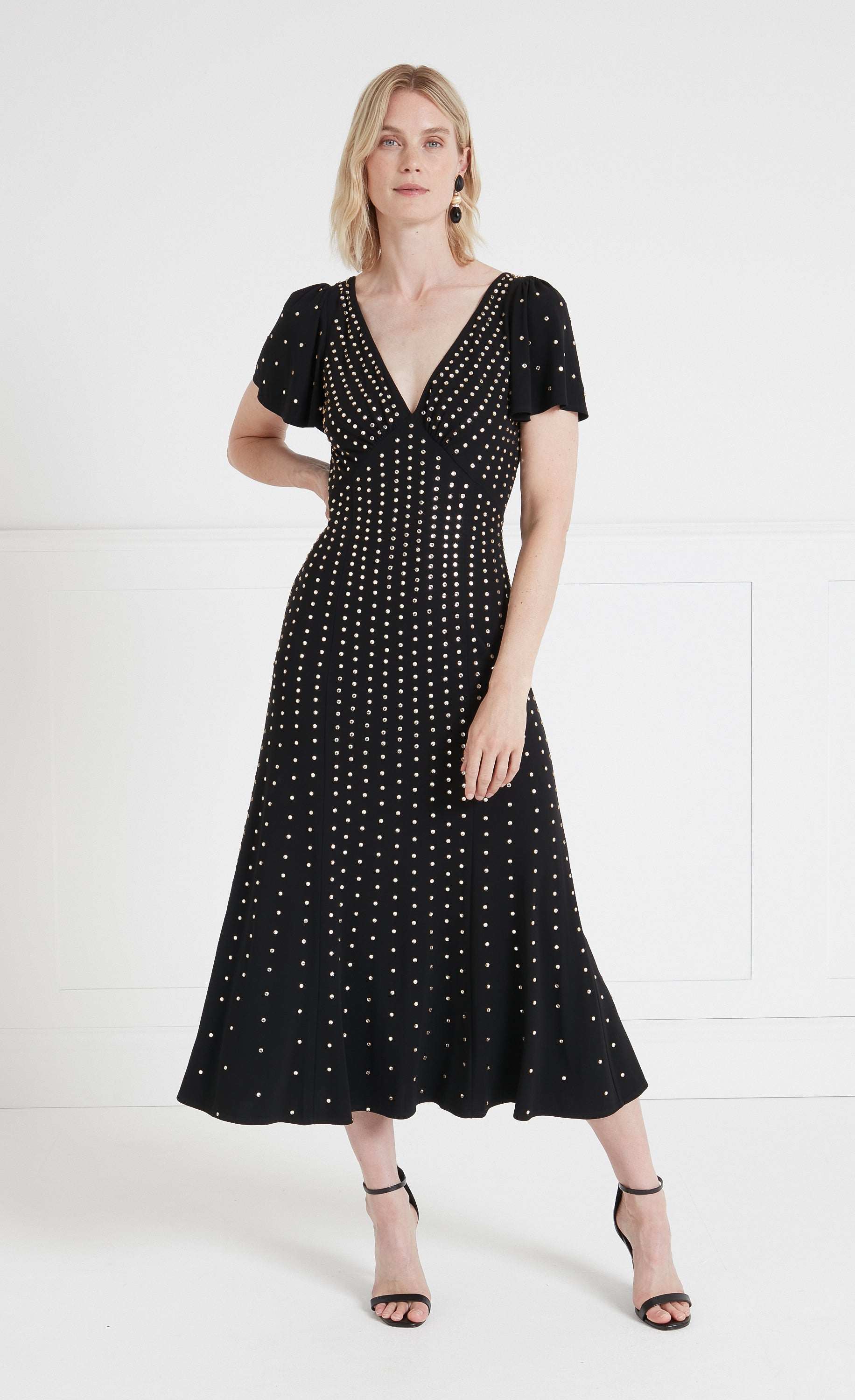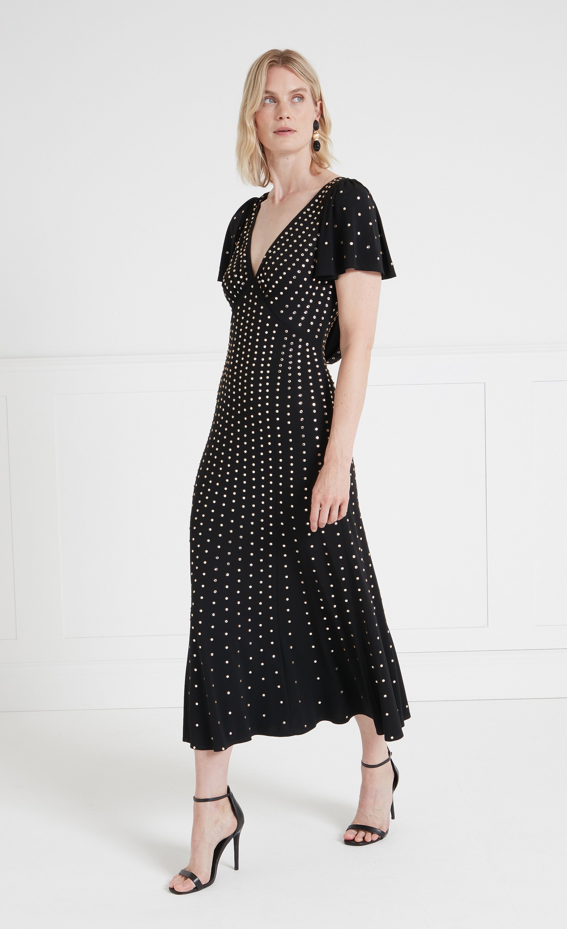 The viscose jersey used in these designs is sourced from a longstanding family business founded in the 1970s. This factory combines design sensibilities with craftsmanship, known for its high-quality control. The viscose provides a soft, breathable, and drapable quality, making it ideal for these embellished, figure-flattering pieces.