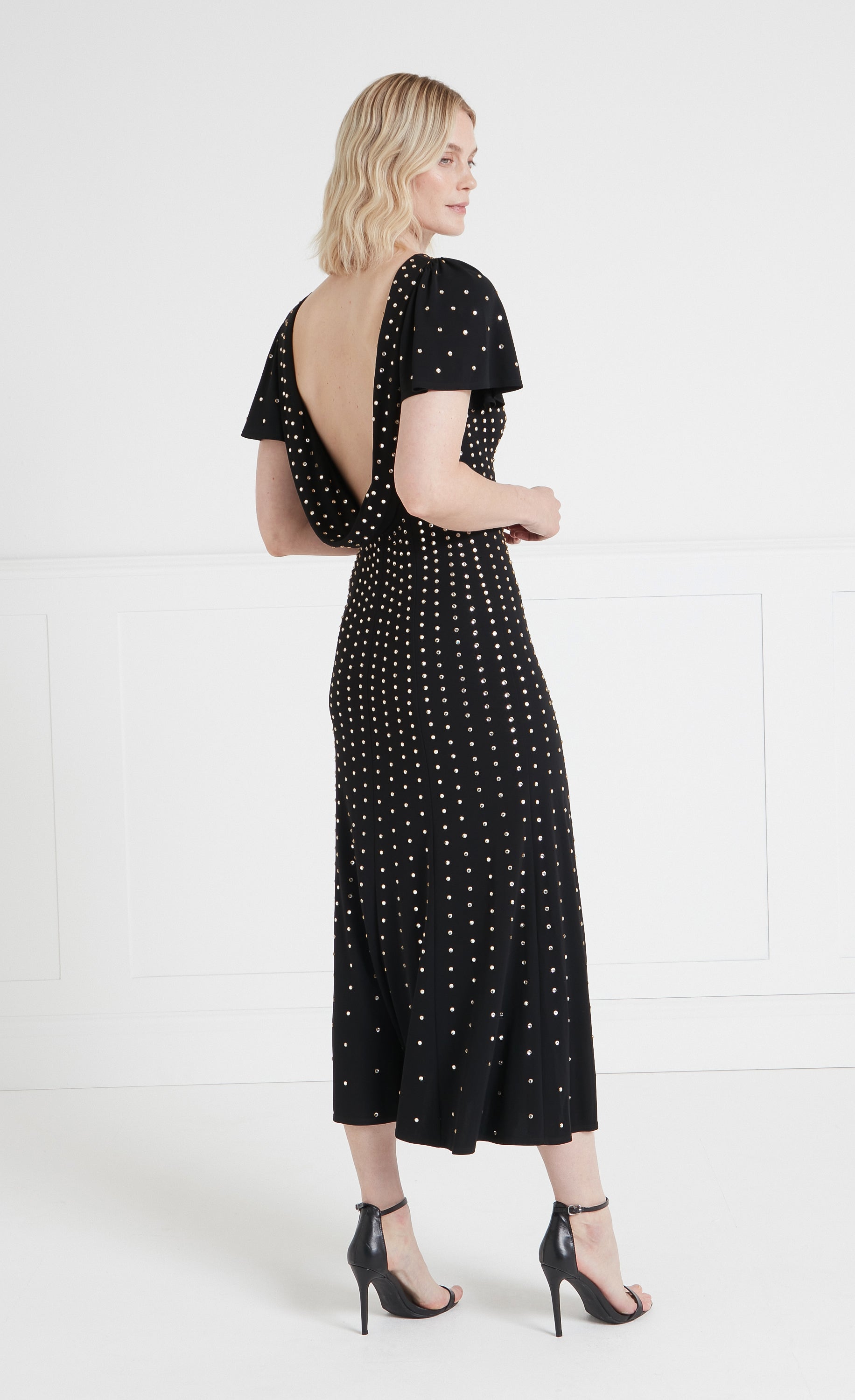 The Comet Cocktail dress is a flared design, embellished with studded crystals, adding a touch of opulence to the look. Featuring a head turning draped cowl back, it makes it the perfect statement piece for any glamorous occasion.