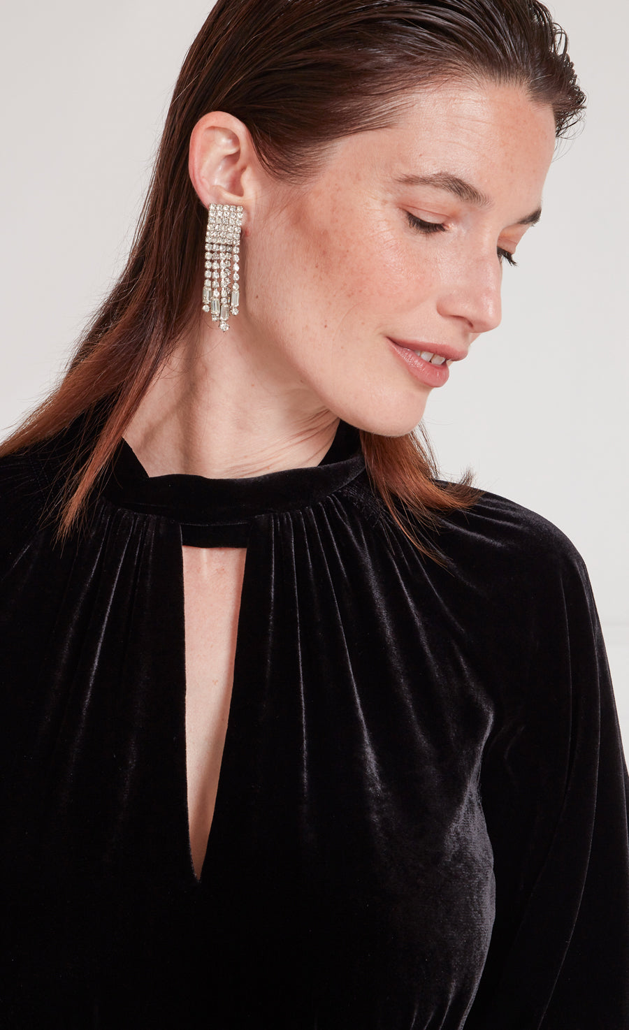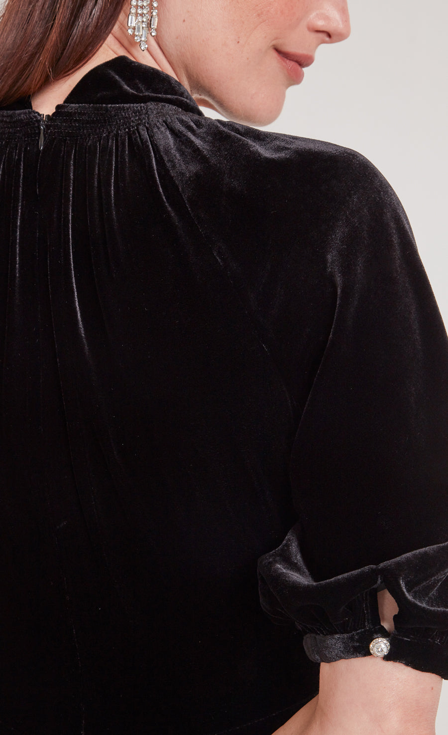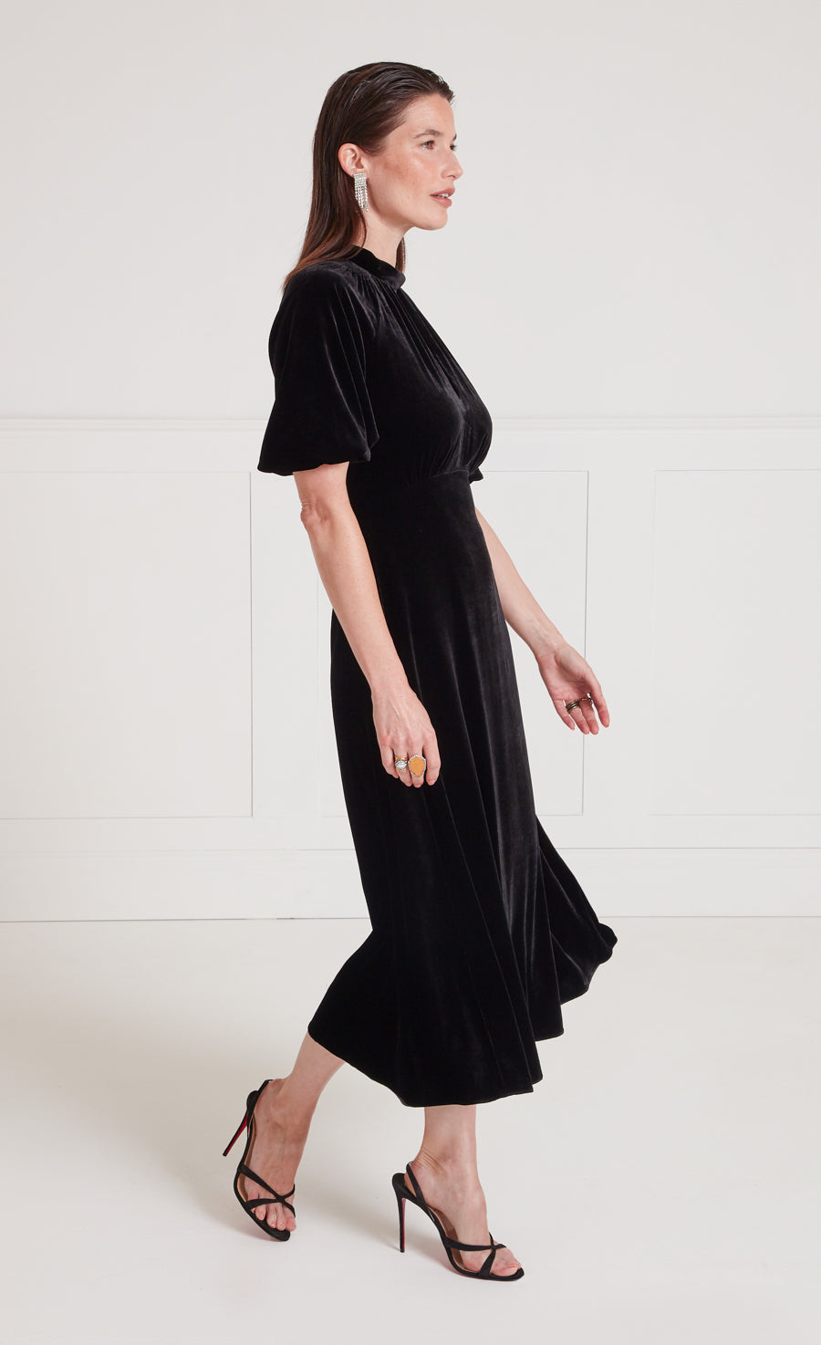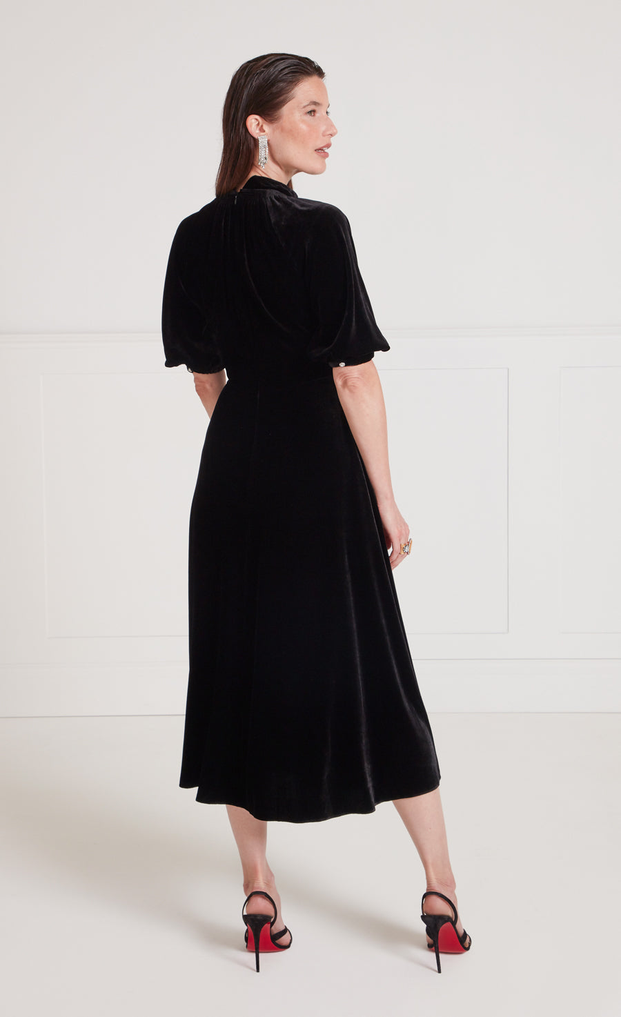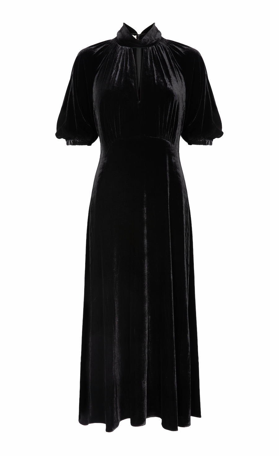 A modern approach to 1930s day dress silhouettes, the Eliana Story is the epitome of timeless elegance. Made from a sumptuous stretch silk and viscose blend velvet, in black, with a luxuriously fluid finish for day to night comfort.