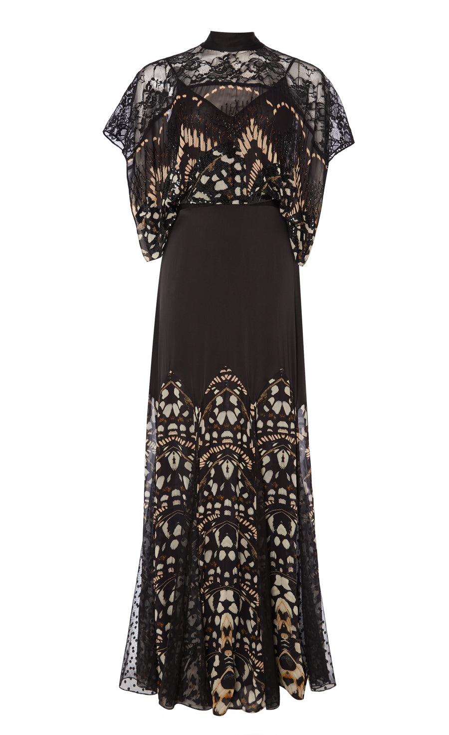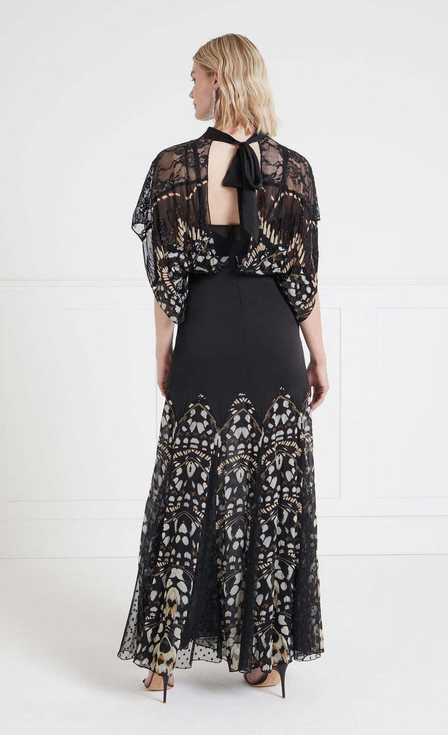 Crafted from light georgette and satin silk, artfully designed to flatter the form, the Emperor dress fuses two distinct aesthetics to striking effect ¡ª combining delicate Chantilly lace and dot tulle with a riotous kaleidoscopic print. A modern take on the demure elements of twenties eveningwear: a neat high neck fastens at the back with a bow, a yoke and billowing caplet sleeves cascade over the shoulders, cinched at the waist to create a sleek A-line.