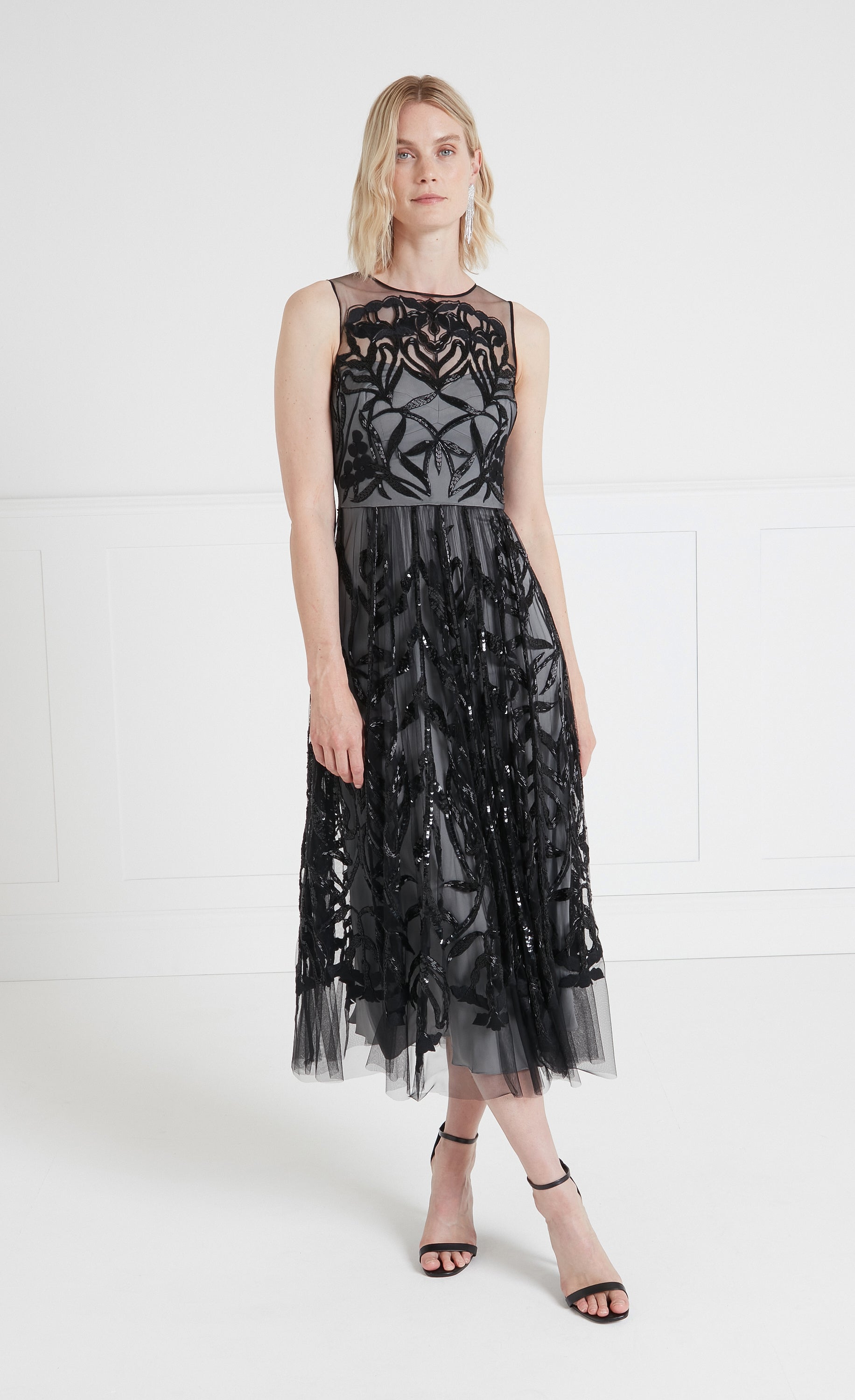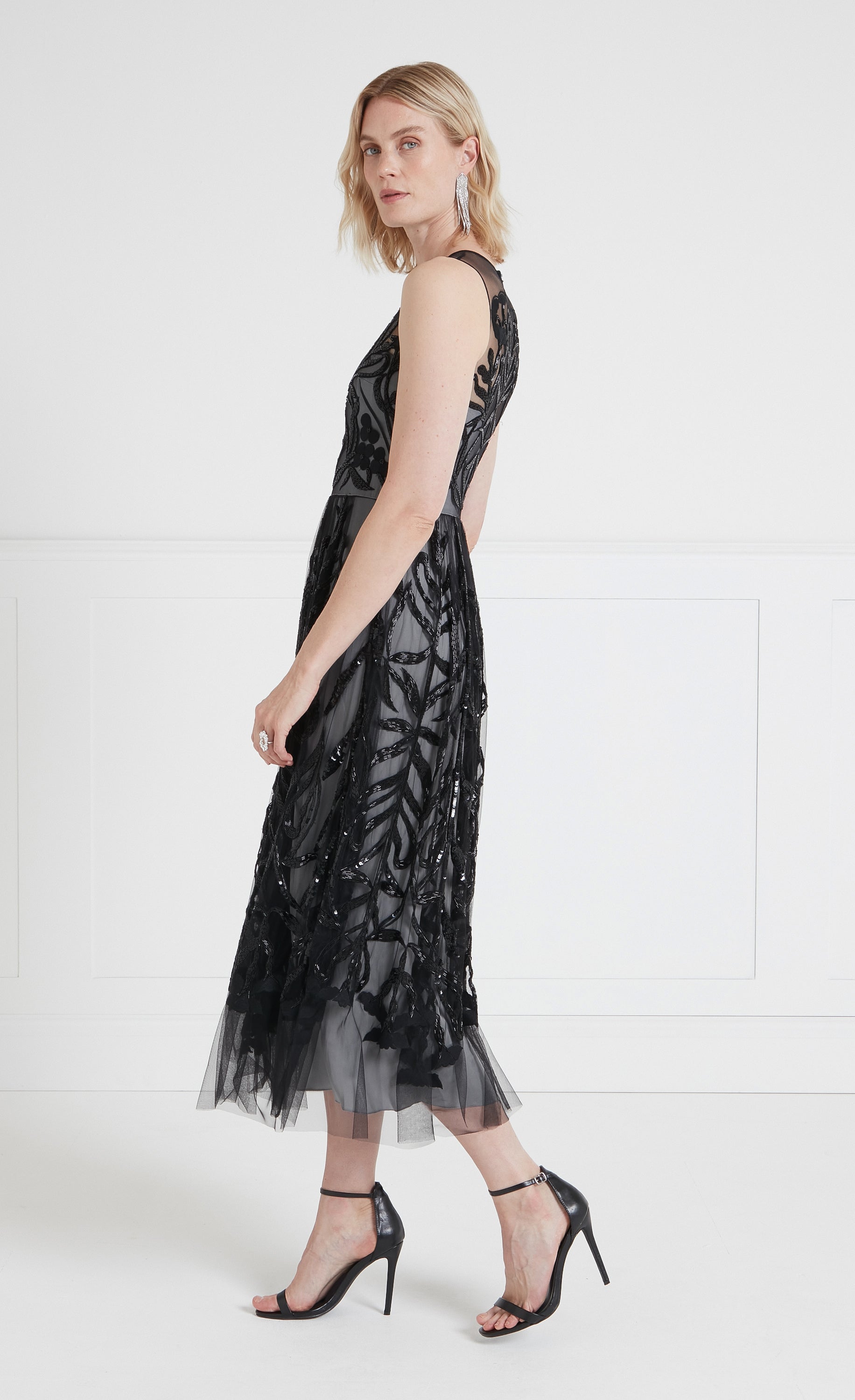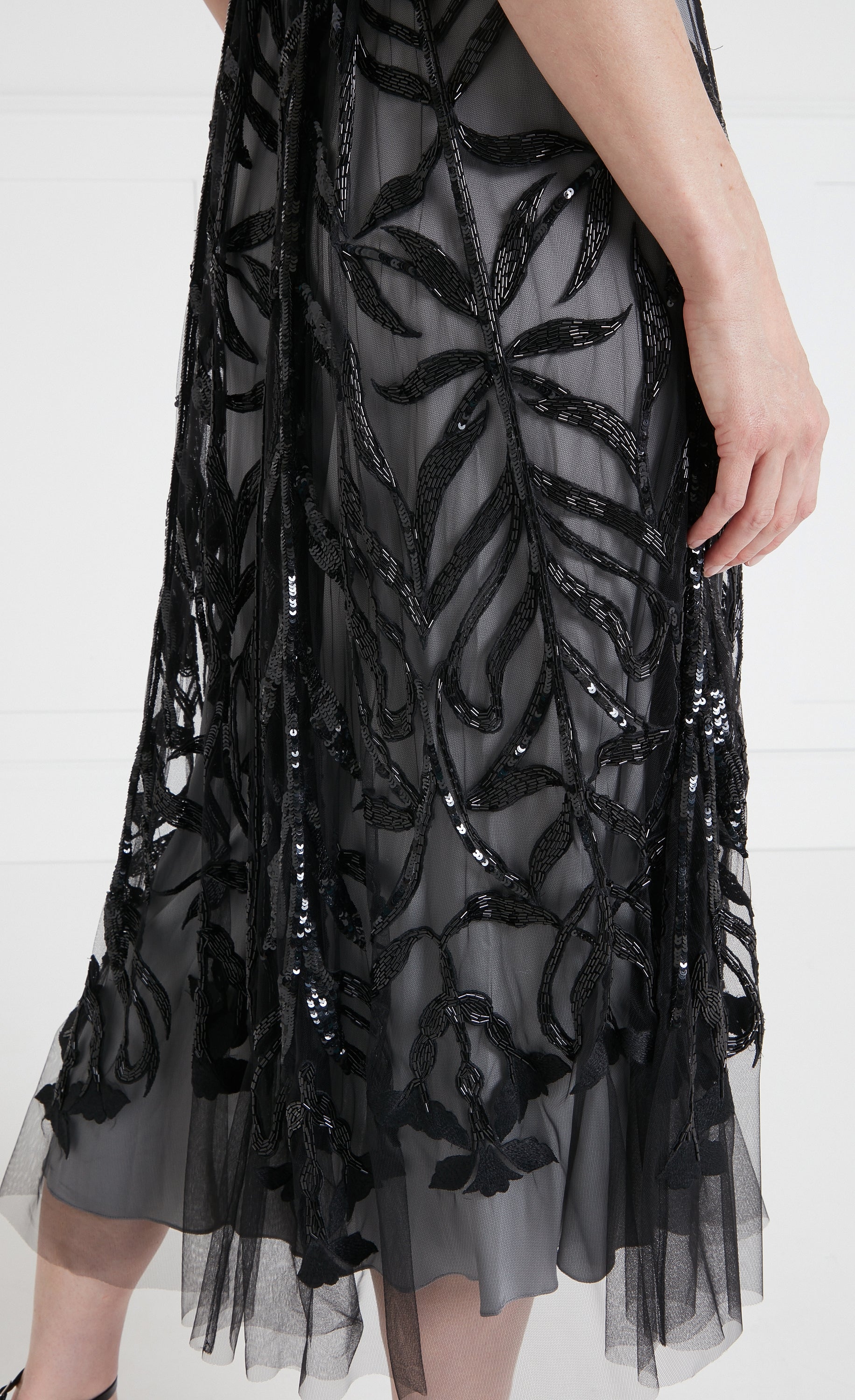 A graceful interpretation of the metamorphosis that weaves its way through this collection, the Inez cocktail dress expresses the theme through hand-embellished geometric florals ¡ª taking inspiration from Art Deco vines ¡ª on fine Italian tulle and semi-sheer overlay atop a classic bandeau midi style.?