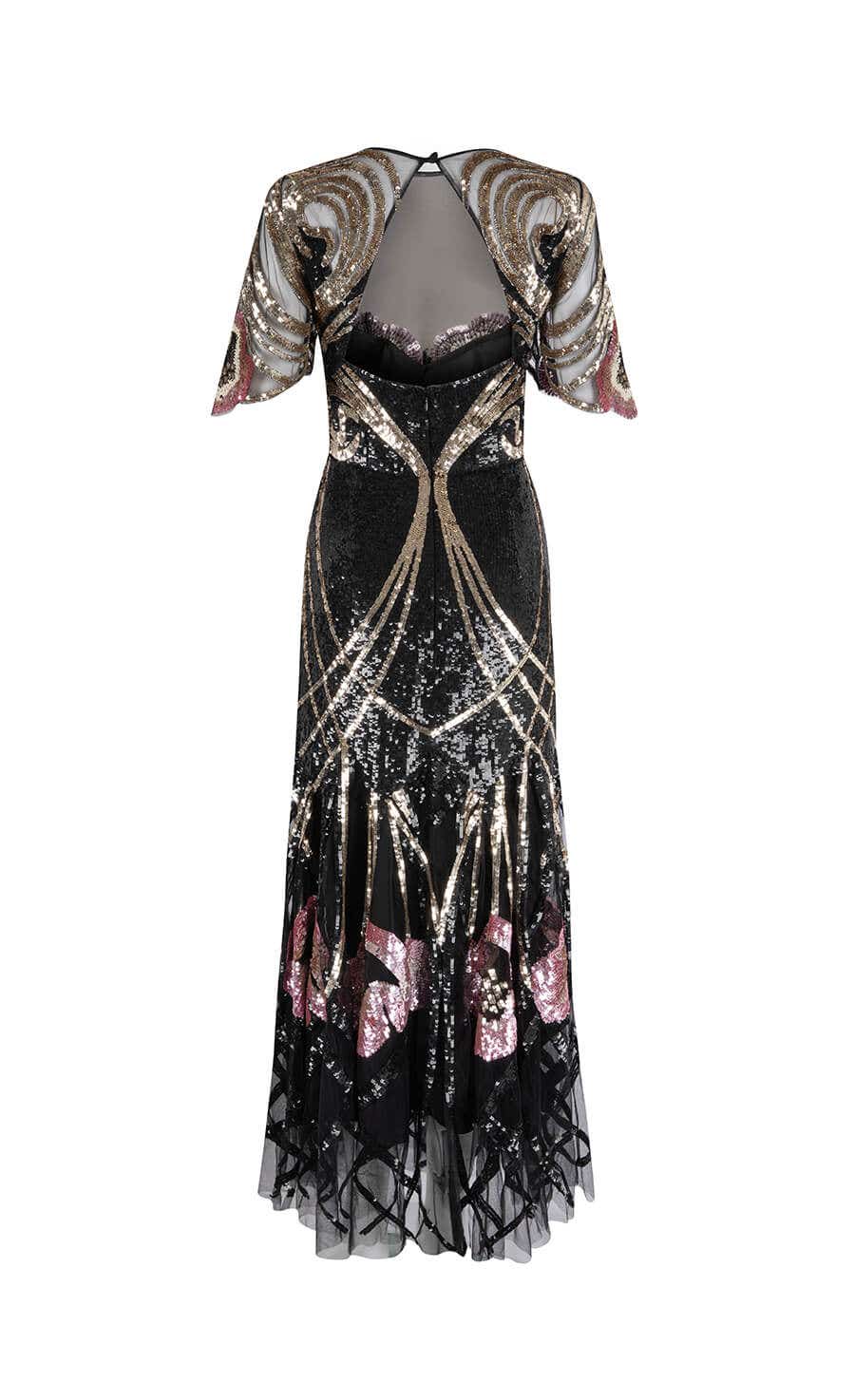 The Natalia Gown is a standout dress with contouring and interlacing lines of sequins, framing the figure beautifully. Bordered with tessellating neck and hemlines of dahlias, it is finished with a hand cut scallop edge to the sleeves. Conveneniently bra friendly as the open back detail ends mid way above the waist.