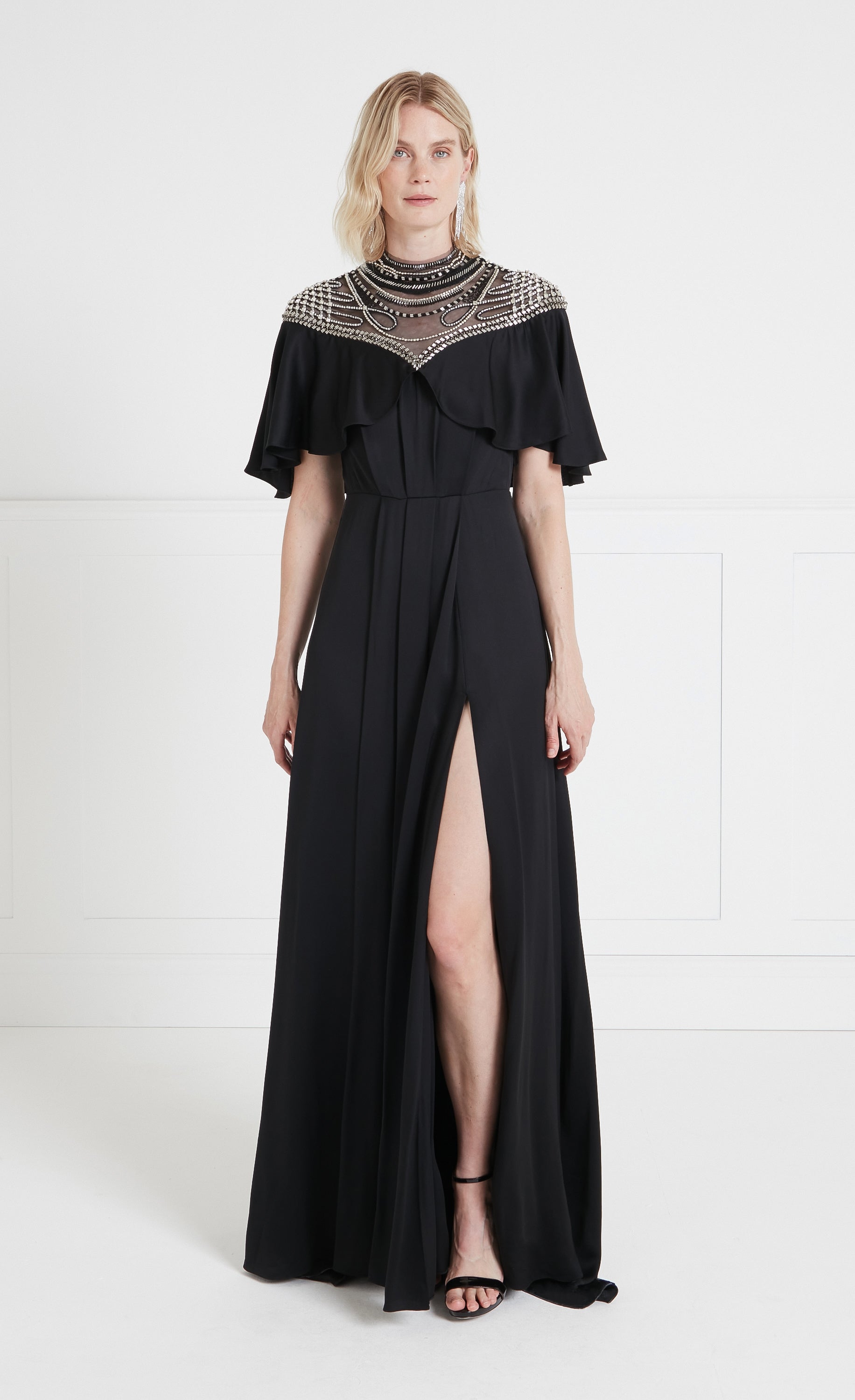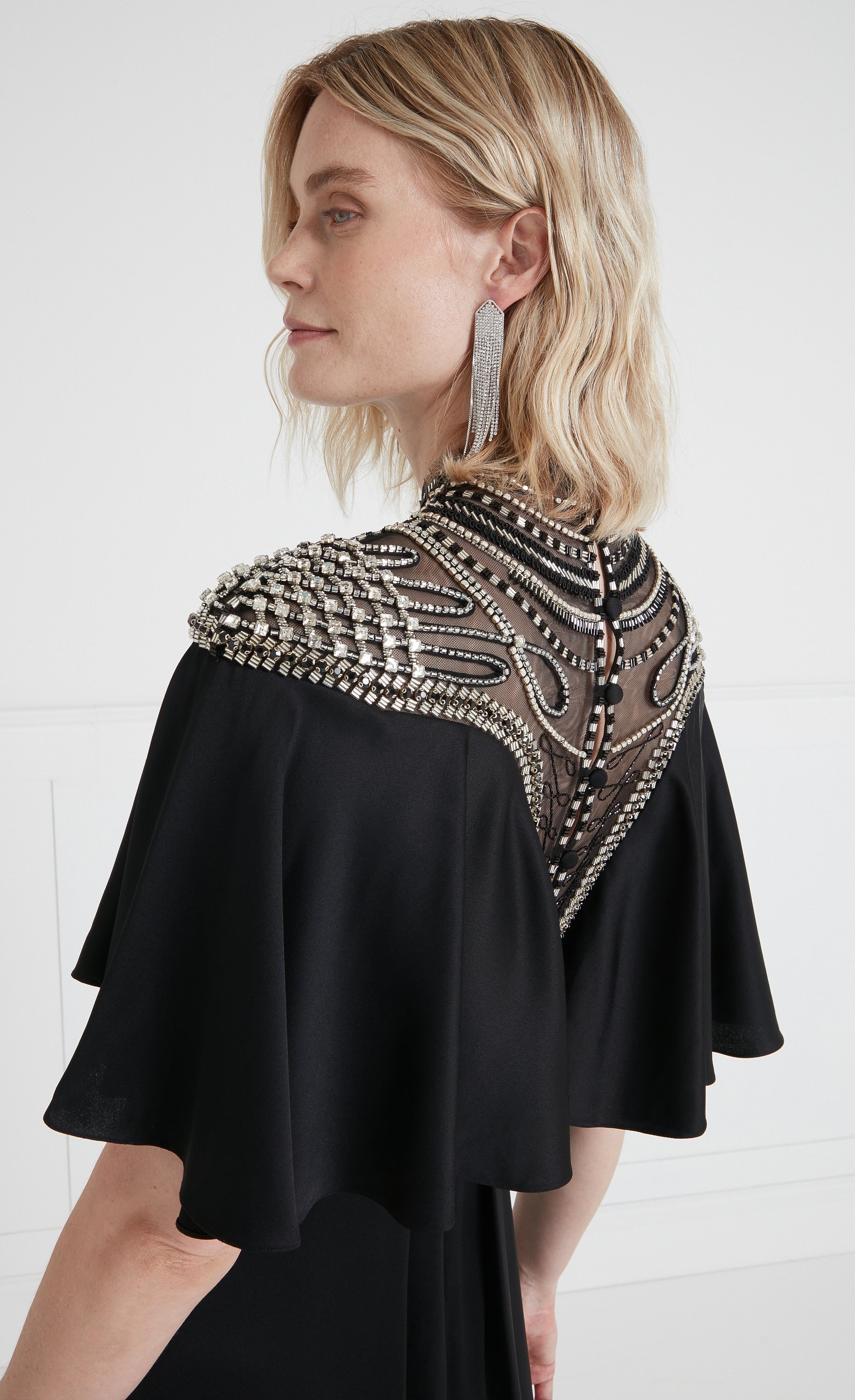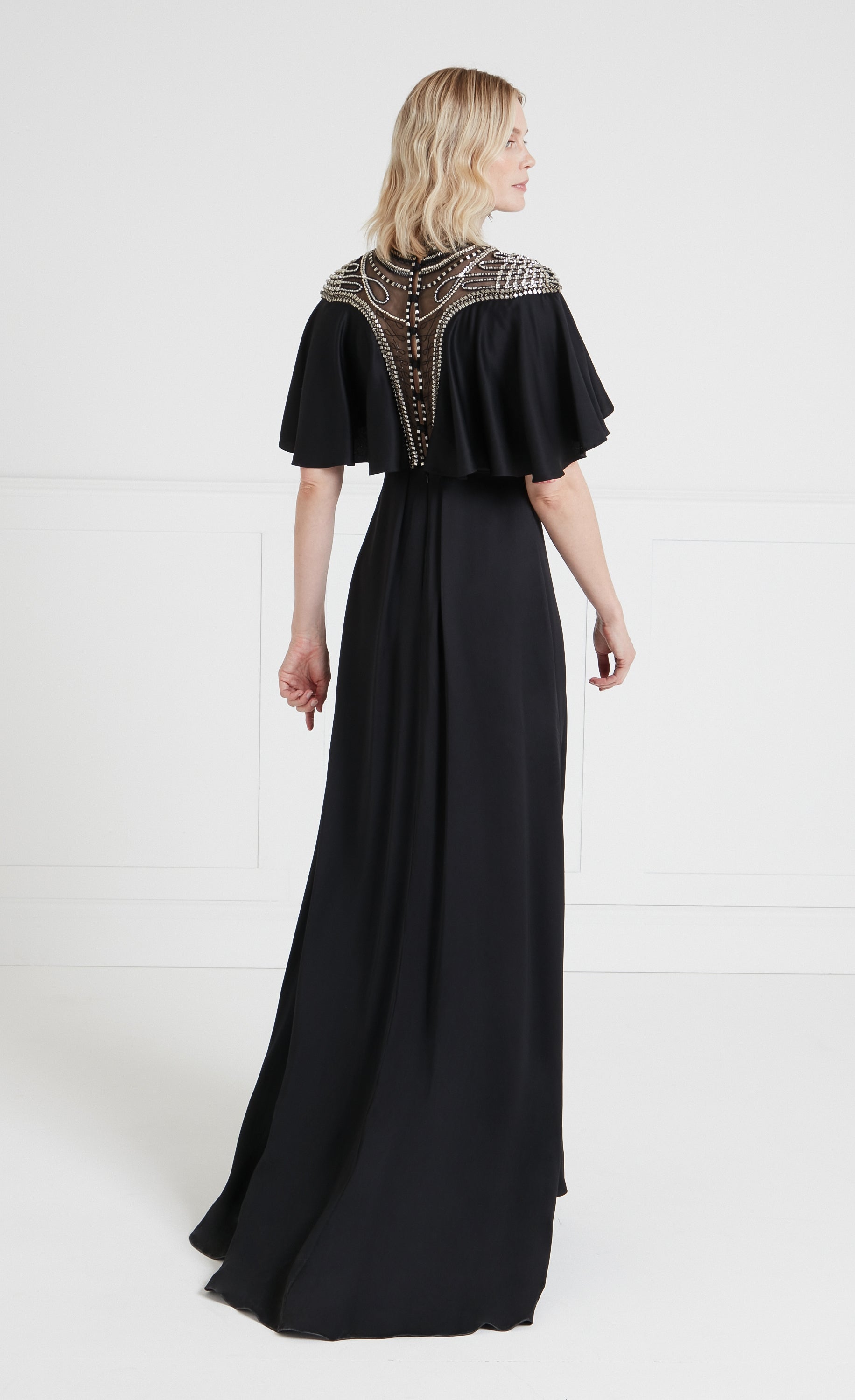 Paying homage to the eveningwear of the escapist era, the focal point of the Nina dress is the exquisite embellished yoke panelling: delicate beadwork on soft Italian illusion tulle contouring the d¨¦colletage, neck and shoulders, fastened with buttons at the spine. Stunning draping, creating a cape-like ruffle from the Bardot neckline, flowing to the floor-length hem, gives it an air of soft elegance.
