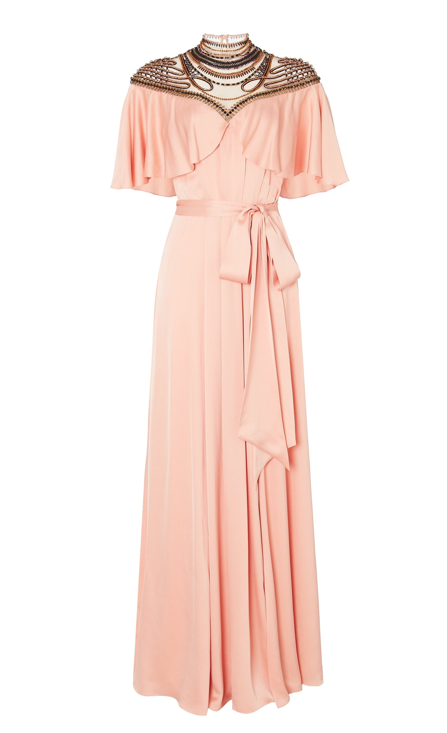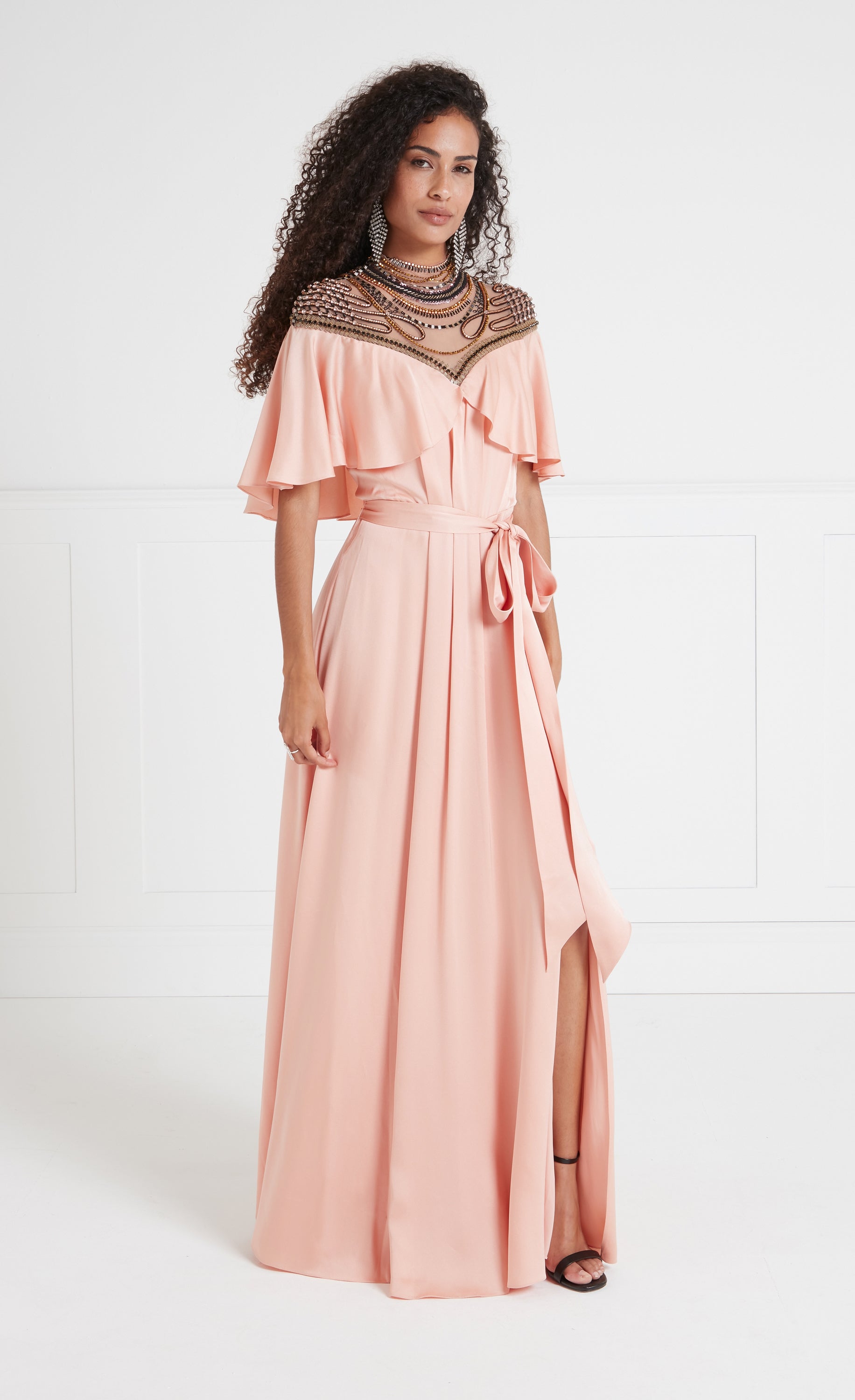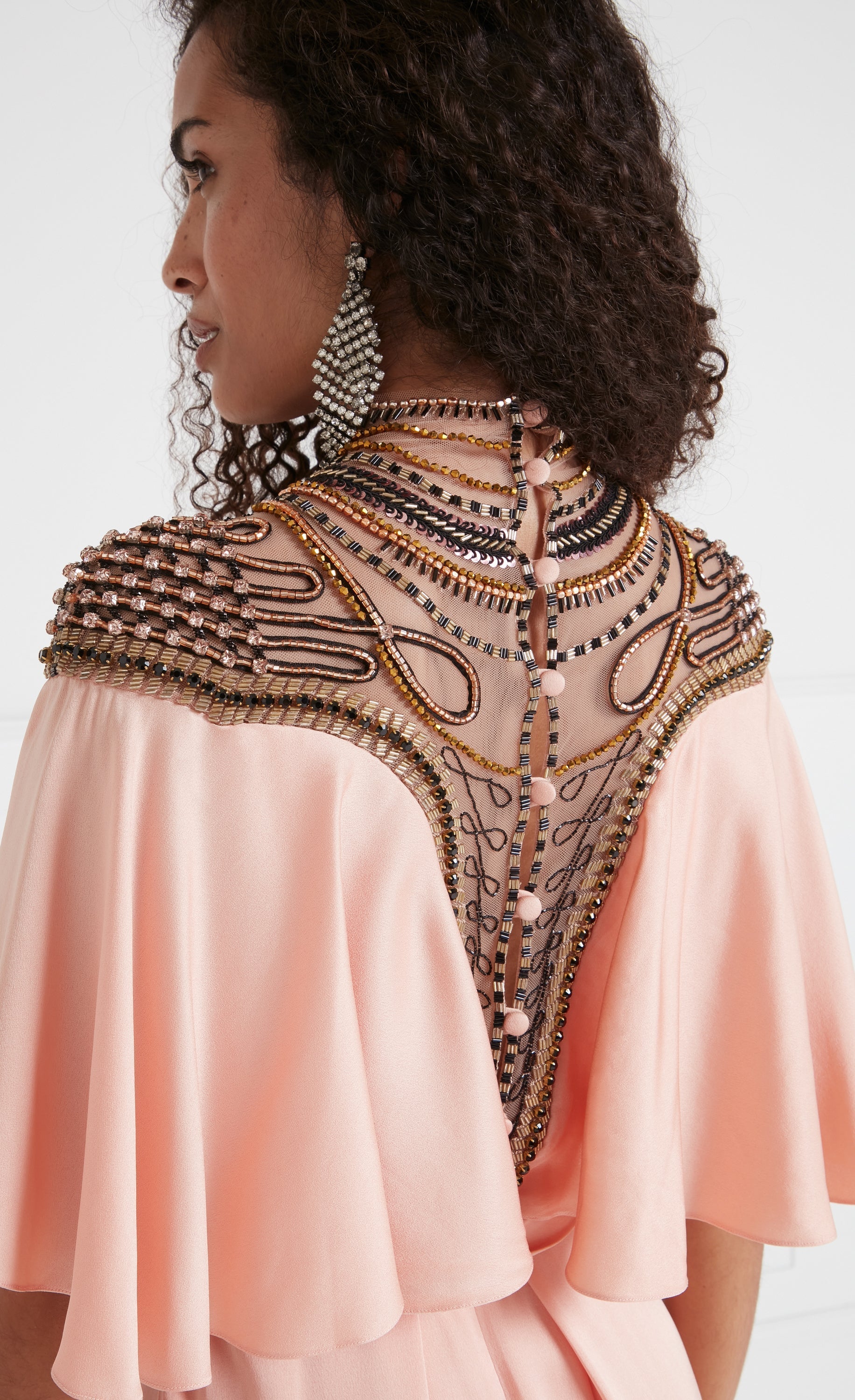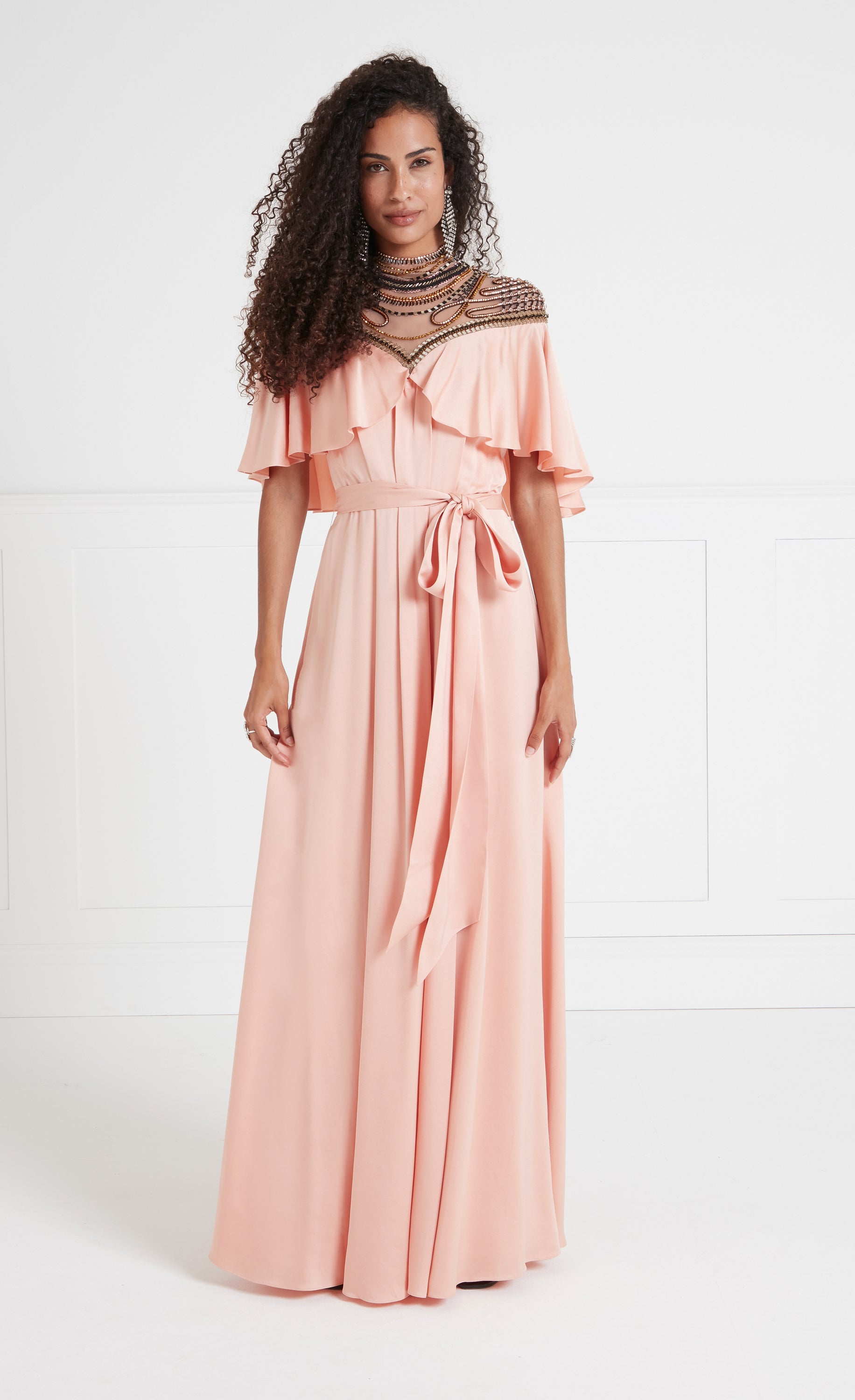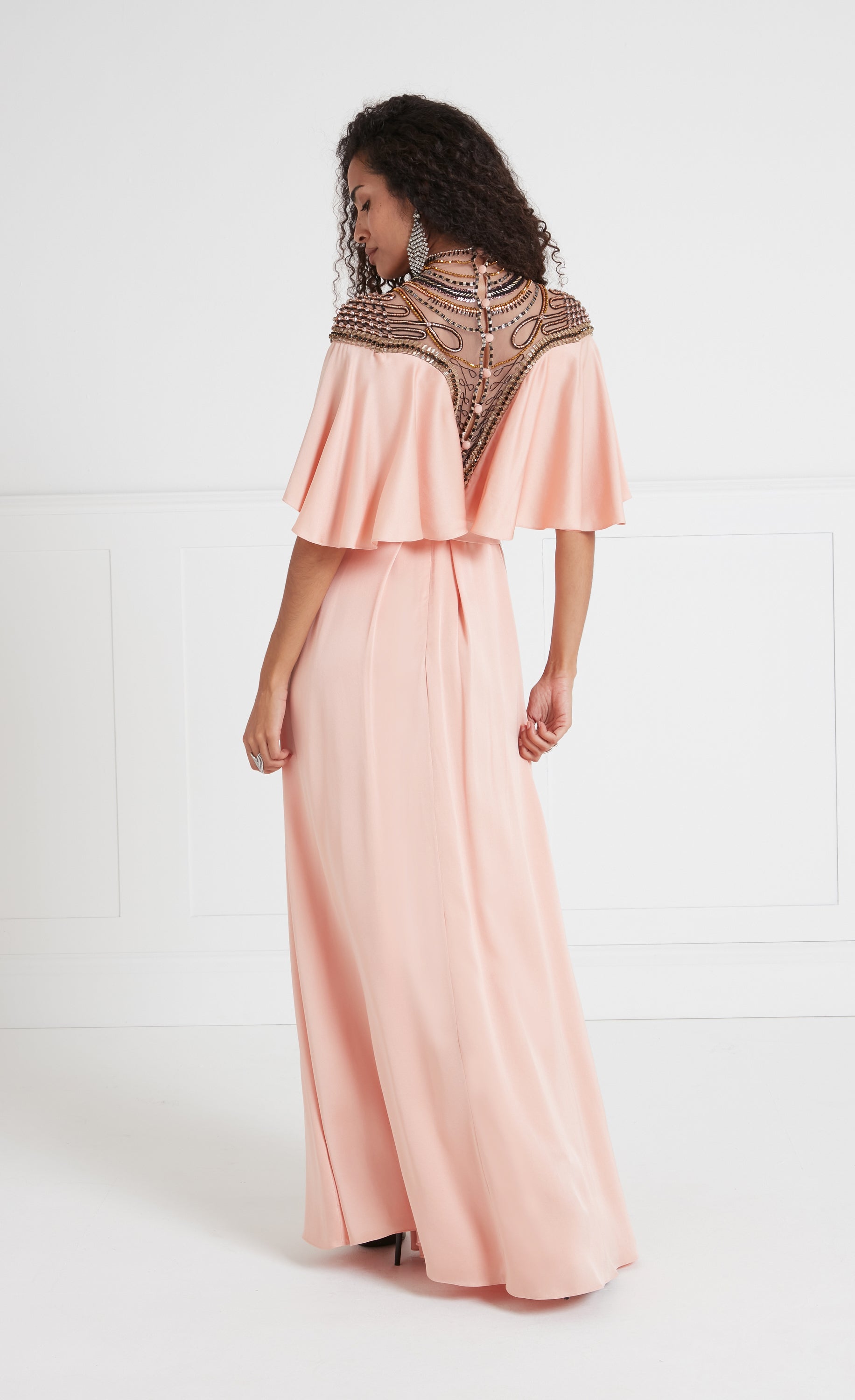 Paying homage to the eveningwear of the escapist era, the focal point of the Nina dress is the exquisite embellished yoke panelling: delicate beadwork on soft Italian illusion tulle contouring the d¨¦colletage, neck and shoulders, fastened with buttons at the spine. Stunning draping, creating a cape-like ruffle from the Bardot neckline, flowing to the floor-length hem, gives it an air of soft elegance.