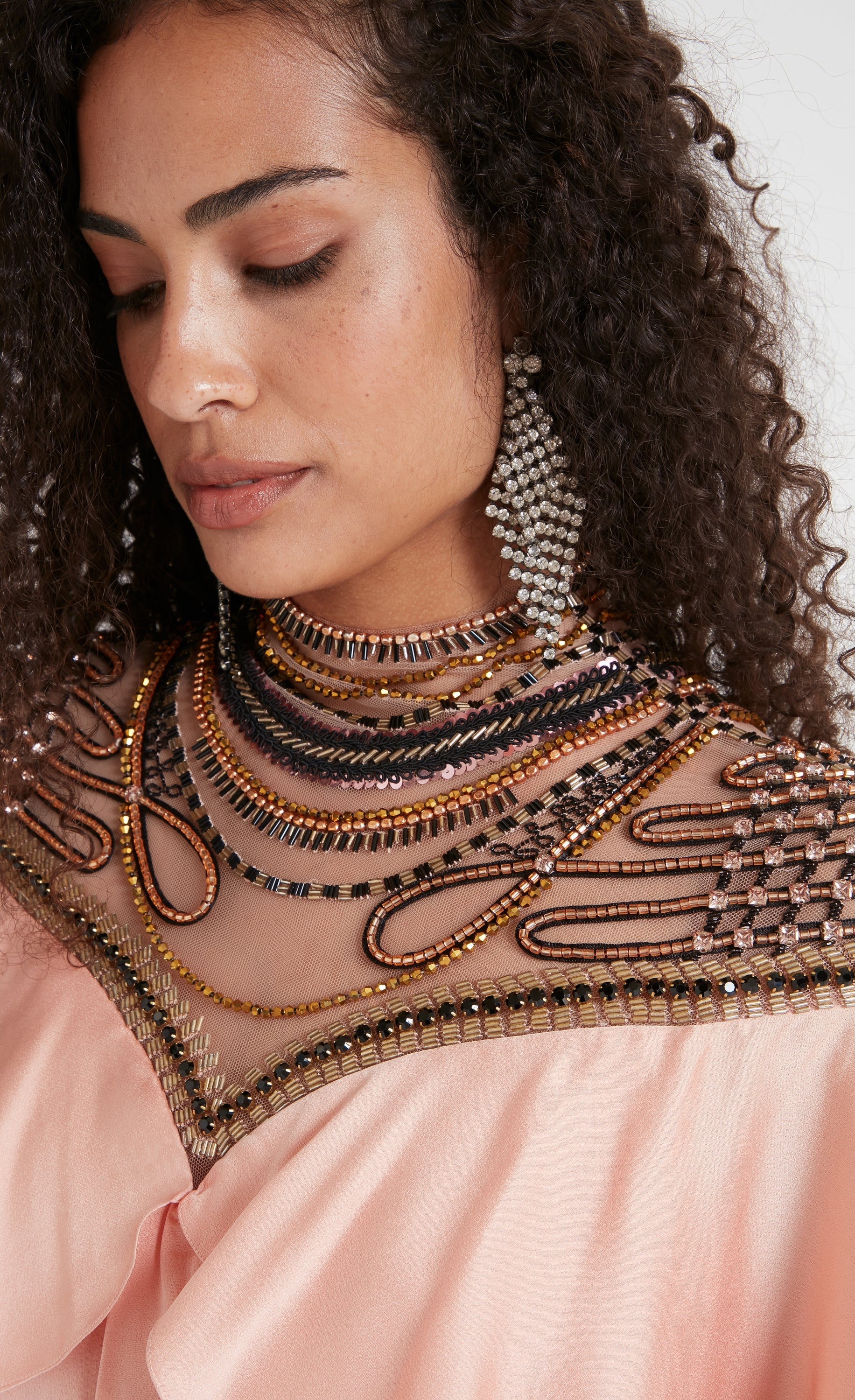 Embroidered yoke panelling in Italian illusion tulle