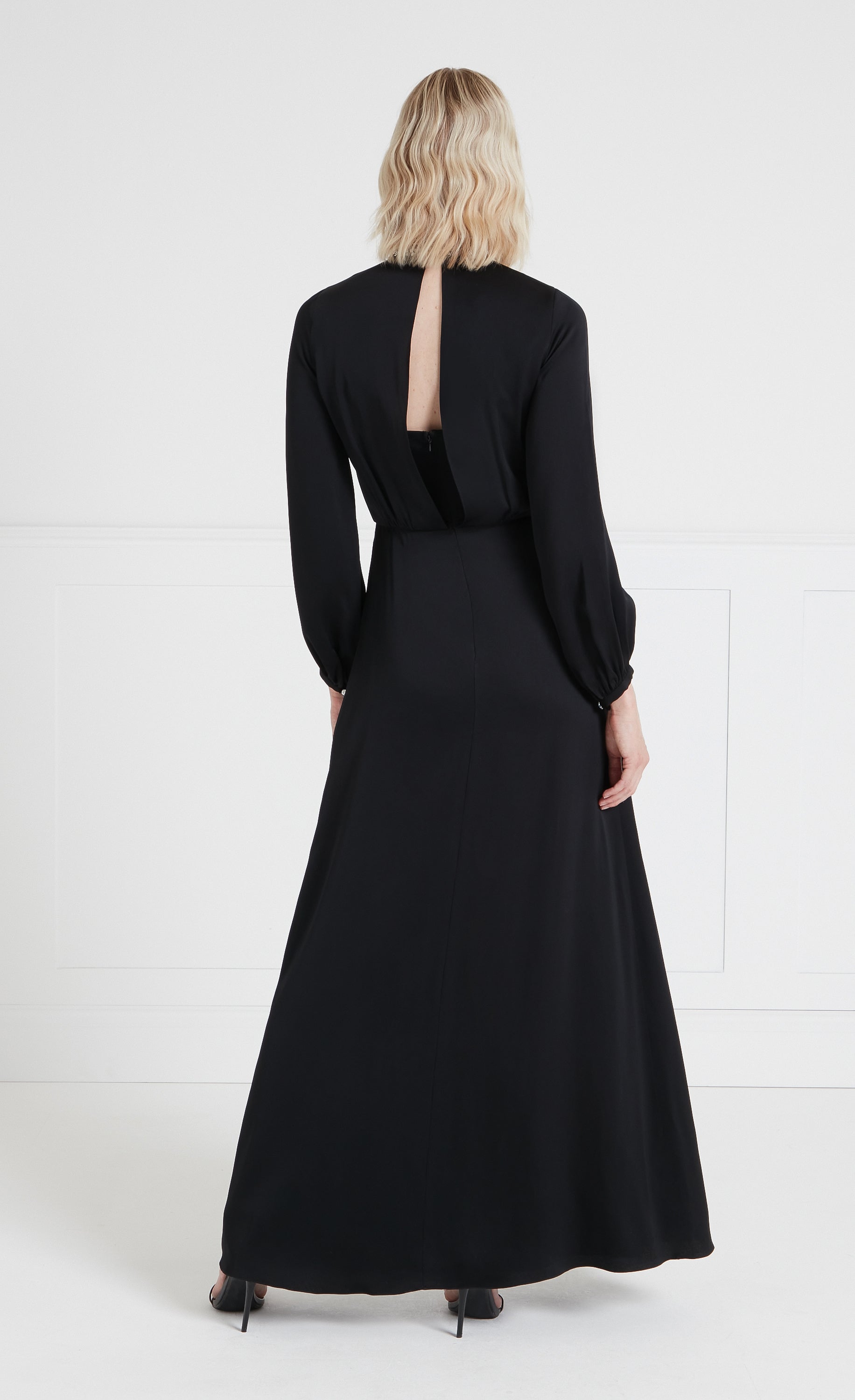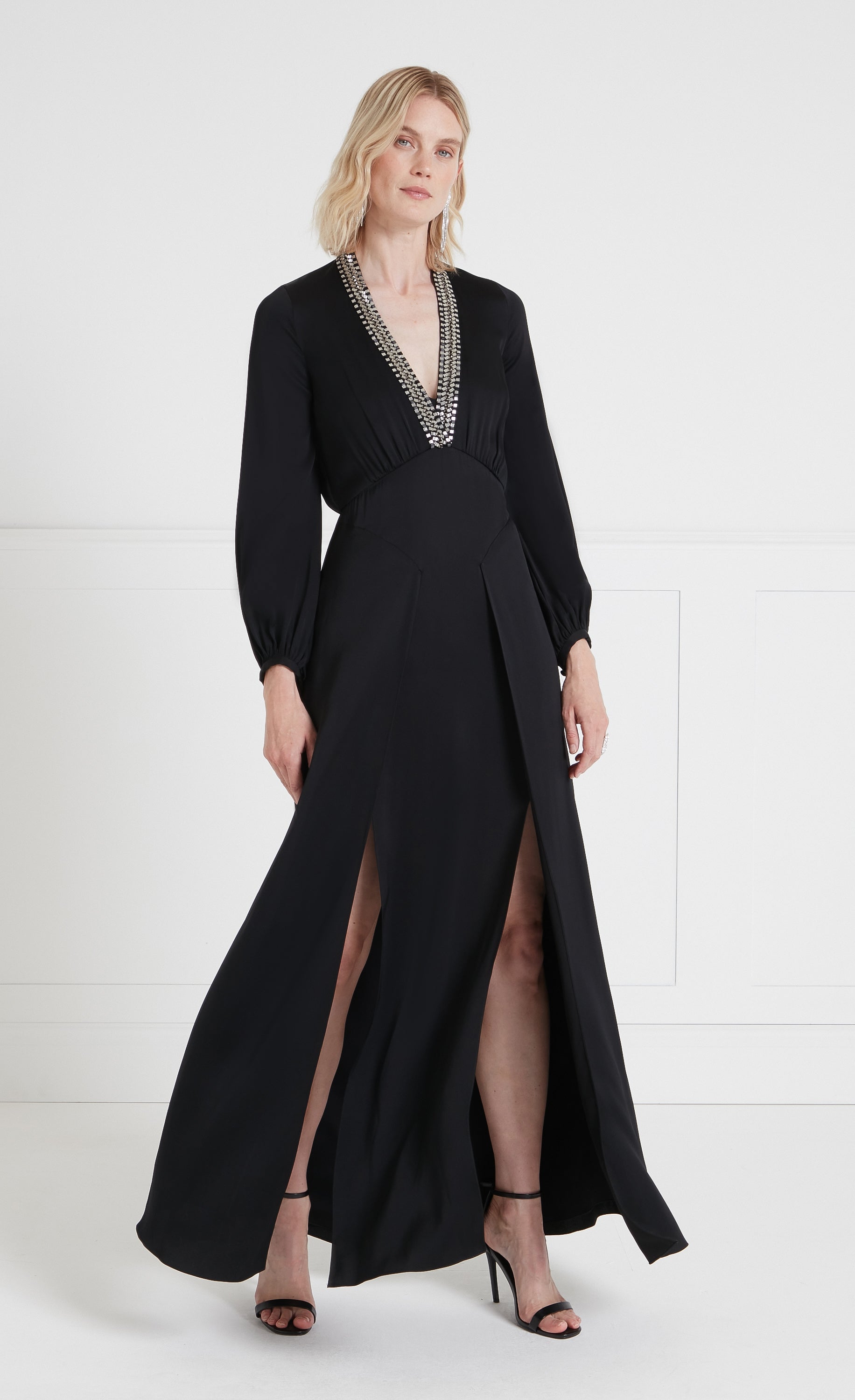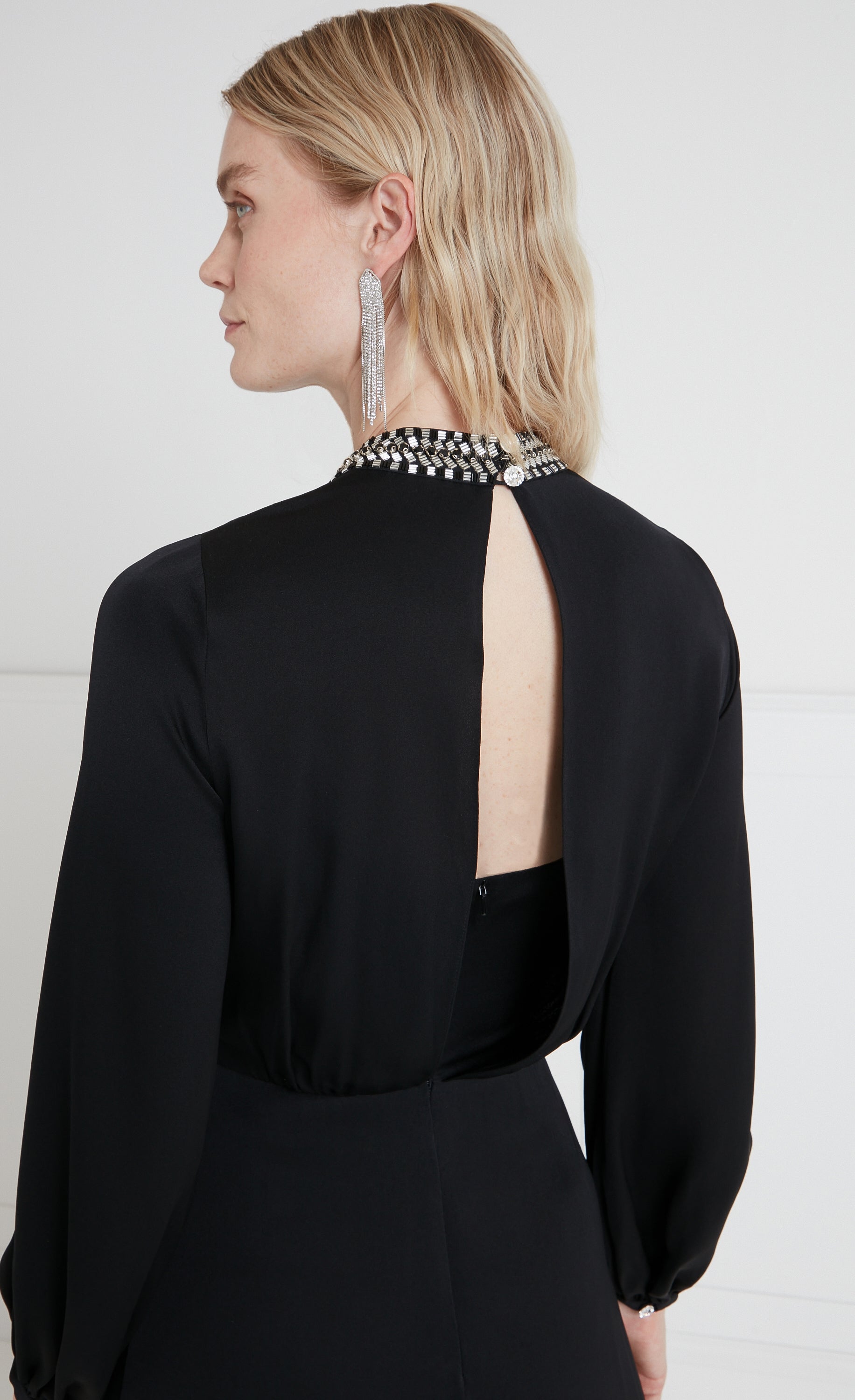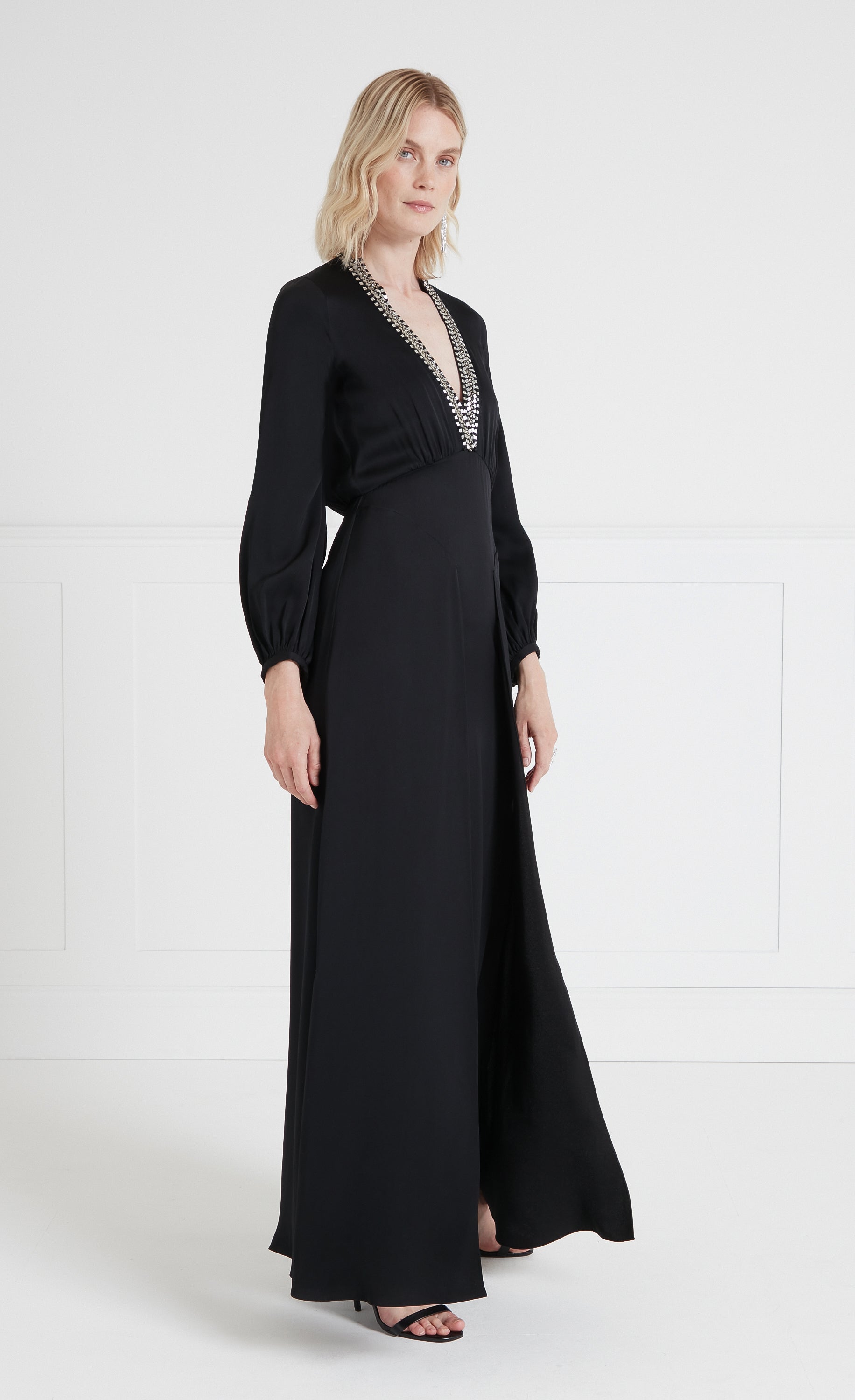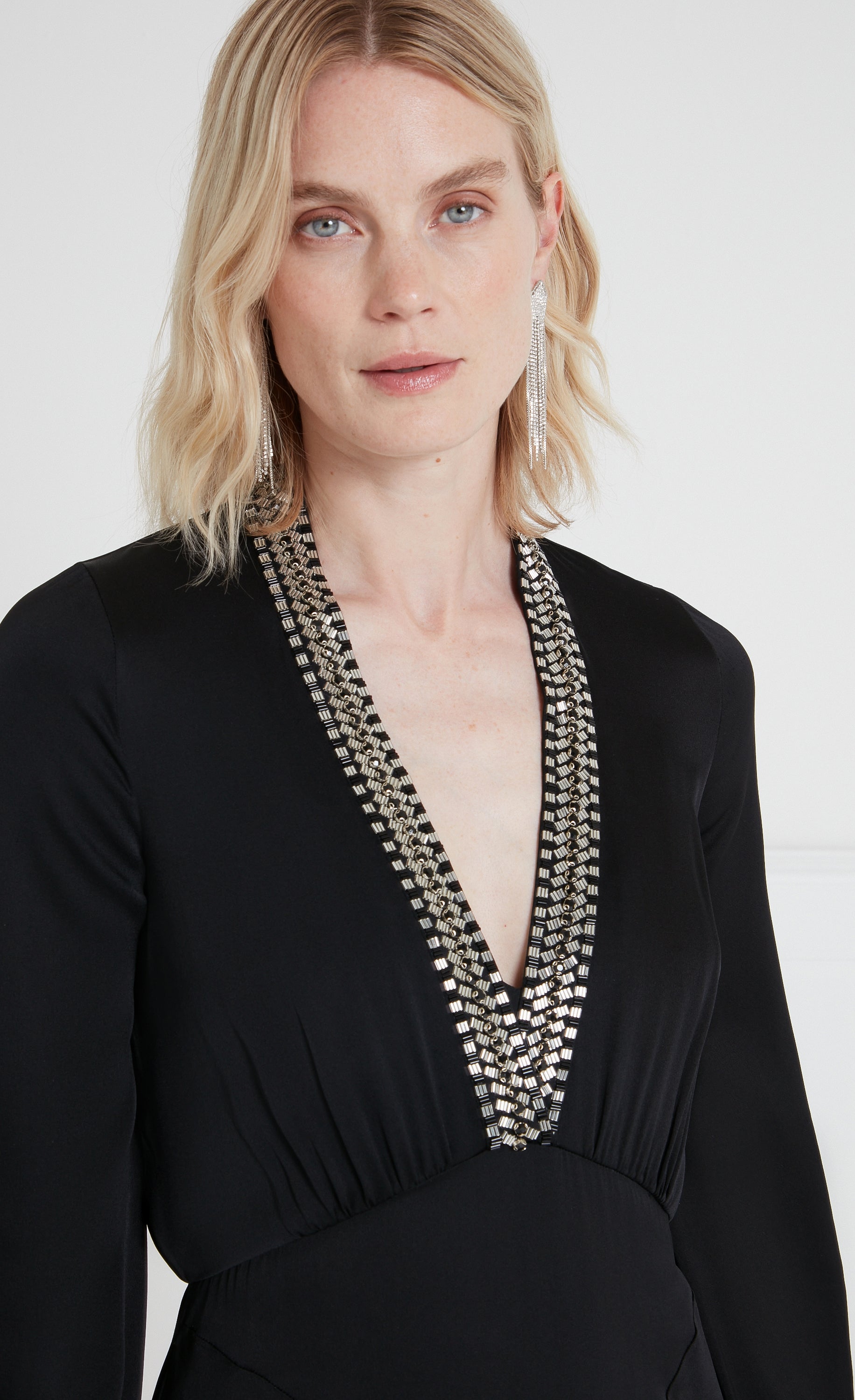 Radiating an air of soft romance, the Nina Sleeved Dress plays on the escapist era aesthetic: intricate embellishment framing the deep V-neckline, fastening at the nape of the neck to create a demure back cut-out, with neat button details achieving an immaculately polished finish.