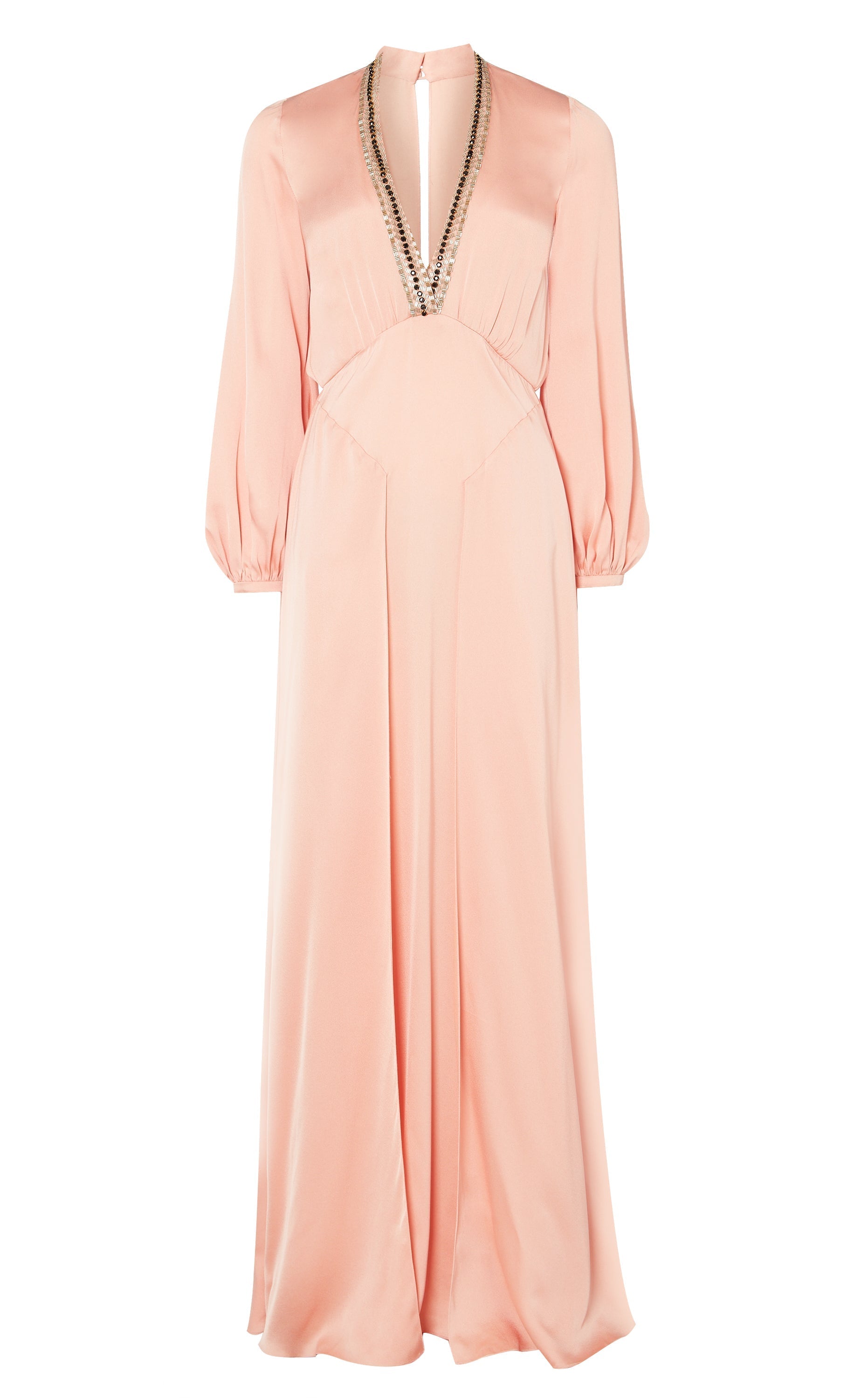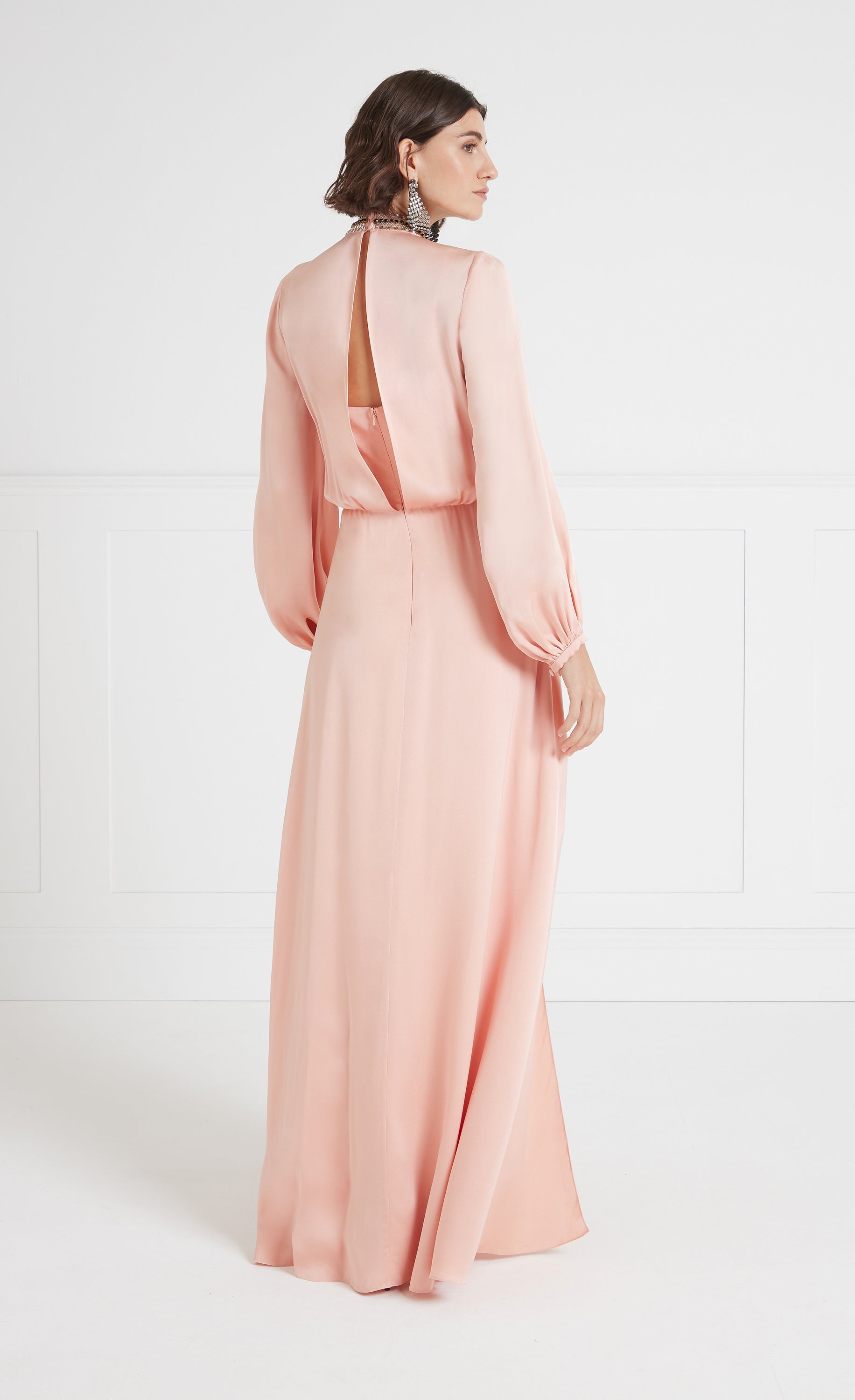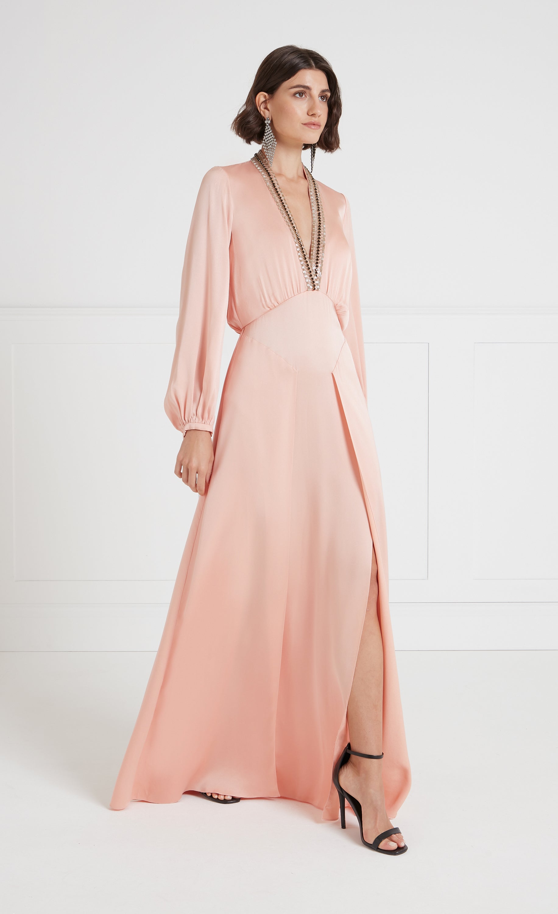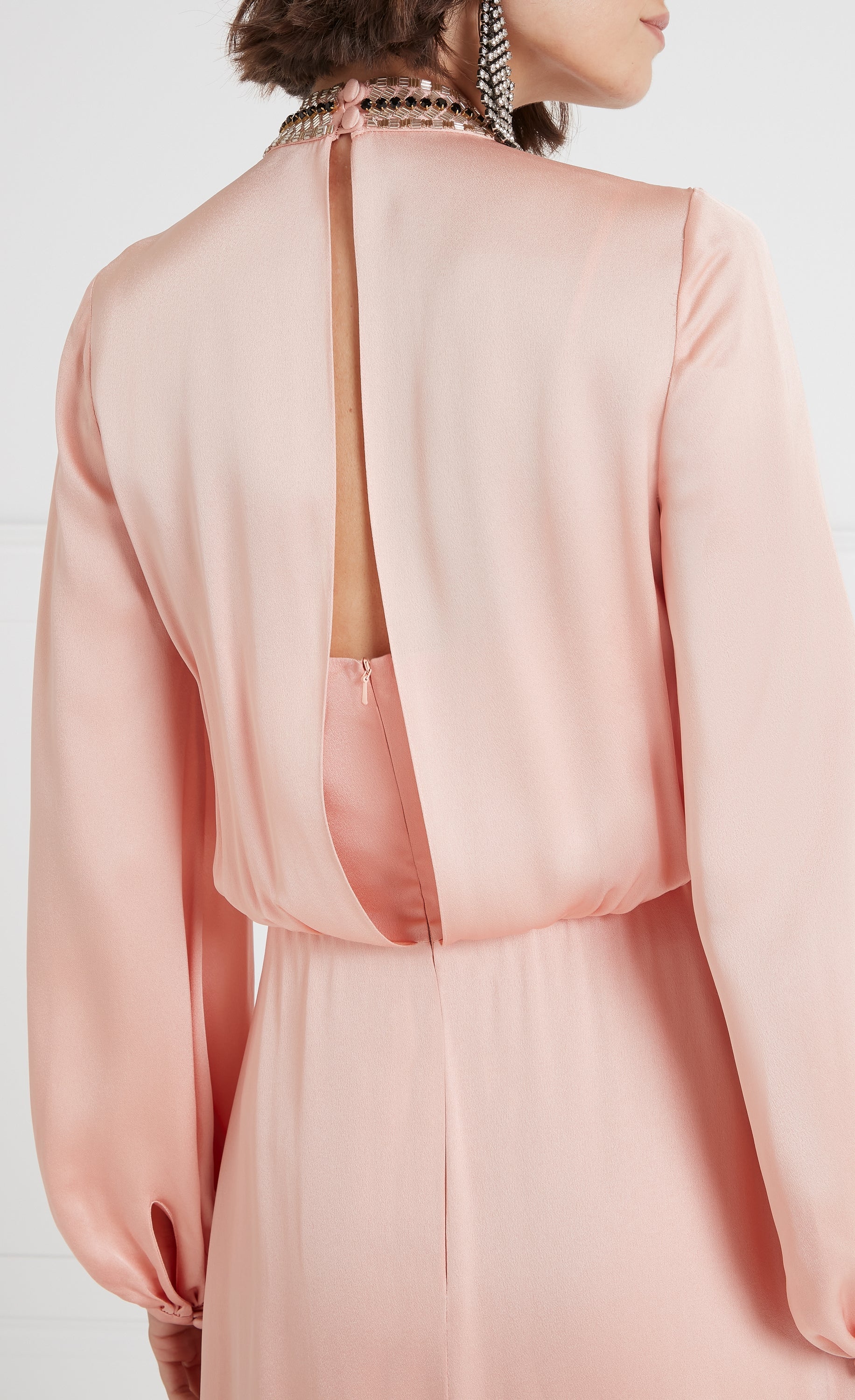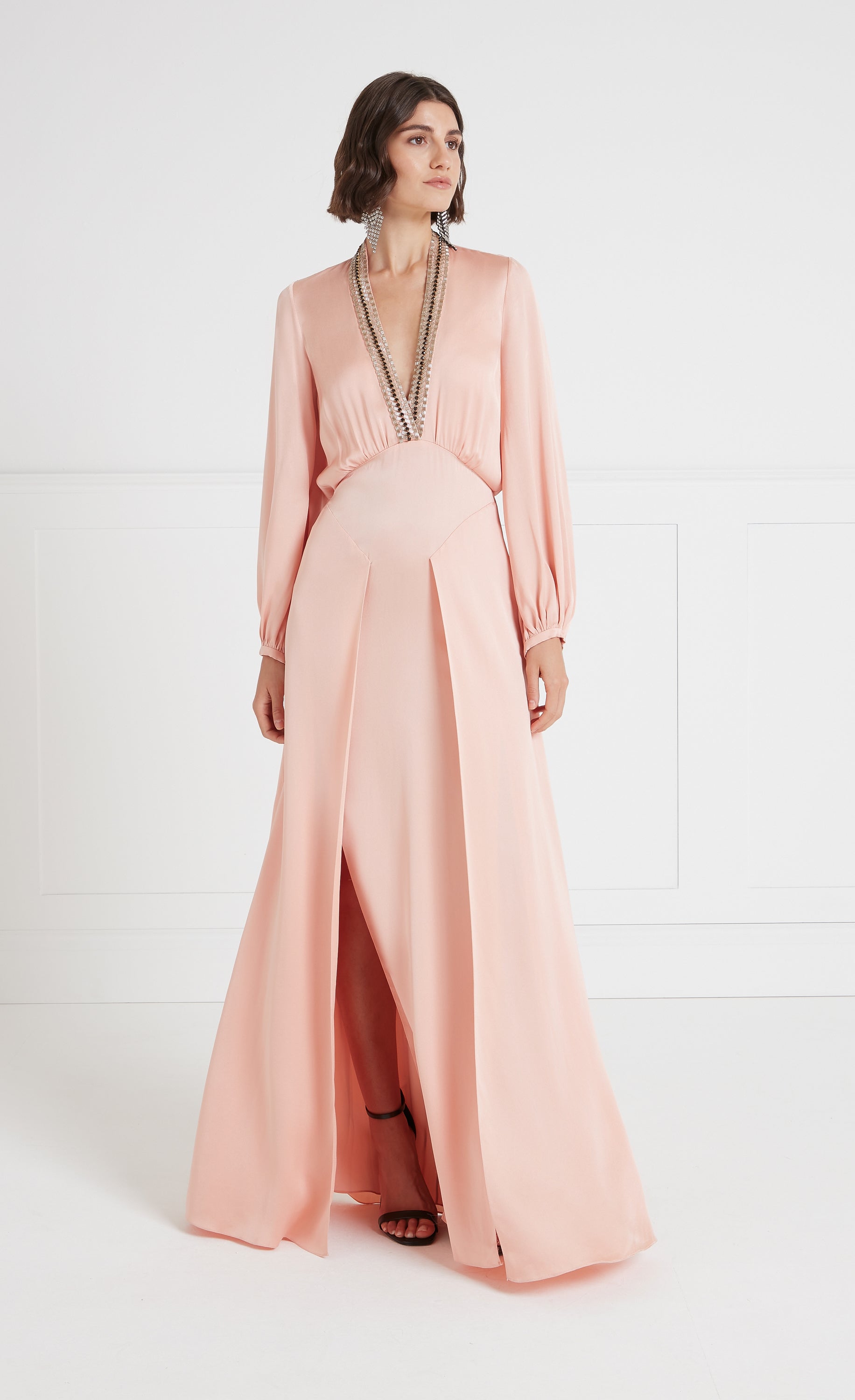 Radiating an air of soft romance, the Nina Sleeved Dress plays on the escapist era aesthetic: intricate embellishment framing the deep V-neckline, fastening at the nape of the neck to create a demure back cut-out, with neat button details achieving an immaculately polished finish.
