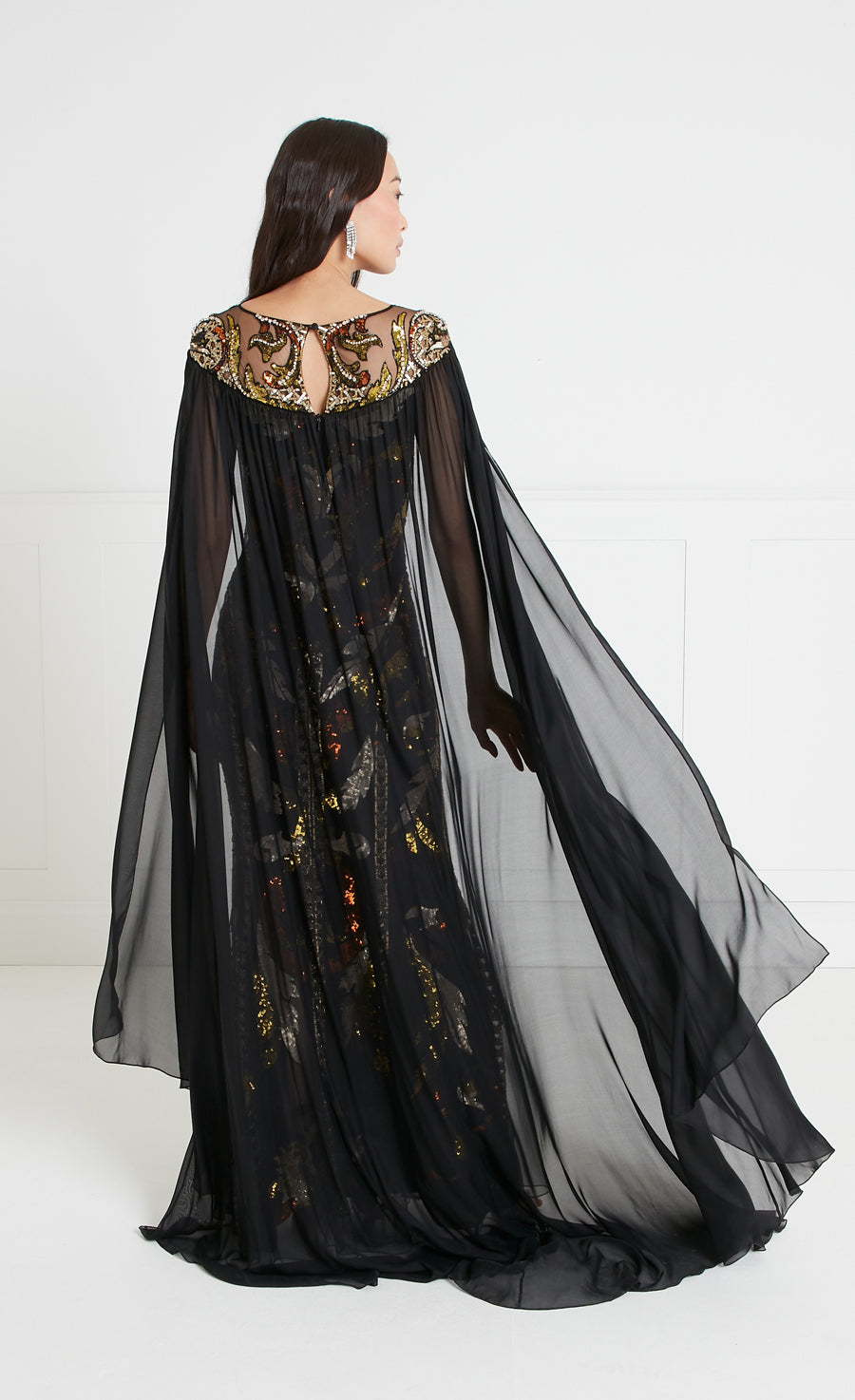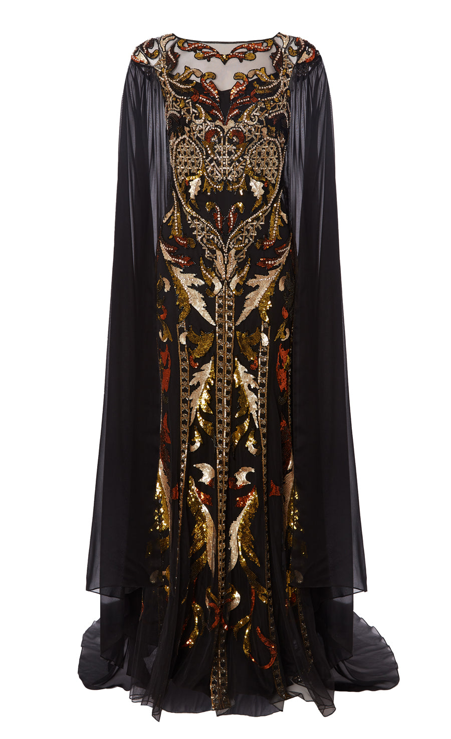 The Novella story is a picture of unfettered drama, showcasing the brand¡¯s signature embellishment: exquisite basketry weave-inspired lattice bugle beadwork interwoven by filigree vine and leaf motifs, enhancing the feminine shape and fluid movement of this spectacular design. Made from soft Italian tulle in black and rosewater, available with or without a cape.