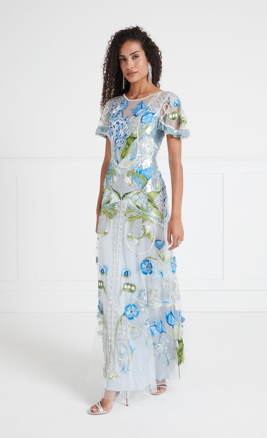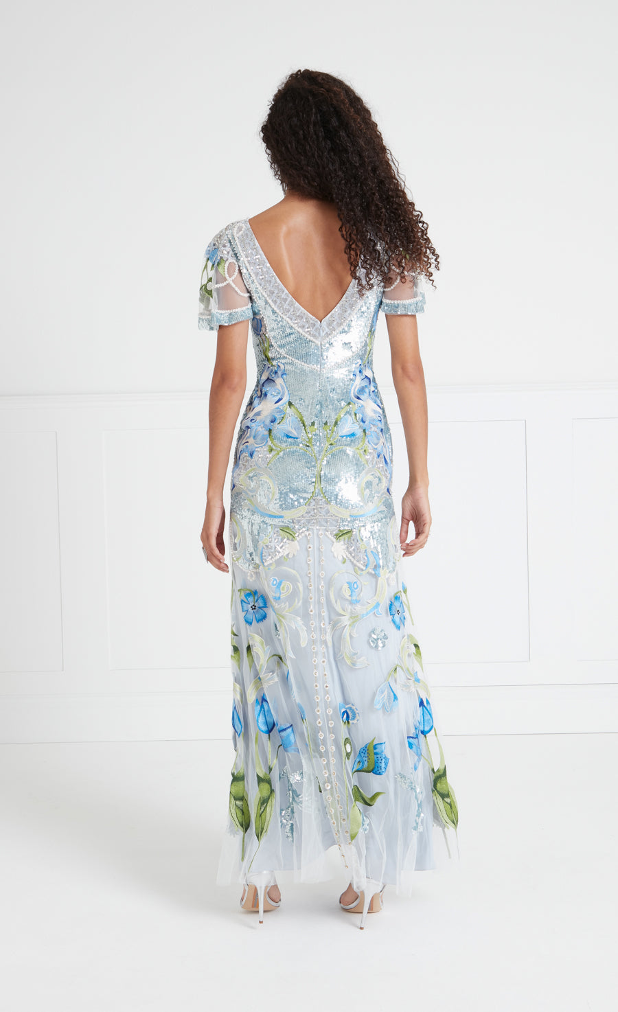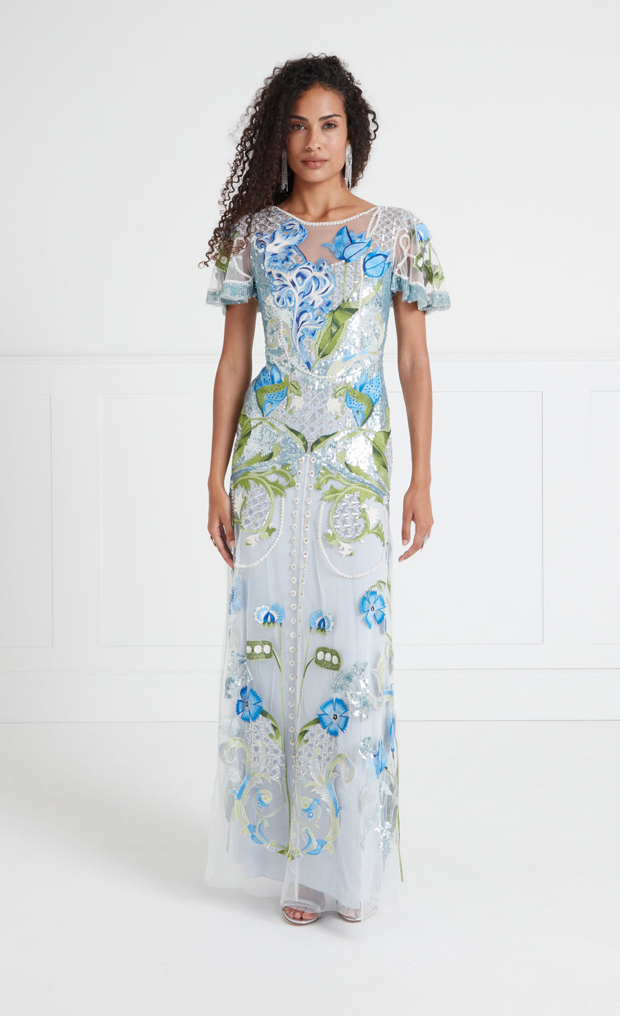 Fusing decadent detailing with influence from Italian painter Botticelli¡¯s controversial masterpiece Primavera, this gown has been reimagined with Tudor, rose garden-inspired apothecary motifs and bright fresco-style florals.