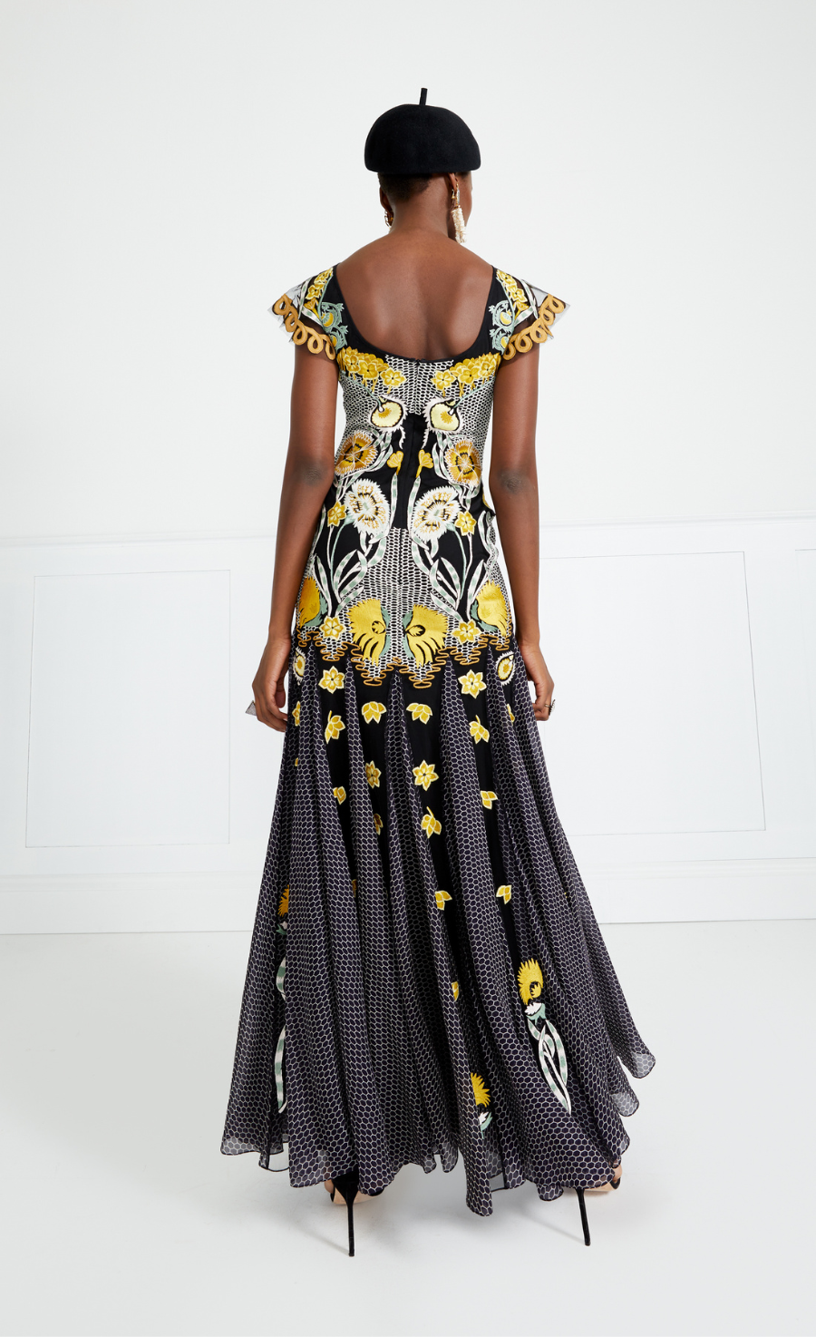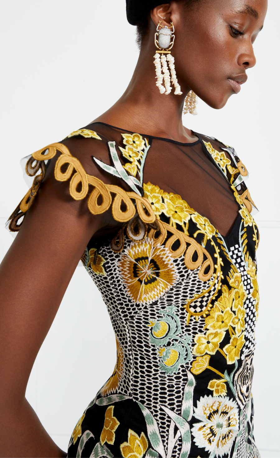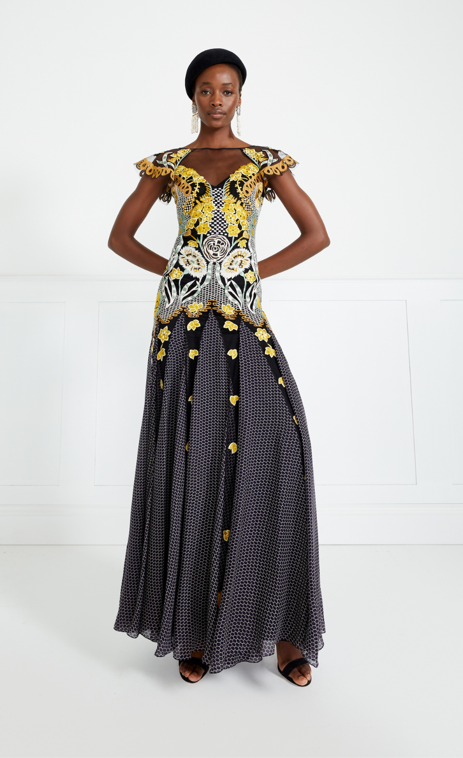 This hand guided stitch-embroidered group takes inspiration from the interlinking bouquets of flowers found on traditional suzanis and lattice elements found in Persian textiles. Mixing trompe l¡¯oeil, delicate elements with silhouette-like cut out graphics, gives a fresh take on a Temperley classic. It channels the idea of contrast, which runs throughout the collection,
