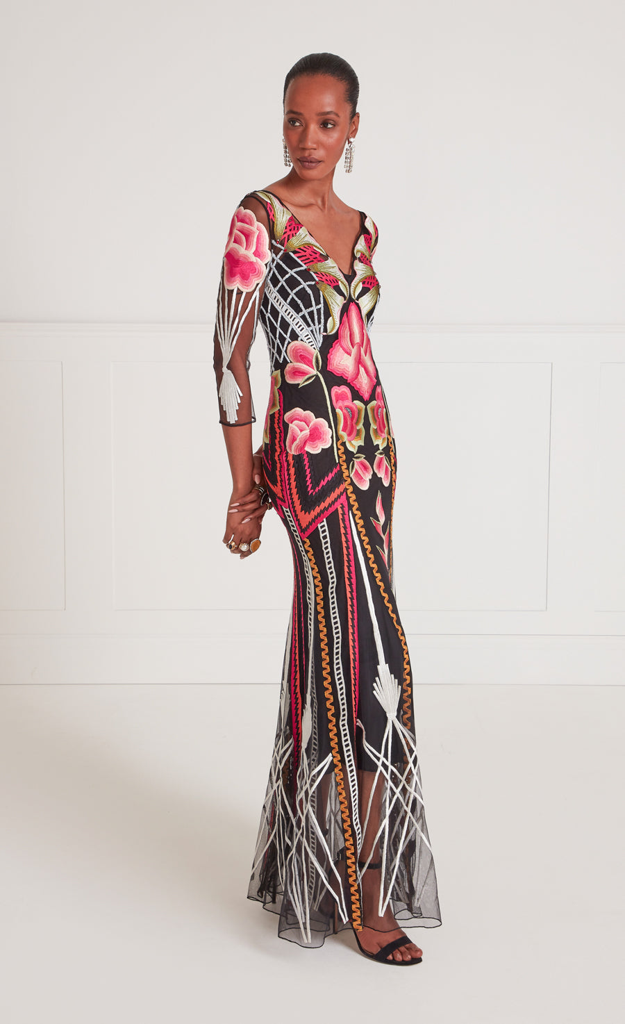 The Romina Story showcases a Temperley signature: exquisite hand-guided stitch embroidery. Composed of Pueblo florals, bouquets of ornate Calla lilies intertwine with trompe l¡¯oeil woven and lace detailing, inspired by ceremonial flowers and graphic Mexican serape blankets.