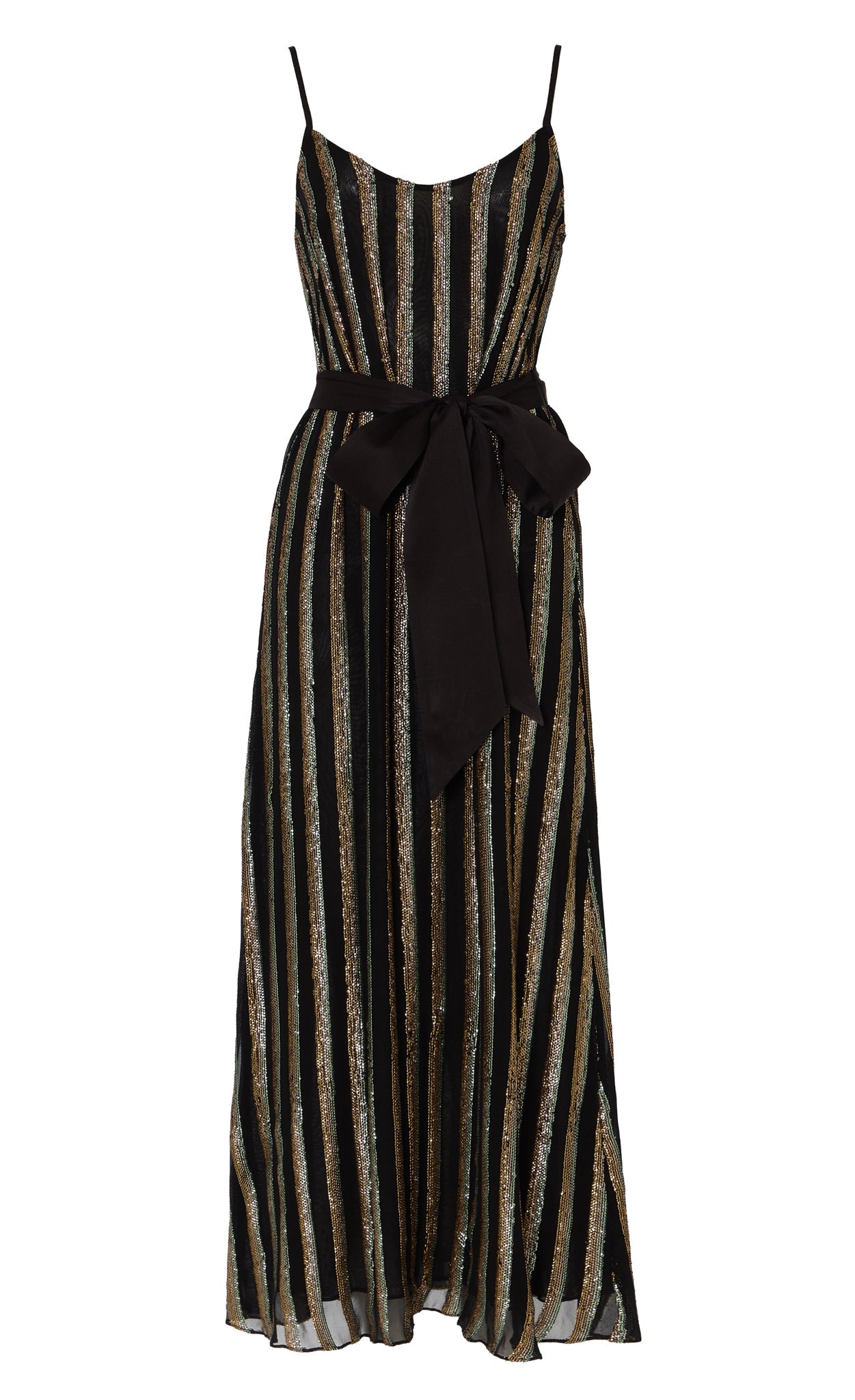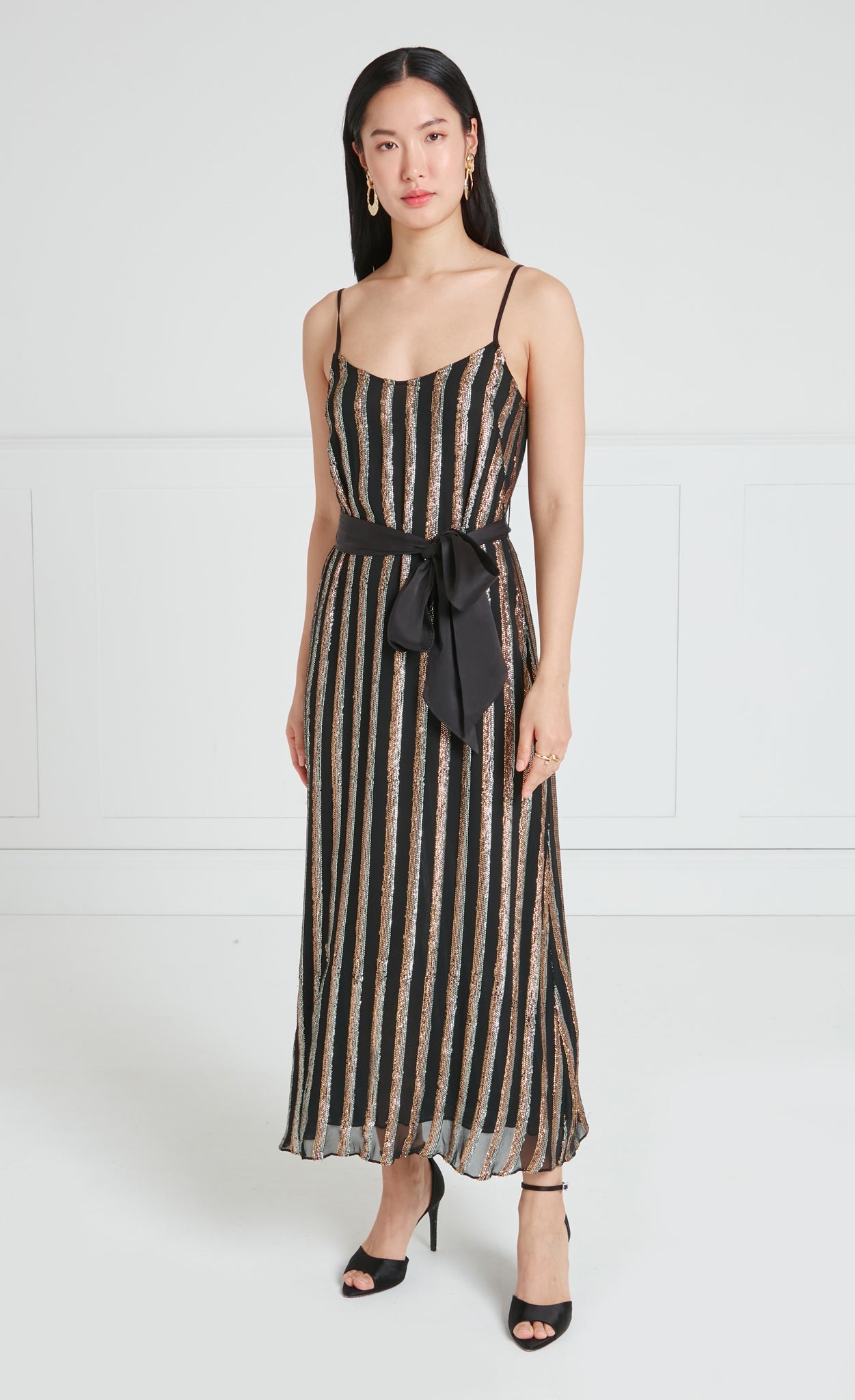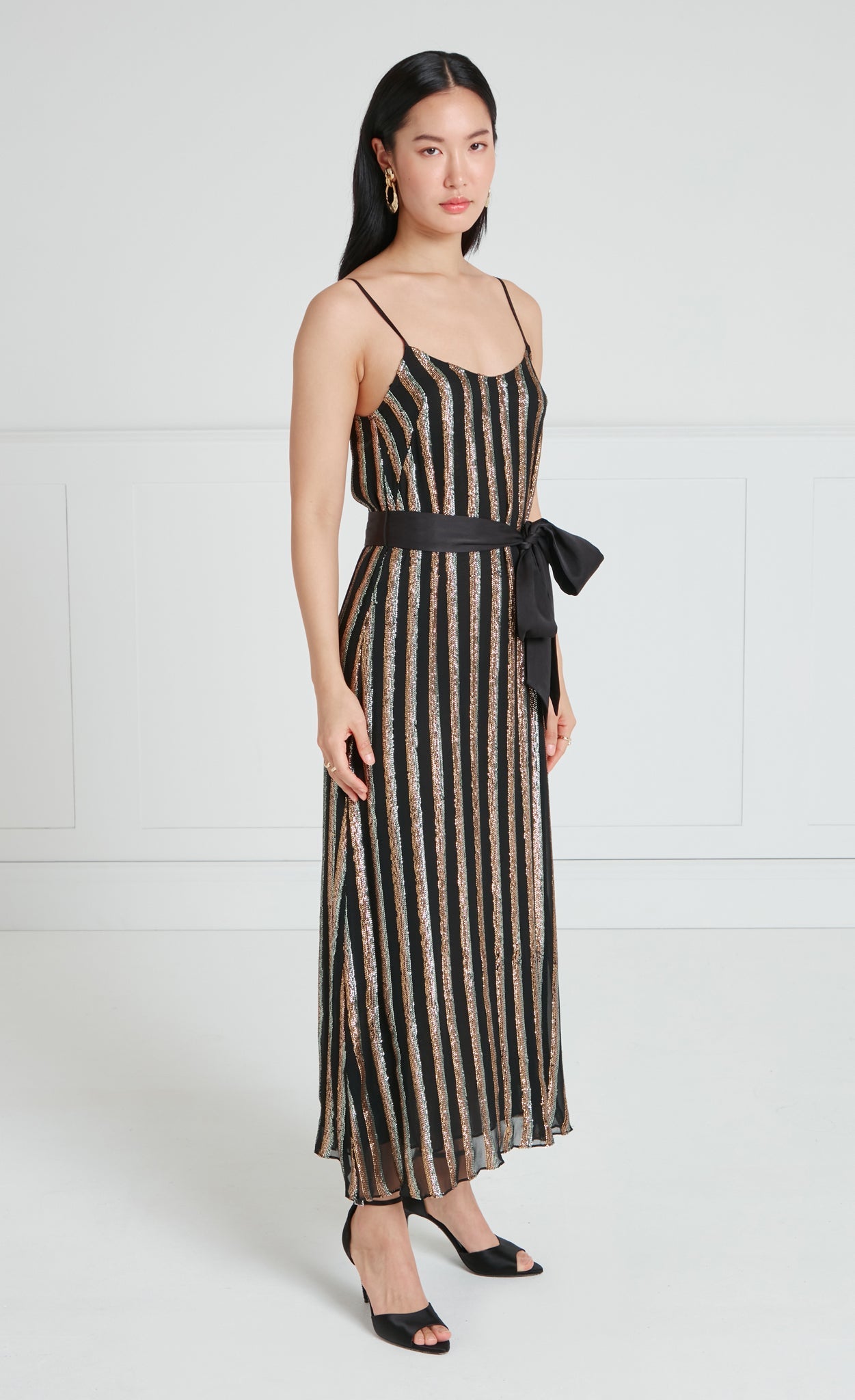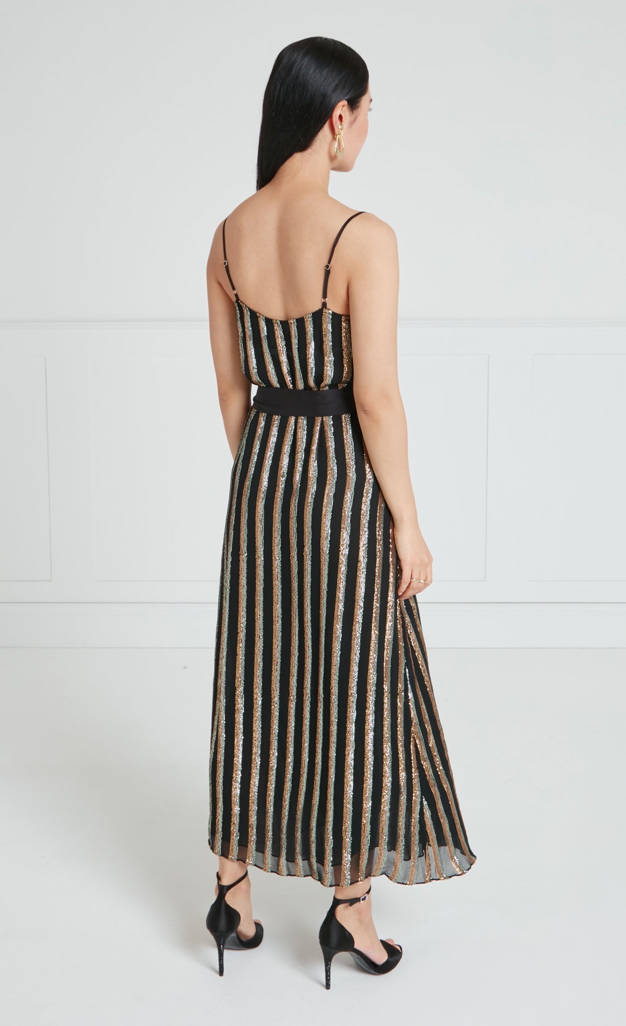This story showcases dazzling vertical sequin stripes, applied on a lightweight georgette base that offers soft airyness and subtle fluidity. Perfect for lively evening settings or cocktail events, this dress offers effortless party-ready dressing.
