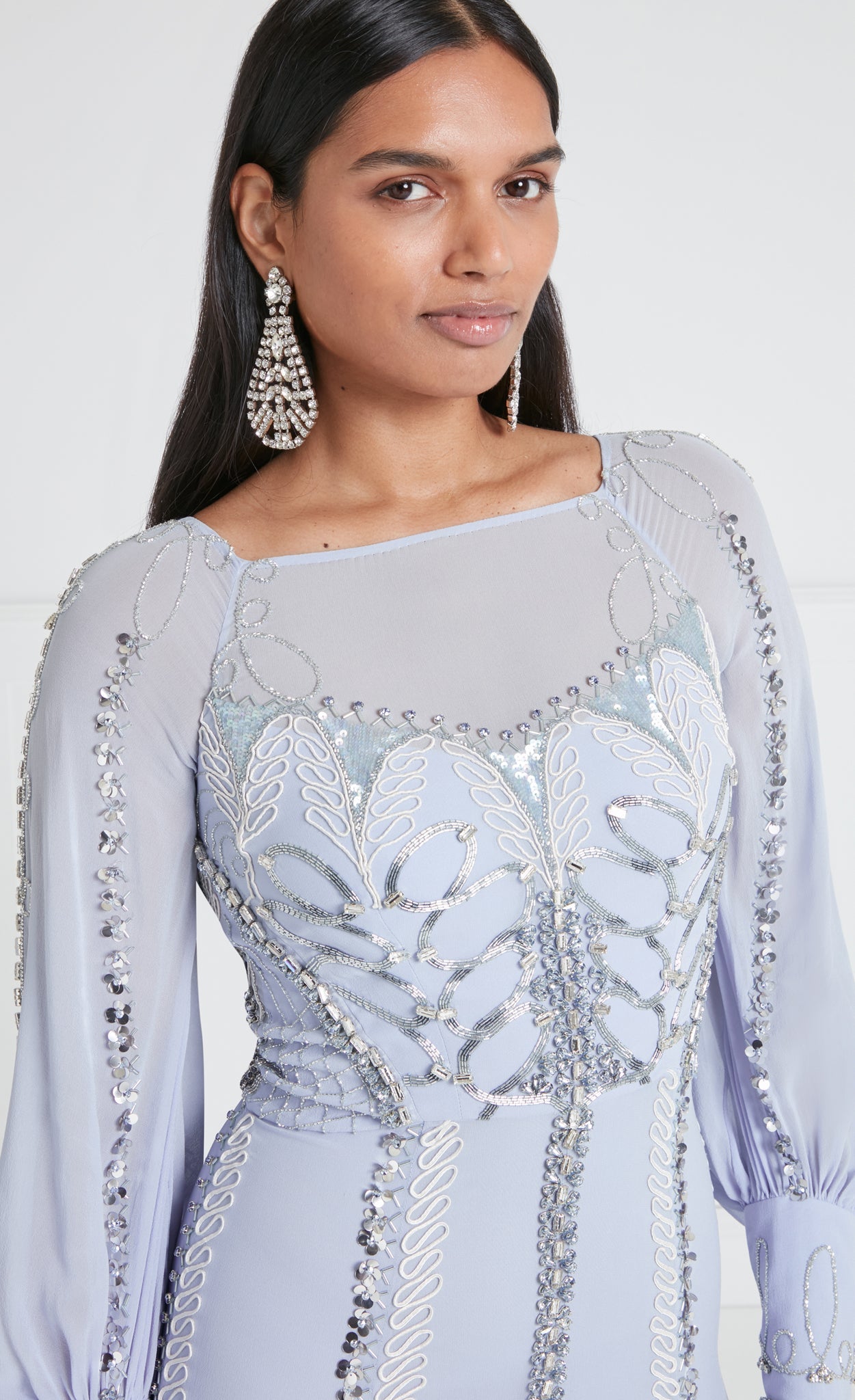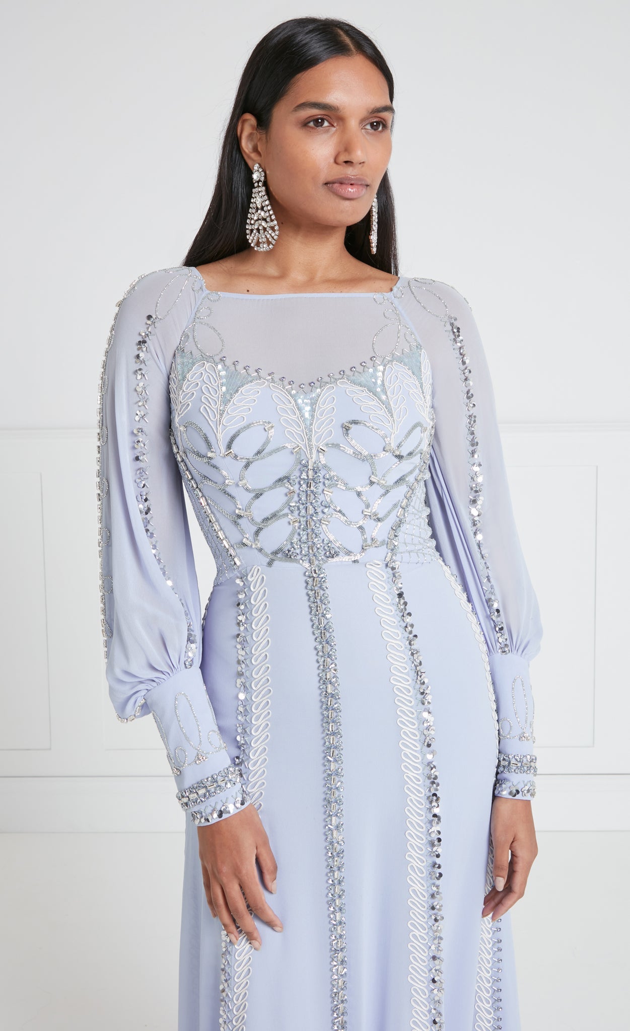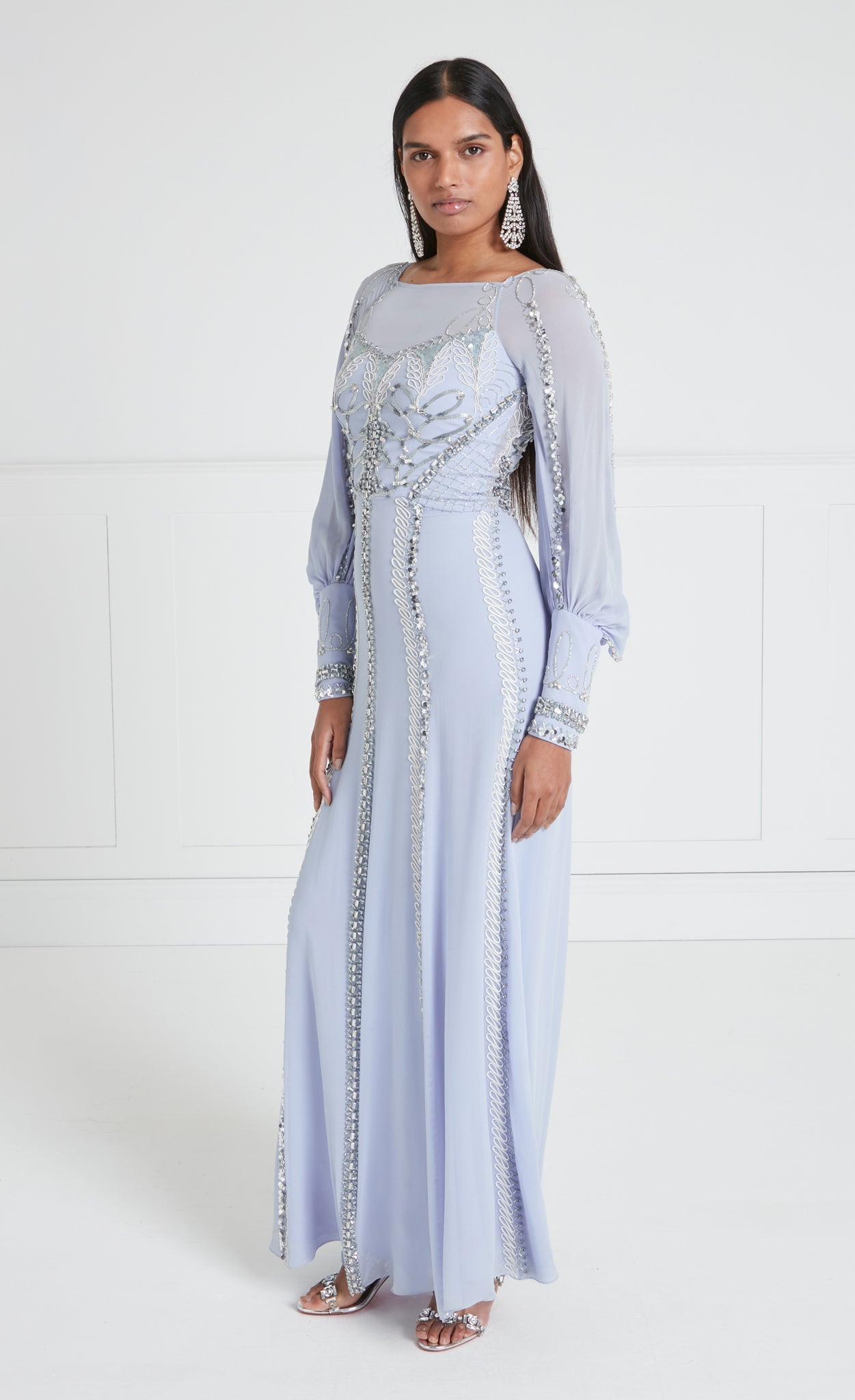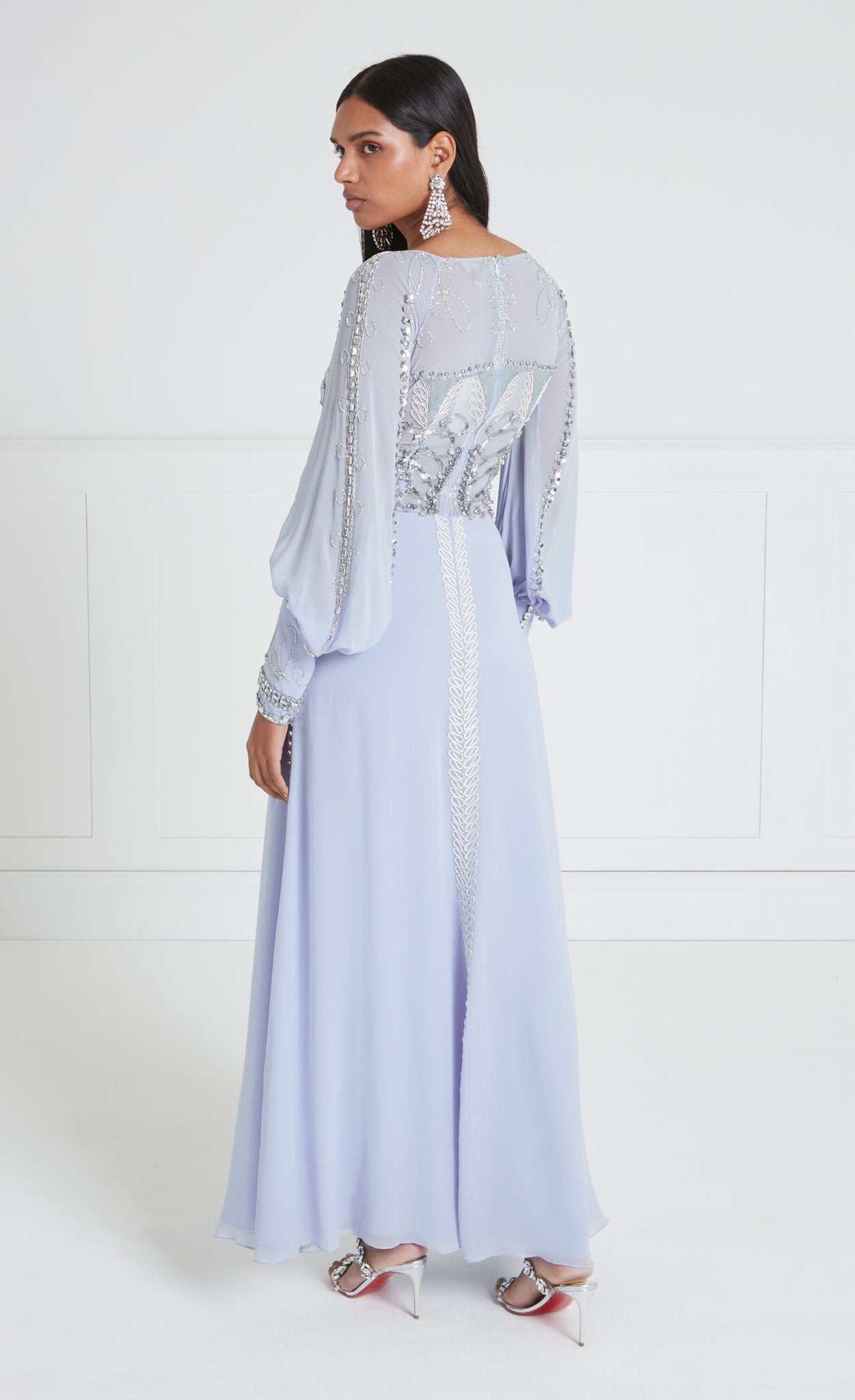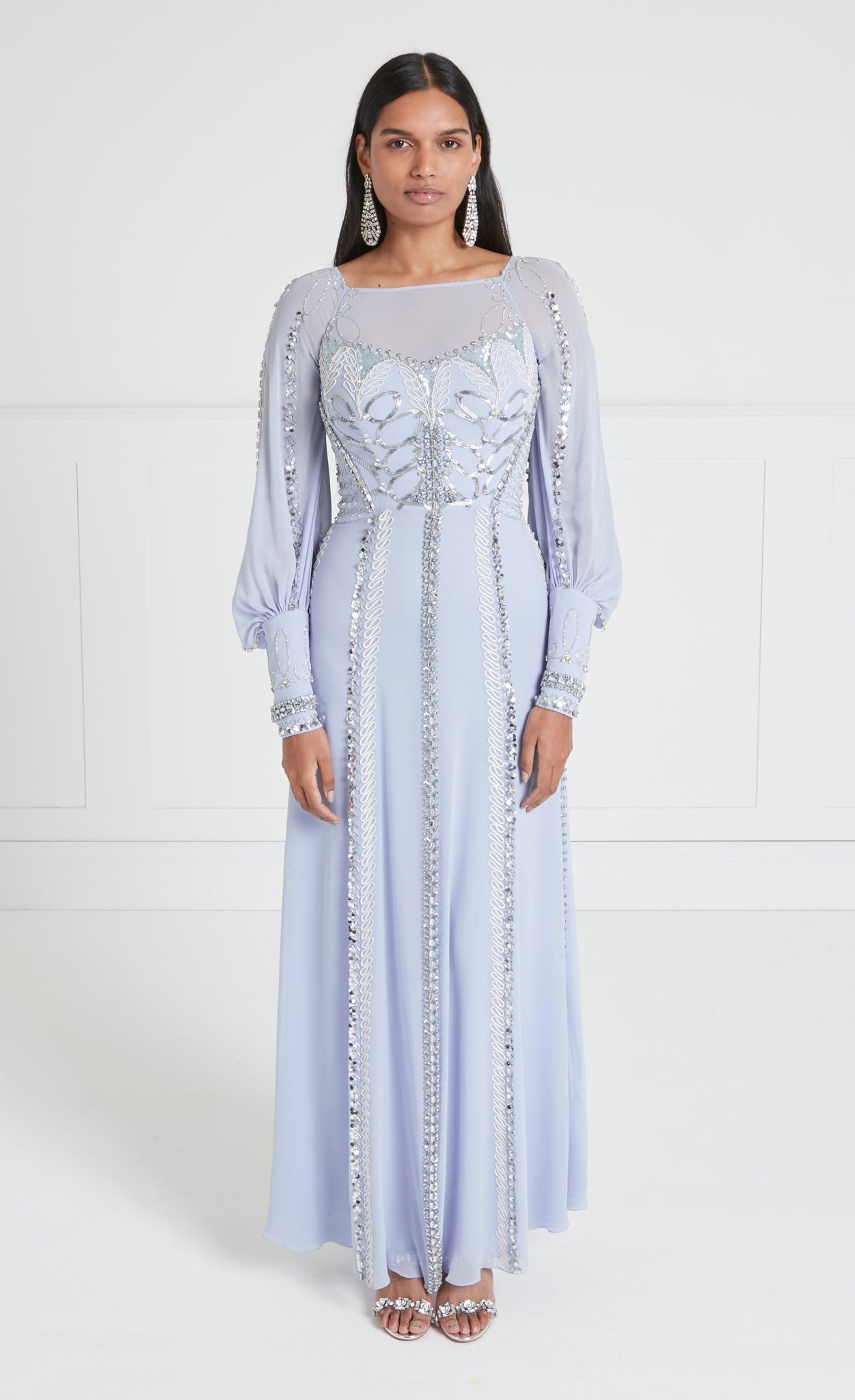 Exude sophisticated elegance in the embellished Sofia Gown; a modest floor-length dress with billowing balloon sleeves. Layers upon layers of crepe satin and light georgette create effortless airy movement.