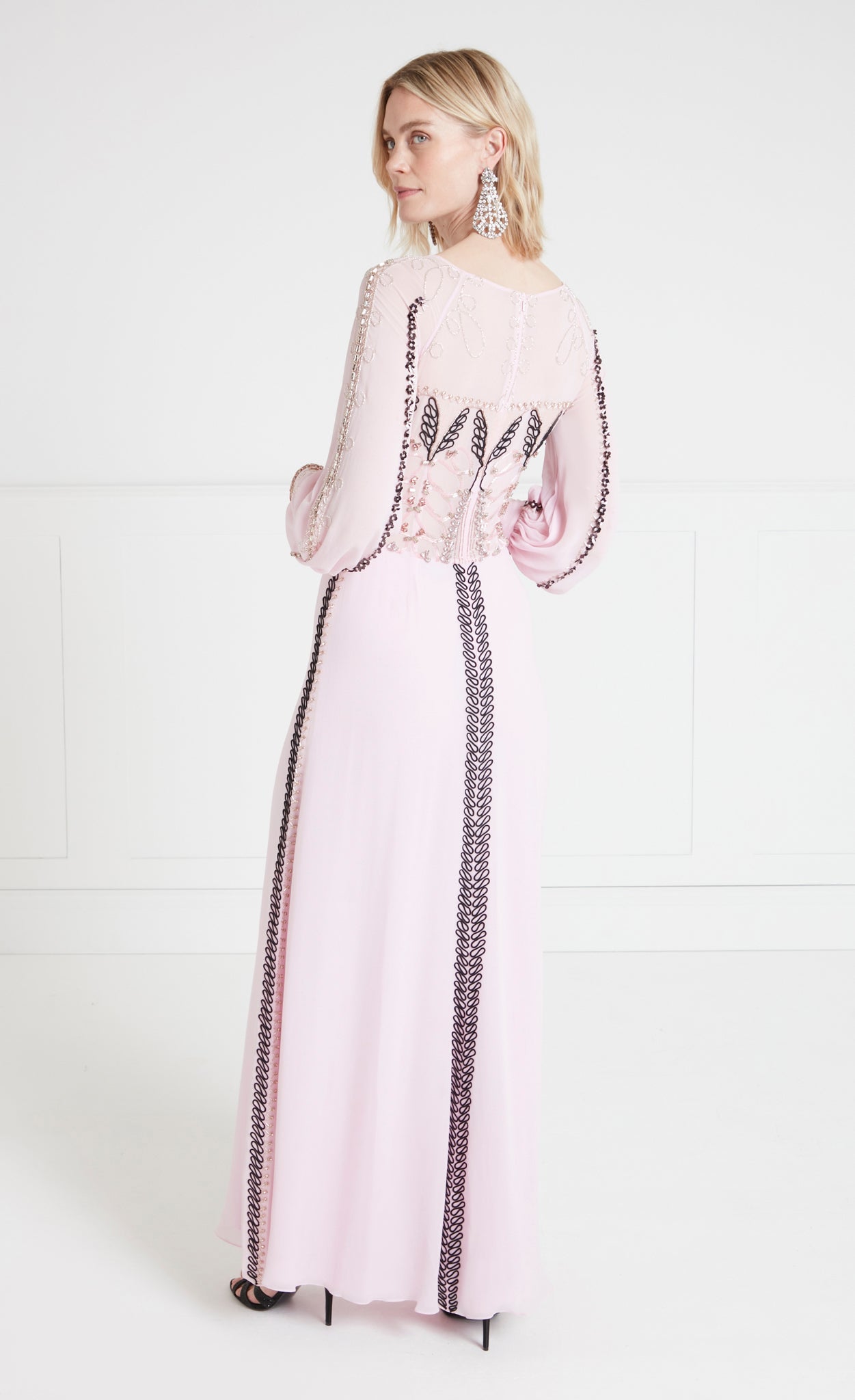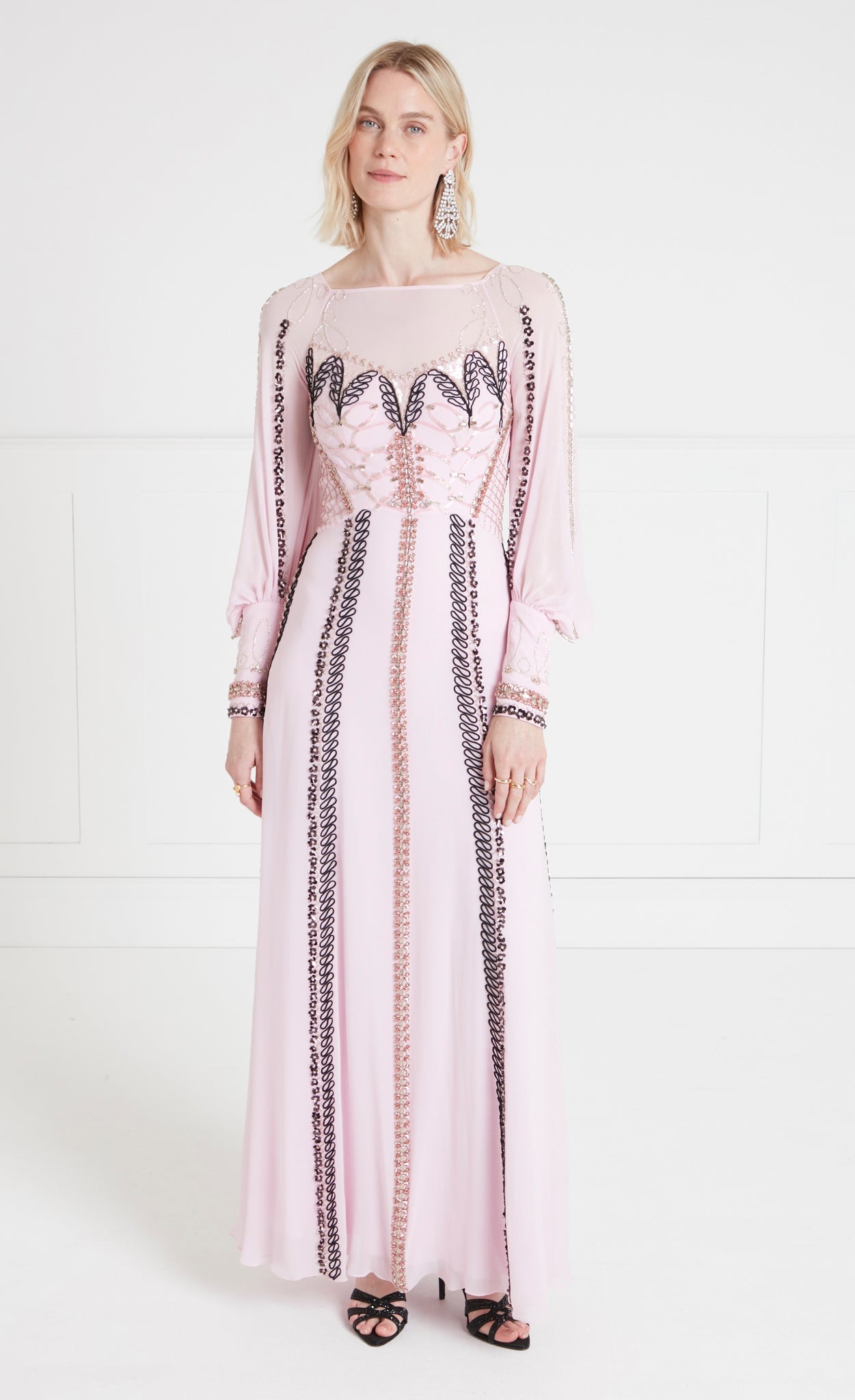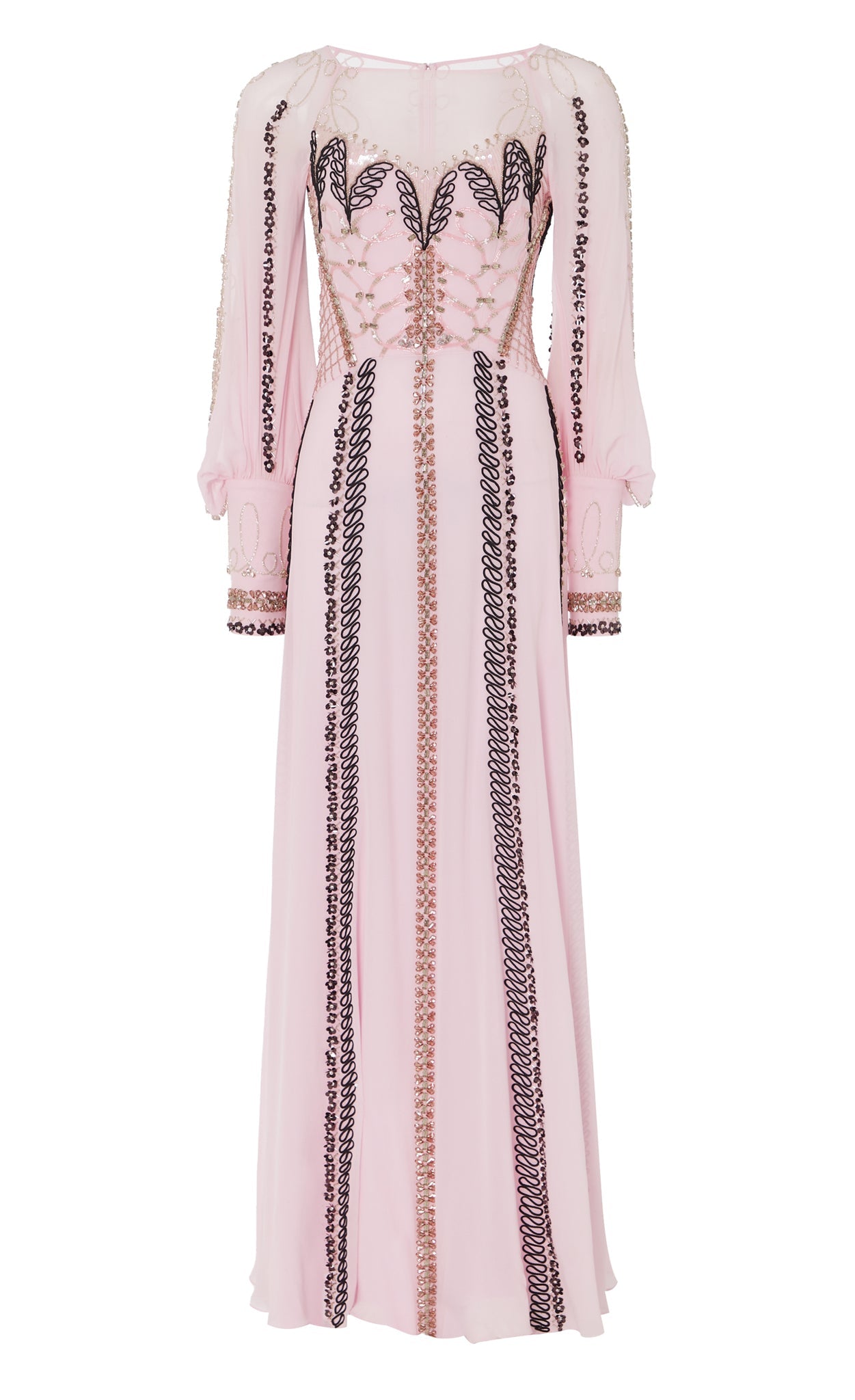 Exude sophisticated elegance in the embellished Sofia Gown; a modest floor-length dress with billowing balloon sleeves. Layers upon layers of crepe satin and light georgette create effortless airy movement.