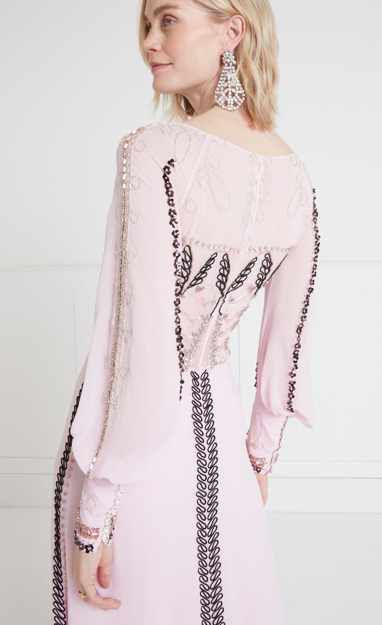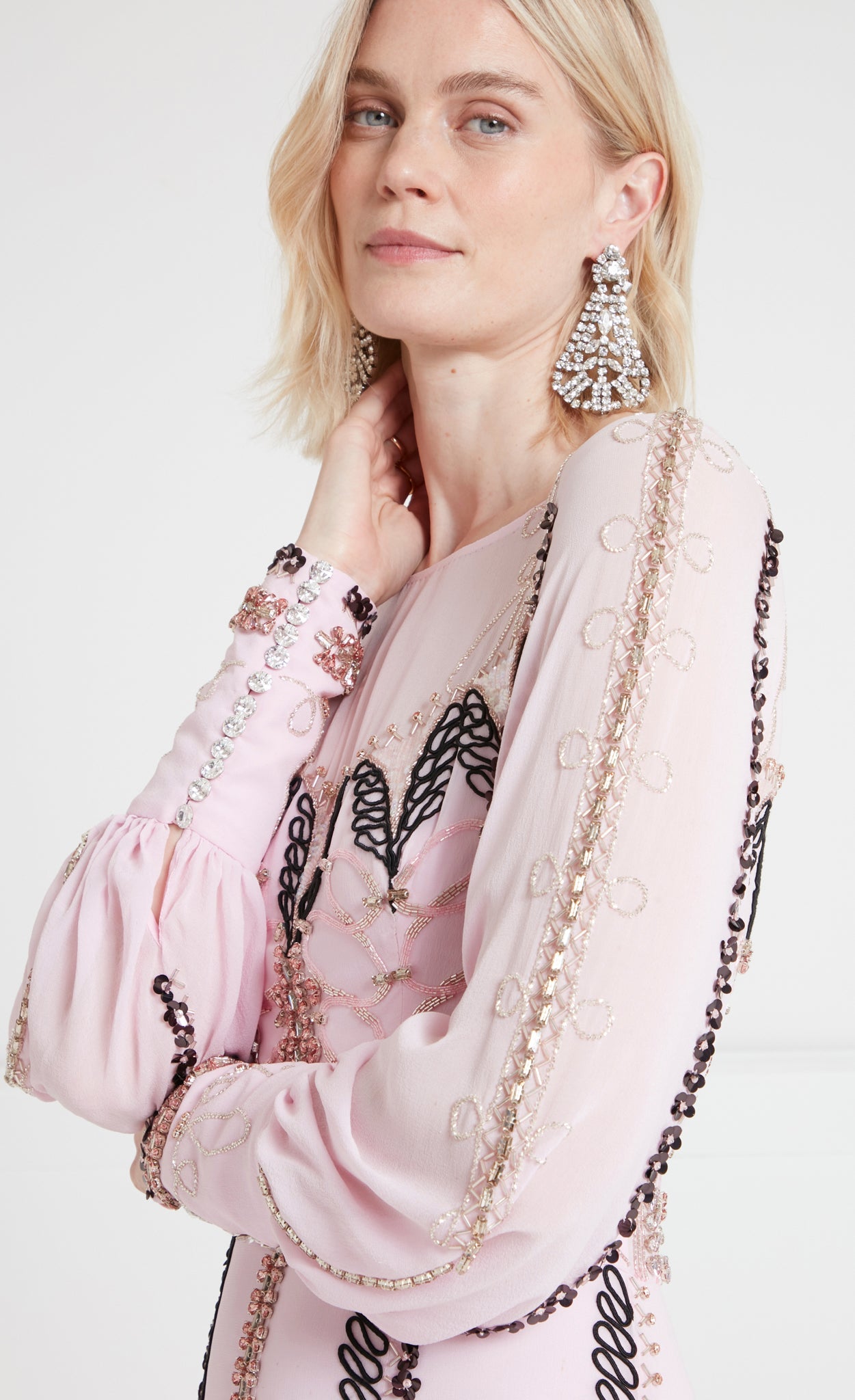 Intricate embellishments such as beading, stones, and cording create a refined engineered pattern for added opulence.