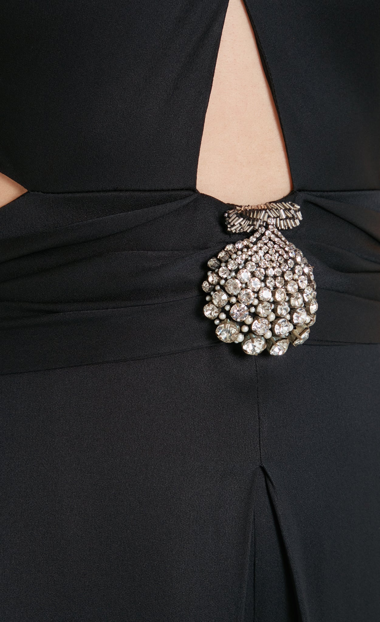 The Sofia Jumpsuit is a striking eveningwear alternative, featuring a flattering cross-over halter neckline with a statement crystal-embellished Seashell shaped brooch. The streamlined design with wide-leg trousers amplifies and flatters the silhouette while maintaining comfort and versatility.