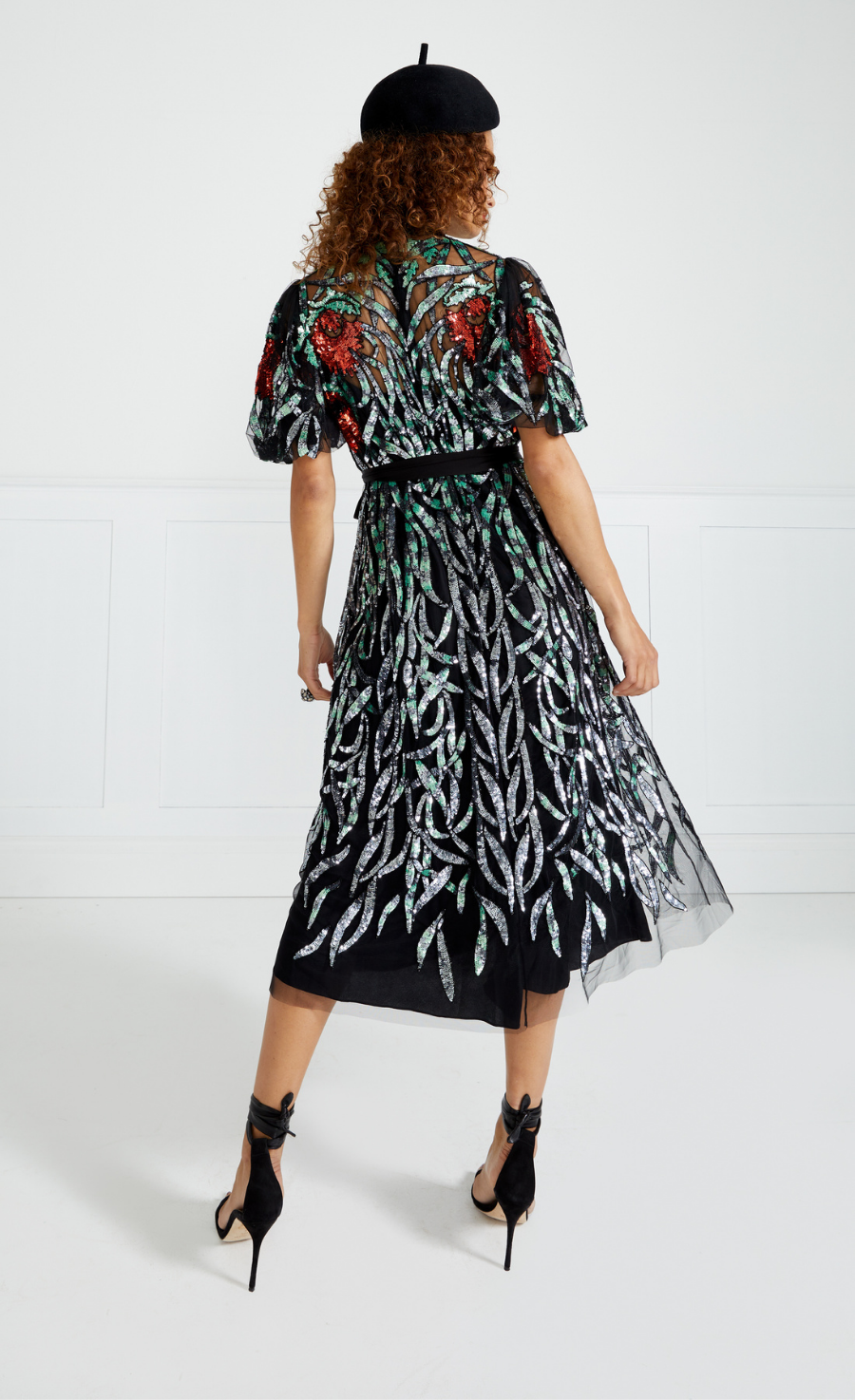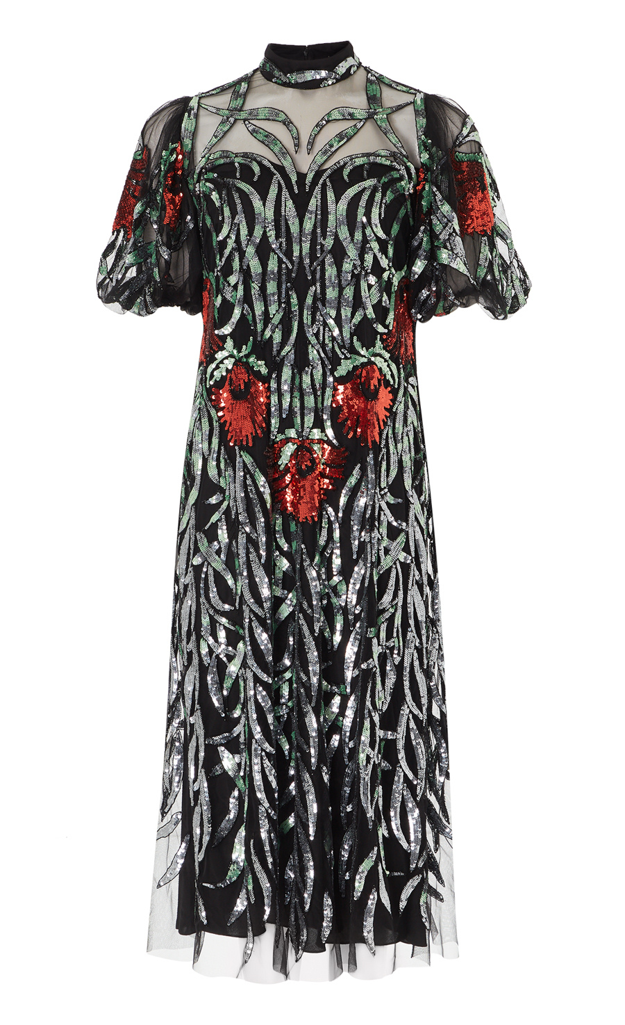 Tessellating, folding sequin foliage frames the figure to form this embellished cage-like effect on the soft Italian tulle that looks as though the embroidery is floating over the body. The graphic Uzbek florals weave into the enveloping leaves and are also used to border and line the body, to further the flattering effect of the painstakingly engineered embroidery. The dress is a perfect elegant choice, but please note it has a loose fit.