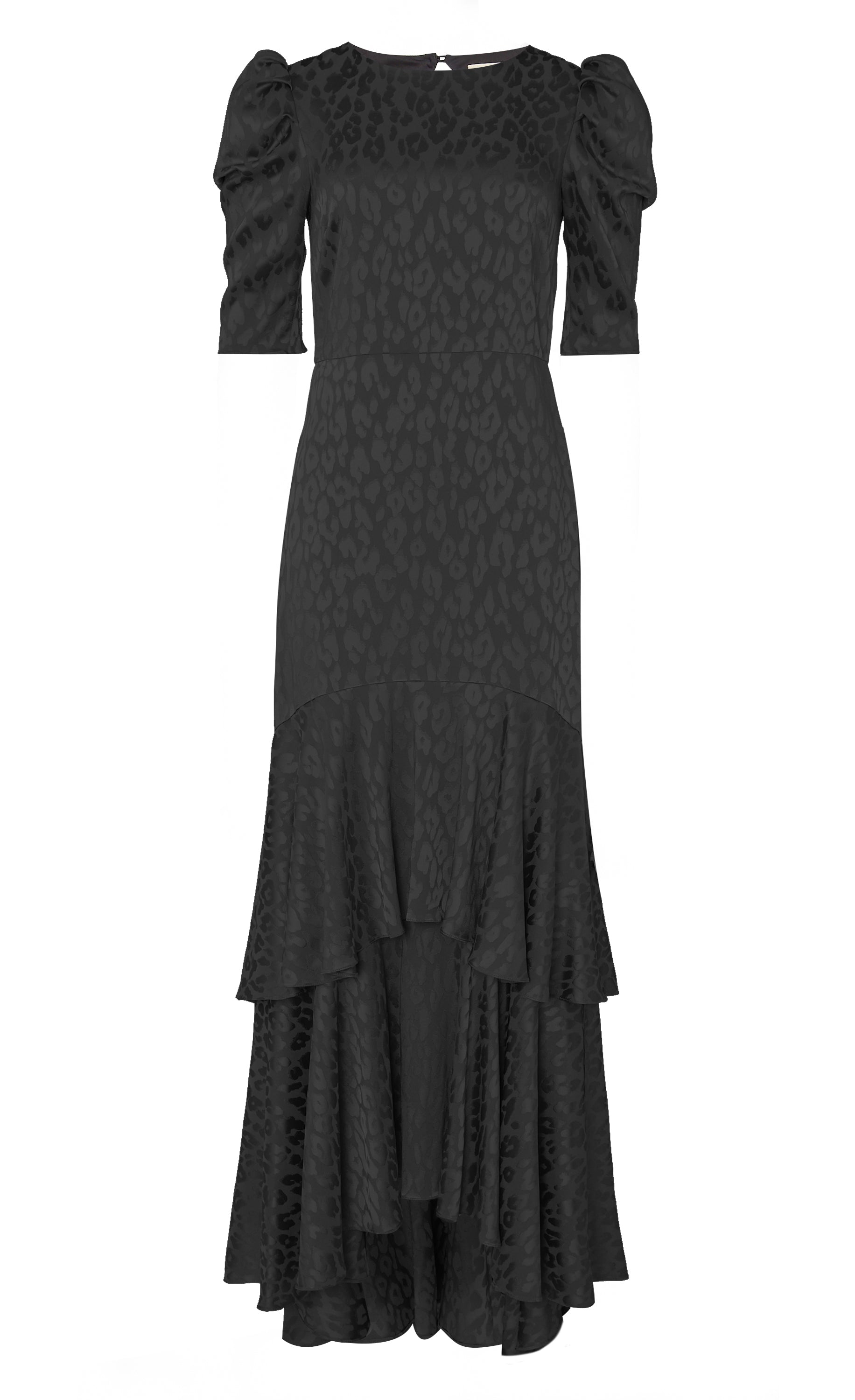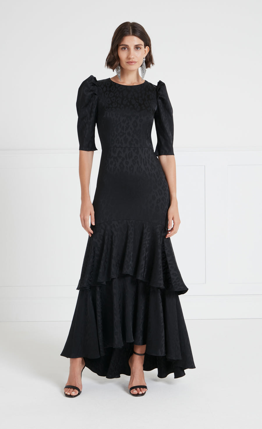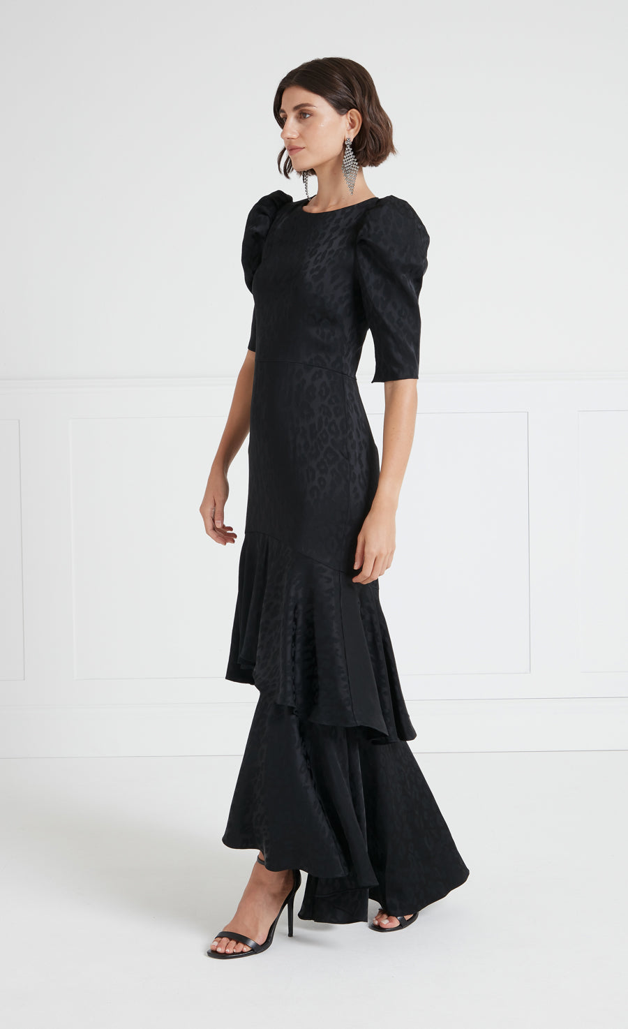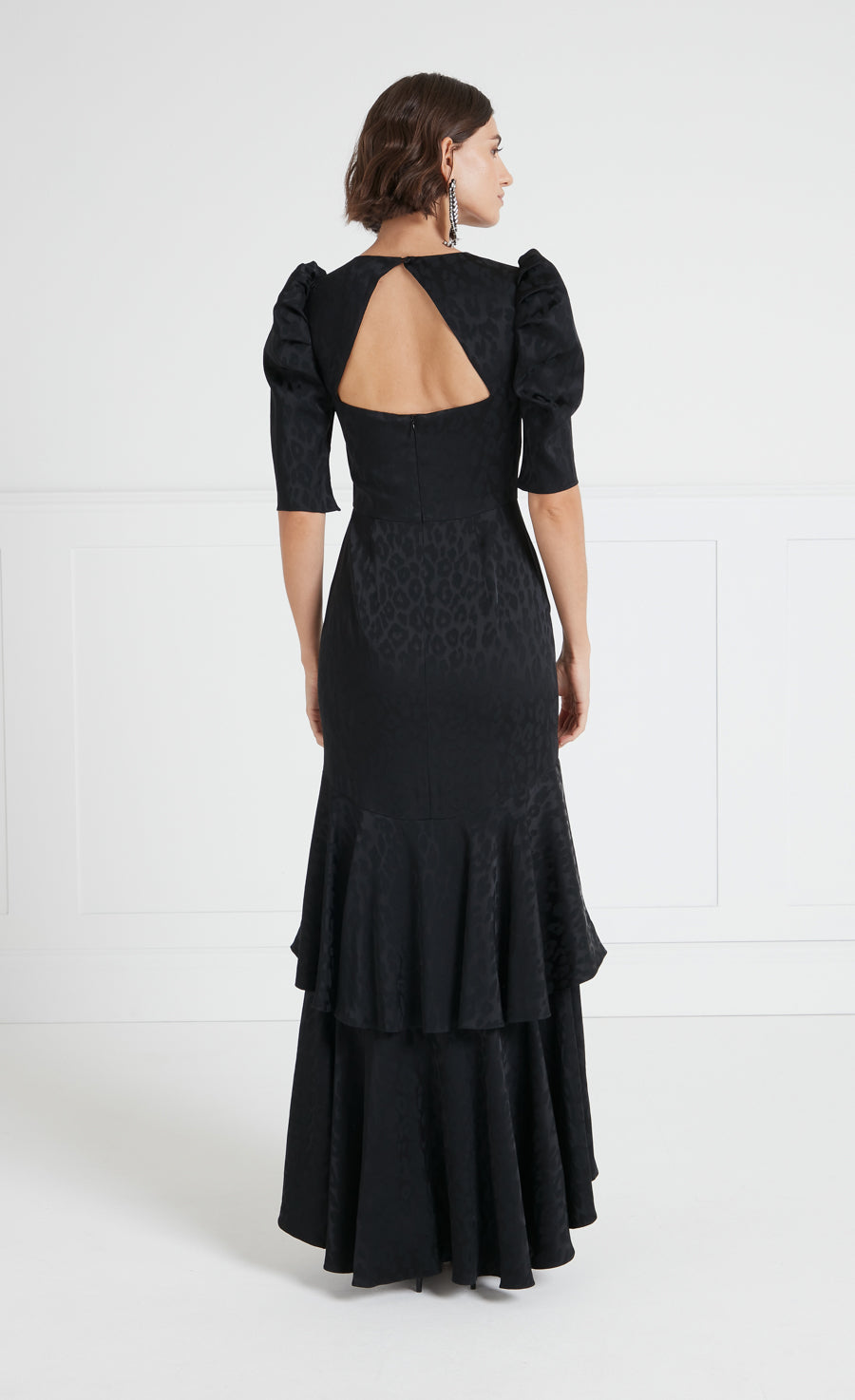 Commanding attention, the Willow dress is a picture of flamboyant elegance, playing with proportions: structured puff sleeves, a back cut-out with a cinched waist flowing to cascading tiers of bold ruffles.